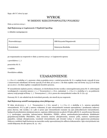 Sygn. akt I C 1610/13 upr. WYROK W IMIENIU RZECZYPOSPOLITEJ POLSKIEJ Dnia 4 czerwca 2014 r. Sąd Rejonowy w Legionowie I Wydział Cywilny w składzie następującym: Przewodniczący: SSR Krzysztof Stępniewski Protokolant: Katarzyna Besińska po rozpoznaniu na rozprawie w dniu 4 czerwca 2014 r. w Legionowie sprawy z powództwa (...) przeciwko M. O. o zapłatę Powództwo oddala. UZASADNIENIE (...) S.a r.l. z siedzibą w L. pozwem z dnia 9 grudnia 2013 r. wniósł przeciwko M. O. o zapłatę kwoty 1155,98 zł wraz z ustawowymi odsetkami od kwoty 940,85 zł od dnia 30.12.2011 r. do dnia zapłaty oraz od kwoty 215,13 zł od dnia 30.12.2011 r. do dnia zapłaty o zasądzenie kosztów procesu. W uzasadnieniu żądania pozwu, wskazano, że dochodzona kwota wynika z nieuregulowania przez M. O. zobowiązań wynikających z zawartej umowy z (...) Towarzystwo (...) S.A., natomiast (...) S.a r.l. z siedzibą w L. na podstawie umowy cesji przejął od firmy (...) Towarzystwo (...) S.A. prawa do wierzytelności wobec M. O. (k.1-3). Pozwany M. O. nie odniósł się do twierdzeń powoda, nie stawił się na rozprawie. Sąd Rejonowy ustalił następujący stan faktyczny: W dniu 26.06.2013 r. (...) Towarzystwo (...) S.A. zawarł z (...) S.a r.l. z siedzibą w L. umowę sprzedaży wierzytelności. W § 4 pkt 3 umowy wskazano, iż spis wierzytelności zostanie sporządzony i przekazany nabywcy przez zbywcę. Jak wynika z § 1 pkt c) przez spis wierzytelności rozumie się spis jednostkowych wierzytelności, będących przedmiotem niniejszej umowy, zapisany elektronicznie na płycie CD jako plik M. E. zaszyfrowany kluczem (...), zawierający nazwiska, imiona/nazwy dłużników, PESEL, adresy zamieszkania/prowadzenia działalności gospodarczej/siedziby Dłużników, daty zawarcia umowy ubezpieczenia, numery polis, numery rejestracyjne pojazdów, rodzaje ubezpieczenia, wysokość wierzytelności, jak również wykaz w wersji papierowej przekazany Nabywcy osobiście bądź kurierem na nazwisko osoby upoważnionej do odbioru dokumentów. Spis wierzytelności nie został dołączony do akt sprawy (k. 15 - 16.) Do akt sprawy przedłożono Częściowy Wykaz Wierzytelności w którym wskazano dane pozwanego, kwotę zobowiązania, rodzaj dokumentu, jego numer i datę dokumentu oraz płatności (k. 14) K. P. wystawił pismo – zawiadomienie skierowane do pozwanego, w którym poinformował go o umowie cesji (k. 13v.). Powyższy stan faktyczny Sąd ustalił w oparciu o dowody z dokumentów złożone do akt sprawy przez strony. Sąd zważył, co następuje: Powództwo nie zasługuje na uwzględnienie. Zgodnie z art. 6 k.c. ciężar udowodnienia faktu spoczywa na osobie, która z faktu tego wywodzi skutki prawne. Obowiązek przedstawienia dowodów spoczywa na stronach (art. 3 § 1 k.p.c.), a ciężar udowodnienia faktów mających dla rozstrzygnięcia sprawy istotne znaczenie (art. 227 k.p.c.) spoczywa na stronie, która z faktów tych wywodzi skutki prawne (art. 6 k.c.). Zatem powód powinien udowodnić okoliczności określone w art. 509 k.c. i art. 510 § 1 k.c. dotyczące elementów przedmiotowo istotnych umowy przelewu, jej ważności oraz skuteczności tej umowy. Po myśli art. 509 § 1 k.c. wierzyciel może bez zgody dłużnika przenieść wierzytelność na osobę trzecią (przelew), chyba że sprzeciwiałoby się to ustawie, zastrzeżeniu umownemu albo właściwości zobowiązania. Zgodnie z art. 510 § 1 k.c. umowa sprzedaży wierzytelności przenosi wierzytelność na nabywcę (...). Powód wskazał, iż na podstawie umowy sprzedaży wierzytelności nabył od (...) Towarzystwo (...) S.A. prawa do wierzytelności wobec zdefiniowanych w umowie dłużników. Z załączonej przez powoda umowy nie wynika jednak jakie wierzytelności, w jakiej wysokości i w stosunku do kogo zostały na ich podstawie zbyte. Na podstawie załączonych przez powoda dokumentów nie można stwierdzić, iż (...) Towarzystwo (...) S.A. zawarł z pozwanym jakąkolwiek umowę. Ponadto, podkreślenia wymaga, iż brak jest jakichkolwiek dowodów wskazujących na to, aby pośród zbytych wierzytelności znajdowała się również wierzytelność przysługująca (...) Towarzystwo (...) S.A. w stosunku do pozwanego. Co prawda powód załączył Częściowy Wykaz Wierzytelność do umowy o przelew wierzytelności z dnia 2013-06-26, w którym wskazane są dane pozwanego i kwota 940,85 zł, nie został on przez nikogo podpisany, nie jest także opatrzone żadną pieczątką, a więc nie stanowi on nawet dokumentu prywatnego w rozumieniu art. 245 k.p.c., zatem nie może stanowić dowodu z dokumentu w niniejszym postępowaniu. Pismo to nie jest także załącznikiem do umowy przelewu, jest to wyłącznie pismo samego powoda nie mający należytej wartości dowodowej, a zatem nie może stanowić dowodu przeniesienia opisanej w nim wierzytelności. Za niewystarczające w ocenie Sądu należy uznać także pismo - zawiadomienie skierowane do pozwanego przez K. P. (k. 13v.). Na podstawie dokumentów znajdujących się w aktach Sąd był w stanie ustalić jedynie, że w dniu 26.06.2012 r. zawarto umowę cesji nieokreślonych wierzytelności, jak również, że w nieustalonej dacie wystawiono – zawiadomienie do pozwanego o dokonanym przelewie wierzytelności. Nie wiadomo jednak czy wskazana w nocie obciążeniowej kwota odpowiada faktycznemu stanowi zadłużenia pozwanego, jeśli takie zadłużenie pozwany posiadał. Na marginesie już tylko wskazać należy, że nie przedłożono dowodu nadania pism, nie mówiąc o dowodzie jego doręczenia pozwanemu, a nadto brak jest dowodu wezwania nadanego przez pierwotnego wierzyciela, przy czym jak wynika z § 1 umowy sprzedaży wierzytelności z dnia 26.06.2013 r., nabywca jest świadomy i zgadza się z okolicznością, że zbywca nie posiada dowodów doręczenia dłużnikowi wezwania do zapłaty wierzytelności. Tym samym, w ocenie Sądu, strona powodowa nie przedstawiła żadnych dowodów na potwierdzenie ist
