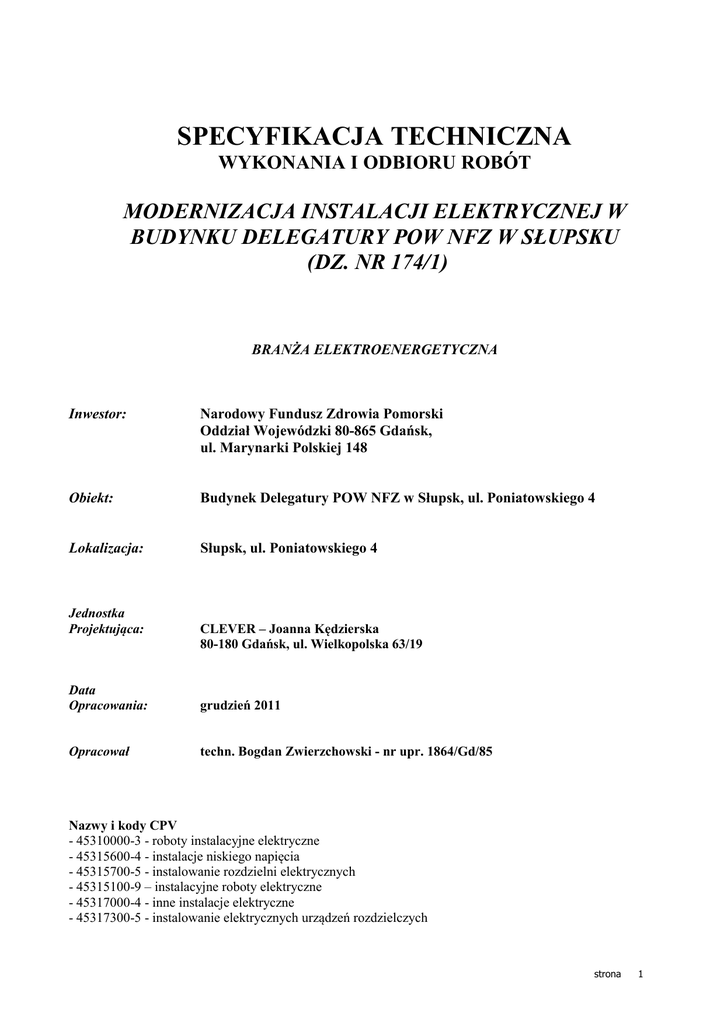 SPECYFIKACJA TECHNICZNA WYKONANIA I ODBIORU ROBÓT MODERNIZACJA INSTALACJI ELEKTRYCZNEJ W BUDYNKU DELEGATURY POW NFZ W SŁUPSKU (DZ. NR 174/1) BRANŻA ELEKTROENERGETYCZNA Inwestor: Narodowy Fundusz Zdrowia Pomorski Oddział Wojewódzki 80-865 Gdańsk, ul. Marynarki Polskiej 148 Obiekt: Budynek Delegatury POW NFZ w Słupsk, ul. Poniatowskiego 4 Lokalizacja: Słupsk, ul. Poniatowskiego 4 Jednostka Projektująca: CLEVER – Joanna Kędzierska 80-180 Gdańsk, ul. Wielkopolska 63/19 Data Opracowania: grudzień 2011 Opracował techn. Bogdan Zwierzchowski - nr upr. 1864/Gd/85 Nazwy i kody CPV - 45310000-3 - roboty instalacyjne elektryczne - 45315600-4 - instalacje niskiego napięcia - 45315700-5 - instalowanie rozdzielni elektrycznych - 45315100-9 – instalacyjne roboty elektryczne - 45317000-4 - inne instalacje elektryczne - 45317300-5 - instalowanie elektrycznych urządzeń rozdzielczych strona 1 Wstęp 1.1. Przedmiot Specyfikacji Technicznej Przedmiotem niniejszej Specyfikacji Technicznej są wymagania dotyczące wykonania i odbioru robót elektroenergetycznych w zakresie instalacji elektrycznych wewnętrznych obejmujących w szczególności wymagania właściwości materiałów, wymagania dotyczące sposobu wykonania i oceny prawidłowości poszczególnych robot. . 1.2 Zakres stosowania ST Niniejsza Specyfikacja jest podstawą do wykonawstwa robót elektrycznych. Sporządzona jest w celu przetargowym, przy zlecaniu i realizacji robót wymienionych w punkcie 1.1. Specyfikacja ta jest sporządzona na podstawie projektu wykonawczego opracowanego przez firmę Clever i opisuje rozwiązania techniczno materiałowe określone w powyższym projekcie. 2. Część ogólna 2.1 Zakres robót objętych Specyfikacją Techniczną Ustalenia zawarte w niniejszej Specyfikacji dotyczą zasad prowadzenia robót umożliwiających poprawne wykonanie i odbiór robót określonych w punkcie 1.1 obejmujących w swoim zakresie następujące roboty: - Wykonanie linii zasilających rozdzielnice piętrowe obiektu - Wymianę rozdzielnic piętrowych - Zasilenie obwodów odbiorczych - Instalacje gniazd wtykowych - Instalację opraw oświetleniowych - Wykonanie pomiarów sprawdzających - Ochrona od porażeń prądem elektrycznym Wymieniony zakres robot w istniejących pomieszczeniach będzie realizowany w powiązaniu z robotami budowlanymi i wykonywaniem instalacji innych branż, Prace wymagać będą wykonania przepustów instalacyjnych przez istniejące ściany i stropy, a po wykonaniu instalacji - zaprawienia bruzd, zagipsowania ubytków oraz malowania uzupełniającego uszkodzonych powierzchni ścian i sufitów. 2.2 Określenia podstawowe • Kabel - jest to przewód elektroenergetyczny o budowie przystosowanej do układania bezpośrednio w ziemi lub nad ziemią. • Linia kablowa - kabel wielożyłowy lub wiązka kabli jednożyłowych w układzie wielofazowym albo jedno- lub wielożyłowych kabli połączonych równolegle, łącznie z osprzętem, we wspólnym rowie kablowym lub przestrzeni i łączących urządzenia jedno- lub wielofazowe albo jedno- lub wielobiegunowe. • Ogranicznik przepięć – urządzenie do ochrony aparatury elektrycznej lub elektronicznej przed przepięciami. strona 2 • Oprawa oświetleniowa - urządzenie służące do rozdziału, filtracji i przekształcania strumienia świetlnego wysyłanego przez źródło światła, zawierające wszystkie niezbędne detale do przymocowania i połączenia z instalacją elektryczną. • Osłona kabla - konstrukcja przeznaczona do ochrony kabla przed uszkodzeniami mechanicznymi, chemicznymi i działaniem łuku elektrycznego. • Osprzęt linii kablowej - zbiór elementów przeznaczonych do łączenia, rozgałęzienia lub zakończenia kabli. Kanał instalacyjny – tworzywo PCV o stopniu ochrony IP 40 do rozprowadzenia przewodów zasilających, montaż n/t. • Tablice rozdzielcze i sterownicze – tablice wyposażone w urządzenia do włączania w obwody elektryczne, spełniające jedną lub więcej z następujących funkcji: zabezpieczenie, sterowanie, odłączanie i łączenie. • Wewnętrzna Linia Zasilająca (WLZ) – obwód elektryczny zasilający tablicę rozdzielczą. • Złącze – urządzenie elektroenergetyczne, w którym następuje połączenie wspólnej sieci elektrycznej o napięciu znamionowym do 1kV z instalacją odbiorczą bezpośrednio lub za pośrednictwem wewnętrznej linii zasilającej. Pozostałe określenia ujęte w niniejszej ST są zgodne z obowiązującymi Normami Technicznymi (PN i PNIEC), PBUE, Warunkami Technicznymi Wykonania i Odbioru Robót oraz określeniami podanymi w ST „Wymagania ogólne”. 2.3 Ogólne wymagania dotyczące robót Wykonawca robót jest odpowiedzialny za jakość wykonania robót oraz za zgodność z dokumentacją projektową i Specyfikacją Techniczną. Roboty montażowe należy wykonać zgodnie z Warunkami technicznymi wykonania o odbioru robót budowlano-montażowych, Polskimi Normami a także wytycznymi producenta materiałów i urządzeń. Roboty rozbiórkowe winny spełniać wymagania zawarte w rozporządzeniu MGPiB z dnia 15.12.1994r w sprawie warunków i toku postępowania przy rozbiórkach oraz ogólnie obowiązujące przepisy BHP. 3. MATERIAŁY 3.1 Uwagi ogólne Zastosowane urządzenia, osprzęt i materiały pomocnicze powinny być zgodne z podanymi w dokumentacji projektowej. Zastosowanie innych aniżeli wymienione w projekcie, dopuszczalne jest jedynie po wprowadzeniu zmian do dokumentacji projektowej. Zmiany i odstępstwa od dokumentacji nie mogą powodować obniżenia wartości funkcji i użytkowania oraz zmniejszenia trwałości eksploatacyjnej. Wszystkie materiały i urządzenia używane do realizacji zadania muszą posiadać niezbędne świadectwa, certyfikaty i aprobaty techniczne. 3.2 Magazynowanie materiałów na budowie strona 3 Z uwagi na rodzaj materiałów, powinny być one przechowywane w miejscach i warunkach odpowiednio do tego celu dostosowanych, przy zachowaniu zasad och