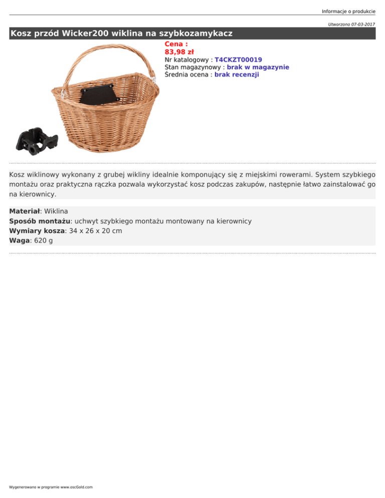 Informacje o produkcie Utworzono 07-03-2017 Kosz przód Wicker200 wiklina na szybkozamykacz Cena : 83,98 zł Nr katalogowy : T4CKZT00019 Stan magazynowy : brak w magazynie Średnia ocena : brak recenzji Kosz wiklinowy wykonany z grubej wikliny idealnie komponujący się z miejskimi rowerami. System szybkiego montażu oraz praktyczna rączka pozwala wykorzystać kosz podczas zakupów, następnie łatwo zainstalować go na kierownicy. Materiał: Wiklina Sposób montażu: uchwyt szybkiego montażu montowany na kierownicy Wymiary kosza: 34 x 26 x 20 cm Waga: 620 g Wygenerowano w programie www.oscGold.com