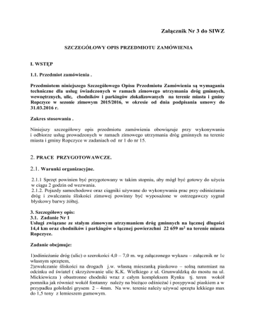 Załącznik Nr 3 do SIWZ SZCZEGÓŁOWY OPIS PRZEDMIOTU ZAMÓWIENIA I. WSTĘP 1.1. Przedmiot zamówienia . Przedmiotem niniejszego Szczegółowego Opisu Przedmiotu Zamówienia są wymagania techniczne dla usług świadczonych w ramach zimowego utrzymania dróg gminnych, wewnętrznych, ulic, chodników i parkingów zlokalizowanych na terenie miasta i gminy Ropczyce w sezonie zimowym 2015/2016, w okresie od dnia podpisania umowy do 31.03.2016 r. Zakres stosowania . Niniejszy szczegółowy opis przedmiotu zamówienia obowiązuje przy wykonywaniu i odbiorze usług prowadzonych w ramach zimowego utrzymania dróg gminnych na terenie miasta i gminy Ropczyce w zadaniach od nr 1 do nr 15. 2. PRACE PRZYGOTOWAWCZE. 2.1. Warunki organizacyjne. 2.1.1 Sprzęt powinien być przygotowany w takim stopniu, aby mógł być gotowy do użycia w ciągu 2 godzin od wezwania. 2.1.2. Pojazdy samochodowe oraz ciągniki używane do wykonywania prac przy odśnieżaniu dróg i zwalczaniu śliskości zimowej powinny być wyposażone w ostrzegawczy sygnał błyskowy barwy żółtej. 3. Szczegółowy opis: 3.1. Zadanie Nr 1 Usługi związane ze stałym zimowym utrzymaniem dróg gminnych na łącznej długości 14,4 km oraz chodników i parkingów o łącznej powierzchni 22 659 m2 na terenie miasta Ropczyce. Zadanie obejmuje: 1)odśnieżanie dróg (ulic) o szerokości 4,0 – 7,0 m. wg załączonego wykazu – załącznik nr 1c własnym sprzętem, 2)zwalczanie śliskości na drogach j.w. własną mieszanką piaskowo – solną natomiast na odcinku od świateł ( skrzyżowanie ulic K.K. Wielkiego z ul. Grunwaldzką do mostu na ul. Mickiewicza ) obustronne chodniki wraz z całym kompleksem Rynku tj. teren wokół pomnika jak również wokół fontanny należy na bieżąco odśnieżać i posypywać piaskiem a w przypadku gołoledzi grysem 2 – 4mm. Na ww. terenie należy używać sprzętu lekkiego max do 1,5 tony z lemieszem gumowym. 3)odśnieżanie i piaskowanie chodników, placów , parkingów i schodów zgodnie z podanym wykazem – załącznik nr 1d, a w przypadku przerwania akcji zimowej oczyszczanie chodników, placów i parkingów jak w sezonie letnim ( zał. nr 1a i 1b do opisu przedmiotu zamówienia – zamienne oczyszczanie), 4)po zakończeniu zimowego utrzymania dróg uporządkowanie zalegającego materiału uszarstniającego zarówno przy krawężniku jak też na chodnikach, placach i parkingach , 5)wywóz nieczystości ( opróżnianie koszy ulicznych znajdujących się na terenie miasta), 6)wywóz śniegu w okresie mocnych opadów , 7) utrzymanie drożności kanalizacji deszczowej w okresie prowadzonej akcji zimowego utrzymania , 8) oczyszczanie progów zwalniających z naboju śniegowego i lodu , 9) oczyszczenie osadników kratek ściekowych z piasku po zakończeniu akcji zimowego utrzymania . Do zwalczania śliskości należy przyjąć 3 % mieszankę piaskowo - solną natomiast na odcinkach gdzie spadki podłużne przekroczą 4% lub występują niebezpieczne skrzyżowania z drogami albo niebezpieczne łuki poziome należy użyć mieszanki z materiałami uszarstniającymi . Odśnieżanie dróg oraz piaskowanie należy wykonywać na całej szerokości jezdni, tylko w przypadku wystąpienia zjawisk atmosferycznych dopuszcza się występowanie luźnego śniegu do 4 godz. W formularzu oferty należy podać kwotę ryczałtową wynikającą z całości zamówienia tj. za okres 5 m.-cy ( netto i brutto ) natomiast w załączniku do oferty należy podać kwotę ryczałtową zimowego utrzymania za 1 m -c w rozbiciu na stawki za : odśnieżanie 1 km drogi piaskowanie 1 km drogi zimowe utrzymanie chodników, placów i parkingów wg wykazu za 1 m.-c zamienne oczyszczanie chodników, placów i parkingów wg wykazu jak w sezonie letnim wraz z wywozem nieczystości za 1 m.-c Miesięczne rozliczenie kwoty ryczałtowej do fakturowania odbywać się będzie na podstawie rzeczywistej ilości przepracowanych dni ( w odniesieniu do 30 dni ) odpowiednio do rodzaju świadczonej usługi potwierdzonej przez Zamawiającego . Technologia i zakres oczyszczania winny spełniać wymogi ustawy o utrzymaniu czystości i porządku w gminach z 13 września 1996 r. ( Dz. U. Nr 132 poz. 622 ) oraz Regulaminu utrzymania czystości i porządku ustalony w Uchwale Nr LVIII/617/14 Rady Miejskiej z dnia 26.09.2014 r. 3.2. Zadanie Nr 2 Usługi związane ze stałym zimowym utrzymaniem dróg gminnych i ulic zlokalizowanych na terenie miasta i gminy Ropczyce na łącznej długości 22,20 km Zadanie obejmuje : 1. odśnieżanie drogi o szerokości od 4,0 do 6,0m. na odcinku o długości łącznej 18,20 km własnym sprzętem wg załączonego wykazu – załącznik nr 2 2. zwalczanie śliskości na drodze j.w. własną mieszanką piaskowo – solną Do zwalczania śliskości należy przyjąć 3% mieszankę piaskowo - solną natomiast na odcinkach gdzie spadki podłużne przekroczą 4% lub występują niebezpieczne skrzyżowania z drogami albo niebezpieczne łuki poziome należy użyć mieszanki z materiałami uszarstniającymi . Odśnieżanie drogi należy wykonywać na całej szerokości jezdni, tylko w przypadku wystąpienia zjawisk atmosferycznych dopuszcza się występowanie luźnego śniegu do 4 godz. W załączniku do oferty należy podać kwotę za zimowe utrzymanie 18,20 km w rozbiciu na stawkę za : Jednoczesne odśnieżanie i zwalczanie śliskości za 1 godzinę pracy . Miesięczne rozliczenie kwoty do fakturowania odbywać się będzie na podstawie rzeczywistej ilości przepracowanych godzin ( miesięcznie ) potwierdzonych przez Zamawiającego . 3.3. Zadanie Nr 3 Usługi związane ze stałym zimowym utrzymaniem dróg gminnych ( ulic ) znajdujących się na terenie miasta i gminy Ropczyce objętych stałym zimowym utrzymaniem na długości 8,085 km . Zadanie obejmuje : 1. odśnieżanie drogi o szerokości od 6,00 m do 10,0 m. na odcinku o długości łącznej 8,085 km własnym sprzętem wg załączonego wykazu – załącznik nr 3, odśnieżanie ch