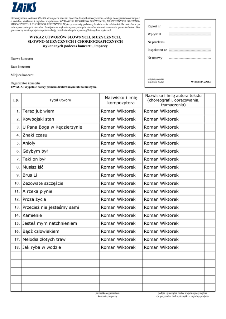 Stowarzyszenie Autorów ZAiKS, działając w imieniu twórców, których utwory chroni, apeluje do organizatorów imprez o rzetelne, dokładne i czytelne wypełnianie WYKAZÓW UTWORÓW SŁOWNYCH, MUZYCZNYCH, SŁOWNOMUZYCZNYCH I CHOREOGRAFICZNYCH. Wykazy stanowią podstawę do obliczenia należności dla twórców z tytułu wykorzystanych utworów. Pomijanie w wykazie wykorzystanych utworów stanowi naruszenie prawa twórców. Organizatorzy swoim podpisem potwierdzają rzetelność danych wyszczególnionych w wykazach. WYKAZ UTWORÓW SŁOWNYCH, MUZYCZNYCH, SŁOWNO-MUZYCZNYCH I CHOREOGRAFICZNYCH wykonanych podczas koncertu, imprezy Raport nr ................................................. Wpływ zł ................................................. Nr przelewu ................................................. Inspektorat nr ................................................. Nr umowy Nazwa koncertu ................................................. Data koncertu Miejsce koncertu podpis i pieczątka inspektora ZAiKS Organizator koncertu WYPEŁNIA ZAiKS UWAGA: Wypełnić należy pismem drukowanym lub na maszynie. L.p. Tytuł utworu Nazwisko i imię kompozytora Nazwisko i imię autora tekstu (choreografii, opracowania, tłumaczenia) 1. Teraz już wiem Roman Wiktorek Roman Wiktorek 2. Kowbojski stan Roman Wiktorek Roman Wiktorek 3. U Pana Boga w Kędzierzynie Roman Wiktorek Roman Wiktorek 4. Znaki czasu Roman Wiktorek Roman Wiktorek 5. Anioły Roman Wiktorek Roman Wiktorek 6. Gdybym był Roman Wiktorek Roman Wiktorek 7. Taki on był Roman Wiktorek Roman Wiktorek 8. Musisz iść Roman Wiktorek Roman Wiktorek 9. Brus Li Roman Wiktorek Roman Wiktorek 10. Zezowate szczęście Roman Wiktorek Roman Wiktorek 11. A rzeka płynie Roman Wiktorek Roman Wiktorek 12. Proza życia Roman Wiktorek Roman Wiktorek 13. Przecież nie jesteśmy sami Roman Wiktorek Roman Wiktorek 14. Kamienie Roman Wiktorek Roman Wiktorek 15. Jesteś mym natchnieniem Roman Wiktorek Roman Wiktorek 16. Bądź człowiekiem Roman Wiktorek Roman Wiktorek 17. Melodia złotych traw Roman Wiktorek Roman Wiktorek 18. Jak ryba w wodzie Roman Wiktorek Roman Wiktorek pieczątka organizatora koncertu, imprezy podpis i pieczątka osoby wypełniającej wykaz (w przypadku braku pieczątki – czytelny podpis)