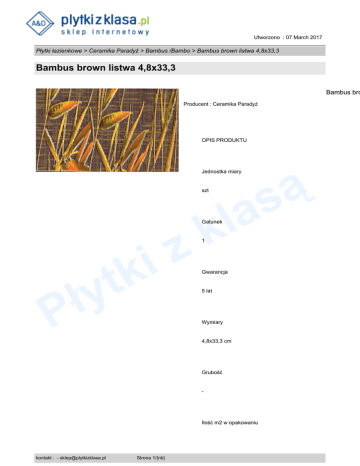 Utworzono : 07 March 2017 Płytki łazienkowe > Ceramika Paradyż > Bambus /Bambo > Bambus brown listwa 4,8x33,3 Bambus brown listwa 4,8x33,3 Bambus bro Producent : Ceramika Paradyż OPIS PRODUKTU ą s la Jednostka miary szt k z Gatunek i tk y ł P 1 Gwarancja 5 lat Wymiary 4,8x33,3 cm Grubość - Ilość m2 w opakowaniu kontakt : - [email protected] Strona 1/{nb} Utworzono : 07 March 2017 Płytki łazienkowe > Ceramika Paradyż > Bambus /Bambo > Bambus brown listwa 4,8x33,3 Bambus brown listwa 4,8x33,3 0,52 Ilość sztuk w opakowaniu 32 Rodzaj Listwa ą s la Zastosowanie k z Wewnątrz i tk y ł P Pomieszczenia Łazienka Powierzchnia - Mrozoodporność Nie Klasa ścieralności Nie dotyczy Waga opakowania / 1 sztuki 7,75 kg / 0,24 kg Podana cena dotyczy 1 sztuki Sprzedaż produktu Produkt sprzedawany na sztuki kontakt : - [email protected] Strona 2/{nb} Utworzono : 07 March 2017 Płytki łazienkowe > Ceramika Paradyż > Bambus /Bambo > Bambus brown listwa 4,8x33,3 Bambus brown listwa 4,8x33,3 Cena : 10,19 zł Brutto ( 8,28 zł Netto) ą s la Dostępność: Produkt dostępny w naszym sklepie od 08 September 2013 i tk y ł P kontakt : - [email protected] Strona 3/{nb} k z