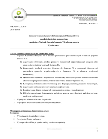 Warszawa, 2016-10-11 WKPS.0413.1.2016 2016-11978 Dyrektor Centrum Systemów Informacyjnych Ochrony Zdrowia poszukuje kandydata na stanowisko: Analityka w Wydziale Rozwoju Systemów Teleinformatycznych Wymiar etatu: 1 Zakres zadań wykonywanych na stanowisku pracy: 1. Wsparcie Kierownika Projektu P1 w zakresie prowadzenia prac analitycznych w ramach projektu poprzez m.in.: 1) Zapewnienie utrzymania modelu procesów biznesowych odpowiadających usługom jakie mają zostać wdrożone w ramach Systemu P1, 2) Zapewnienie korelacji procesów biznesowych Systemu P1 z procesami biznesowymi pozostałych systemów współpracujących z Systemem P1, w obszarze wzajemnej komunikacji, 3) Opracowanie wspólnie z zespołem ds. architektury ram wykorzystania metody szacowania złożoności oprogramowania na potrzeby szacowania zmian w Systemie P1, 4) Koordynacja techniczna sposobu realizacji prac dotyczących analizy procesów biznesowych, 5) Zapewnienie spójności procesów analizy i projektowania, 6) Podejmowanie działań związanych z zarządzaniem zmianą i zagadnieniami. 7) Udział w pracach nad dokumentacją techniczną wraz ze specyfikacjami technicznymi oraz modelami analitycznymi. 2. Współpraca z interesariuszami Projektu P1. 3. Współpraca z wykonawcami zewnętrznymi Projektu P1. Wymagania związane ze stanowiskiem pracy: konieczne: 1. Wykształcenie średnie lub wyższe. 2. Co najmniej 2-letni staż pracy. 3. Wymagane kwalifikacje zgodne z niżej zamieszczoną tabelą. 1 stanowisko wykształcenie liczba wymaganych lat pracy Analityk wyższe średnie 2 4 pożądane: 1. Wykonywał analizę systemową w co najmniej jednym projekcie dotyczącym informatycznego wsparcia procesów biznesowych realizowanych w obszarze ochrony zdrowia. 2. Posiada co najmniej 2 letnie doświadczenie zawodowe w zakresie modelowania i inżynierii procesów biznesowych oraz specyfikacji wymagań dla systemów informatycznych z wykorzystaniem UML. 3. Posiada znajomość systemu informacji w ochronie zdrowia określonego w przepisach prawa. 4. Doświadczenie w zakresie realizacji projektów informatycznych w ochronie zdrowia. 5. Komunikatywna znajomość języka angielskiego. 6. Umiejętność pracy pod presją czasu. 7. Sumienność i zaangażowanie. Wymagane dokumenty i oświadczenia: 1. Kopie dokumentów potwierdzających wykształcenie i kwalifikacje zawodowe. 2. Kopie dokumentów potwierdzających przebieg dotychczasowego zatrudnienia. 3. List motywacyjny oraz informacje, o których mowa w art. 221 § 1 ustawy z dnia 26 czerwca 1974 r. Kodeks pracy (t. j. Dz. U. z 2014 r. poz. 1502 z późn. zm.) tj. imię (imiona) i nazwisko, imiona rodziców, datę urodzenia, miejsce zamieszkania (adres do korespondencji), wykształcenie, przebieg dotychczasowego zatrudnienia. Miejsce składania dokumentów: Dokumenty aplikacyjne przyjmowane są: a) w postaci elektronicznej: - za pośrednictwem poczty elektronicznej pod adresem [email protected] , lub - poprzez przekazanie za pośrednictwem ESP ePUAP (formularz dostępny na stronie internetowej: www.csioz.gov.pl , zakładka: praca), lub 2 b) w postaci papierowej: w kancelarii Centrum pod adresem 00-184 Warszawa, ul. Stanisława Dubois 5A. Dodatkowe informacje pod nr telefonu (22) 597-09-45 Termin składania dokumentów: do 15 listopada 2016 r. Inne informacje: Centrum zastrzega sobie prawo do przeprowadzenia rozmowy z wybranymi kandydatami. Zgodnie z art. 24 ust. 1 ustawy z dnia 29 sierpnia 1997 r. o ochronie danych osobowych (Dz. U. z 2016 r. poz. 922) informuję, iż administratorem danych jest Centrum Systemów Informacyjnych Ochrony Zdrowia, ul. Stanisława Dubois 5A, 00-184 Warszawa. Przedmiotowe dane osobowe są zbierane w celu niezbędnym dla realizowanych procesów rekrutacyjnych. Obowiązek ich podania wynika z przepisów ustawy z dnia 26 czerwca 1974 r. Kodeks pracy (Dz. U. z 2014 poz. 1502, z późn. zm.) oraz wydanych na jej podstawie aktów wykonawczych. Każda osoba ma prawo dostępu do treści swoich danych oraz ich poprawiania. WKPS.OP.WRST.78.2016 3