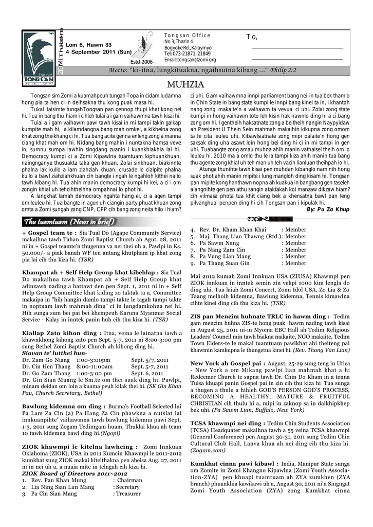 ZOMI Thukizakna Lom 6, Hawm 33 4 September 2011 (Sun) Estd-2006 Tongsan Office No 3, Thazin 4 Bogyoke Rd., Kalaymyo Tel: 073-21871; 21849 Email: [email protected] To, Motto: "ki-itna, lungkituakna, ngaihsutna kibang ..." Philip 2:2 MUHZIA Tongsan sim Zomi a kuamahpeuh tungah Topa in cidam ludamna hong pia ta hen ci in deihsakna thu kong puak masa hi. Tukal laisimte tungahTongsan pan gennop thupi khat kong nei hi. Tua in bang thu hiam i cihleh tulai a i gam vaihawmna tawh kisai hi. Tulai a i gam vaihawm pawl tawh kisai in mi tampi takin galkap kumpite mah hi, a kilamdangna bang mah omkei, a kikhelna zong khat zong theikhang ci hi. Tua bang acite genna enleng zong a manna ciang khat mah om hi. Nidang bang mahin i nuntakna hamsa veve in, sumnu sumpa lawhin singdang zuanin i kuankhiakhia lai hi. Democracy kumpi ci a Zomi Kipawlna tuamtuam kiphuankhuan, naingnganye thusuakta taka gen khuan, Zolai sinkhuan, biakinnte phalna lak kullo a lam ziahziah khuan, crusade le cialpite phalna kullo a bawl ziahziahkhuan cih bangte i ngah le ngahloh kithei nailo tawh kibang hi. Tua ahih manin democracy kumpi hi kei, a ci i om zongin khial uh tehcihtheihna ompahnai lo phot hi. A langkhat lamah democracy ngahta hang ei, ci a agen tampi om leuleu hi. Tua bangte in agen uh ciangin party phuat khuan zong omta a Zomi sungah zong CNP, CPP cih bang zong neita hilo i hiam? ci uhi. Gam vaihawmna innpi parliament bang nei-in tua bek thamlo in Chin State in bang state kumpi le innpi bang kinei ta in, i khantoh nang zong makaite’n a vaihawm ta vevua ci uhi. Zolai zong state kumpi in hong vaihawm toto leh kisin hak nawnlo ding hi a ci bang zong om hi. I gentheih haksatnate zong a beitheih nangin Naypyidaw ah President U Thein Sein mahmah makaihin kikupna zong omom ta hi cita leuleu uhi. Kibawlsiatnate zong mipi palaite’n hong gen saksak ding uha asawt loin hong bei ding hi ci in mi tampi in gen uhi. Tuabangte zong amau muhna ahih manin vathalsel theih om lo leuleu hi. 2010 ma a omlo thu le la tampi kiza ahih manin tua bang thu agente zong khial uh teh man uh teh vacih lianluan theihpah lo hi. Atunga thunihte tawh kisai pen muhdan kibanglo nam nih hong suak phot ahih manin mipite i lung mangloh ding kisam hi. Tongsan pan mipite kong hanthawn nopna ah kuakua in bangbang gen taseleh alangnihte gen pen athu sangin ataktakah koi manzaw dikzaw hiam? cih vilmasa phota tua khit ciang bek a khensatna bawl pan leng pilvanghuai penpen ding hi cih Tongsan pan i kipulak hi. By: Pu Zo Khup + Gospel team te : Sia Tual Do (Agape Community Service) makaihna tawh Tahan Zomi Baptist Church ah Agut. 28, 2011 ni in + Gospel teamte'n thugenna va nei thei uh a, Pawlpi in Ks. 50,000/- a piak banah WF ten antang khutpham ip khat zong pia lai cih thu kiza hi. (TSR) 4. 5. 6. 7. 8. 9. Khampat ah + Self Help Group khat kibehlap : Sia Tual Do makaihna tawh Khampat ah + Self Help Group khat adinzawh nading a hattawt den pen Sept. 1, 2011 ni in + Self Help Group Committee khat kiding zo taktak ta a, Committee makaipa in "hih hangin damlo tampi takte le tagah tampi takte in noptuam lawh mahmah ding" ci in lungdamkohna nei hi. Hih sunga sum bei pai bei khempeuh Karuna Myanmar Social Service - Kalay in inntek panin huh cih thu kiza hi. (TSR) Kiallap Zato kihon ding : Itna, veina le lainatna tawh a khawnkhong kihong zato pen Sept. 5-7, 2011 ni 8:00-3:00 pm sung Bethel Zomi Baptist Church ah kihong ding hi. Siavan te' lutthei hunDr. Zam Go Niang 1:00-3:00pm Sept. 5/7, 2011 Dr. Cin Hen Thang 8:00-11:00am Sept. 5-7, 2011 Dr. Go Zam Thang 1:00-3:00 pm Sept. 6, 2011 Dr. Gin Sian Muang le Sm.te om thei suak ding hi. Pawlpi, minam deidan om loin a kuama peuh kilak thei hi. (SK Gin Khan Pau, Church Secretary, Bethel) Bawlung kidemna om ding : Burma's Football Selected lui Pa Lam Za Cin (a) Pa Hang Za Cin phawkna a nutsiat lai innkuanpihte' vaihawmna tawh bawlung kidemna pawi Sept. 1-3, 2011 sung Zogam Tedimgam huam, Thuklai khua ah team 10 tawh kidemna bawl ding hi.(Ngopi) ZIOK khawmpi le kitelna lawhcing : Zomi Innkuan Oklahoma (ZIOK), USA in 2011 Kumcin Khawmpi le 2011-2012 kumkhat sung ZIOK makai kitelthakna pen abeisa Aug. 27, 2011 ni in nei uh a, a nuaia mite in telngah cih kiza hi. ZIOK Board of Directors 2011~2012 1. Rev. Pau Khan Mung : Chairman 2. Lia Ning Sian Lun Mang : Secretary 3. Pa Cin Sian Mang : Treasurer Rev. Dr. Kham Khan Khai : Maj. Thang Lian Thawng (Rtd.): Pa Sawm Nang : Pa Nang Zam Cin : Pa Vung Lian Mang : Pa Thang Suan Gin : Member Member Member Member Member Member Mai 2012 kumah Zomi Innkuan USA (ZIUSA) Khawmpi pen ZIOK innkuan in inntek semin zin vekpi 1000 kim lengla do ding uhi. Tua laiah Zomi Concert, Zomi Idol USA, Zo Lia & Zo Taang melhoih kidemna, Bawlung kidemna, Tennis kimawlna cihte kinei ding cih thu kiza hi. (TSR) ZIS pan Mencim huhnate TRLC in hawm ding : Tedim gam mencim huhna ZIS-te hong puak hawm nading tawh kisai in August 25, 2011 ni-in Myoma EBC Hall ah Tedim Religious Leaders’ Council min tawh biakna makaite, NGO makaite, Tedim Town Elders-te le makai tuamtuam pawlkhat ahi theiteng pai khawmin kamkupna le thungetna kinei hi. (Rev. Thang Van Lian) New York ah Gospel pai : August, 25-29 sung teng in Utica - New York a om Mikang pawlpi lian mahmah khat a hi Redeemer Church te sapna tawh Dr. Chin Do Kham in a tenna Tulsa khuapi panin Gospel pai in zin cih thu kiza hi Tua sunga a thugen a thulu a hihleh GOD’S PERSON GOD’S PROCESS, BECOMING A HEALTHY, MATURE & FRUITFUL CHRISTIAN cih thulu hi a, mipi in zaknop sa in daikhipkhep bek uhi. (Pa Sawm Lian, Buffalo, New York) TCSA khawmpi nei ding : Tedim Chin Students Association (TCSA) Headquater makaihna tawh a 55 veina TCSA khawmpi (General Conference) pen August 30-31, 2011 sung Tedim Chin Cultural Club Hall, Lanva khua ah nei ding cih thu kiza hi. (Zogam.com) Kumkhat cinna pawi kibawl : India, Manipur State sunga om Zomite in Zomi Khangno Kipawlna (Zomi Youth Association-ZYA) pen khuapi tuamtuam ah ZYA zumkhen (ZYA branch) phuankhia kawikawi uh a, August 30, 2011 