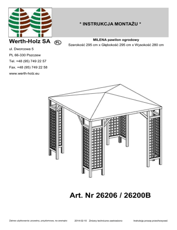 * INSTRUKCJA MONTAŻU * Werth-Holz SA PL MILENA pawilon ogrodowy Szerokość 295 cm x Głębokość 295 cm x Wysokość 280 cm ul. Dworcowa 5 PL 66-330 Pszczew Tel. +48 (95) 749 22 57 Fax. +48 (95) 749 22 58 www.werth-holz.eu Art. Nr 26206 / 26200B Zakres użytkowania: prywatny, przydomowa, na zewnątrz 2014-02-10 Zmiany techniczne zastrzeżono Instrukcję proszę przechowywać Szanowny Kliencie, przed przystąpieniem do montażu należy zapoznać się z niniejszą instrukcją. Przed montażem należy przygotować wymagane narzędzia przeznaczone do montażu elementów złącznych wymienionych w liście pakowej i skontrolować załączone elementy pod kątem kompletności. Pawilon ogrodowy jest wyrobem przeznaczonym do ochrony przed słońcem i/lub deszczem. Produkt przeznaczony jest wyłącznie do użytku na wolnym powietrzu, do użytku prywatnego. Jest impregnowany ciśnieniowo środkiem bezchromowym, bezpiecznym i nie wywołującym alergii, ani zmian skórnych. Impregnacja zabezpiecza wyrób przed niekorzystnym oddziaływaniem grzybów, pleśni i sinizny powodujących deprecjację drewna. Produkt wykonany jest w głównej mierze z drewna iglastego. Podczas codziennej eksploatacji narażony jest on szczególnie na działanie wilgoci, różnic temperatur, promieni UV, glonów, grzybów itp. Czynniki te mogą niekorzystnie wpływać zarówno na wytrzymałość, jak i wygląd produktu. W celu zabezpieczenia wyrobu przed działaniem w/w czynników zalecana jest konserwacja elementów drewnianych za pomocą środków przeznaczonych do tych celów dostępnych na rynku. Brak dokonywania regularnych przeglądów oraz konserwacji może spowodować przewrócenie produktu lub powstanie innego rodzaju zagrożenia. Produkt należy montować zgodnie z załączoną instrukcją montażową przygotowaną przez producenta. Produkt musi być przytwierdzony do podłoża, np. za pomocą kotew (kotwy nie wchodzą w skład zestawu). Po montażu należy dokonać przeglądu głównych części produktu, a także powtarzać przegląd w regularnych odstępach czasu, w zależności od intensywności użytkowania (w szczególności jednak na początku sezonu). Przeglądu stanu konserwacji elementów drewnianych, szczególnie elementów nośnych oraz mających bezpośredni kontakt z podłożem, należy dokonywać przynajmniej raz w sezonie. W razie konieczności wskazane jest, aby elementy drewniane dodatkowo zabezpieczyć. Ponadto należy dokonywać przeglądów elementów złącznych w produkcie. Wkręty i śruby muszą być okresowo sprawdzane i dokręcane. W razie stwierdzenia uszkodzenia mogącego stwarzać jakiekolwiek niebezpieczeństwo, uszkodzony element należy wymienić. Producent nie ponosi odpowiedzialności za wszelkie wypadki, zdarzenia oraz uszkodzenia produktu powstałe w wyniku montażu niezgodnego z instrukcją montażową i/lub ingerencji użytkownika w konstrukcję produktu oraz użytkowania produktu niezgodnie z jego przeznaczeniem. Stosowanie się do wskazówek oraz zaleceń zawartych w instrukcji pozwoli na długie lata cieszyć się eksploatacją zakupionego produktu oraz zapewni jego bezpieczne użytkowanie. Uwaga: W celu uniknięcia pęknięć drewna podczas montażu, przed wkręceniem elementów złącznych należy wywiercić otwory. Poz. Element Wymiary [cm] Liczba 230x58x7 4 230x53x7 4 7x7x295 4 7x7x200 4 7x7x30 1 7x7x45 8 ‐‐‐‐‐ 1 4x50mm 16 1 2 3 4 5 6 7 A B 5x70mm 8 C 5x90mm 20 5x100mm 8 6x120mm 20 4x40mm 28 6/18mm 28 D E F G 1 x4 2 C 5x90mm (4 x 1 szt.) 4 B 5x70mm (4 x 2 szt.) 5 1 3 D 5x100mm (4 x 2 szt.) A 2 4x50mm (4 szt.) ! 3 4 D UWAGA! 3 Element nr 5 służy do napinania pokrycia dachowego. Przed przykręceniem elementu na stałe, należy odpowiednio go wysunąć, aby pokrycie dachowe było napięte. 3 C 4 7 5x90mm (8 x 2 szt.) 6 E 6x120mm (4 x 5 szt.) 7 G 6/18mm (28 szt.) F 4x40mm (28 szt.)