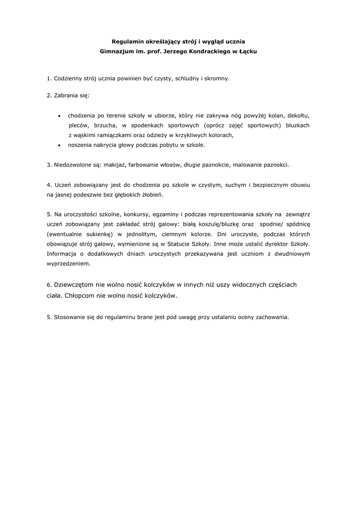 Regulamin określający strój i wygląd ucznia Gimnazjum im. prof. Jerzego Kondrackiego w Łącku 1. Codzienny strój ucznia powinien być czysty, schludny i skromny. 2. Zabrania się: chodzenia po terenie szkoły w ubiorze, który nie zakrywa nóg powyżej kolan, dekoltu, pleców, brzucha, w spodenkach sportowych (oprócz zajęć sportowych) bluzkach z wąskimi ramiączkami oraz odzieży w krzykliwych kolorach, noszenia nakrycia głowy podczas pobytu w szkole. 3. Niedozwolone są: makijaż, farbowanie włosów, długie paznokcie, malowanie paznokci. 4. Uczeń zobowiązany jest do chodzenia po szkole w czystym, suchym i bezpiecznym obuwiu na jasnej podeszwie bez głębokich żłobień. 5. Na uroczystości szkolne, konkursy, egzaminy i podczas reprezentowania szkoły na zewnątrz uczeń zobowiązany jest zakładać strój galowy: białą koszulę/bluzkę oraz spodnie/ spódnicę (ewentualnie sukienkę) w jednolitym, ciemnym kolorze. Dni uroczyste, podczas których obowiązuje strój galowy, wymienione są w Statucie Szkoły. Inne może ustalić dyrektor Szkoły. Informacja o dodatkowych dniach uroczystych przekazywana jest uczniom z dwudniowym wyprzedzeniem. 6. Dziewczętom nie wolno nosić kolczyków w innych niż uszy widocznych częściach ciała. Chłopcom nie wolno nosić kolczyków. 5. Stosowanie się do regulaminu brane jest pod uwagę przy ustalaniu oceny zachowania.