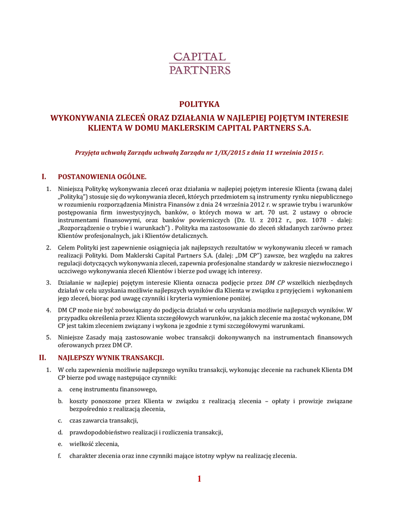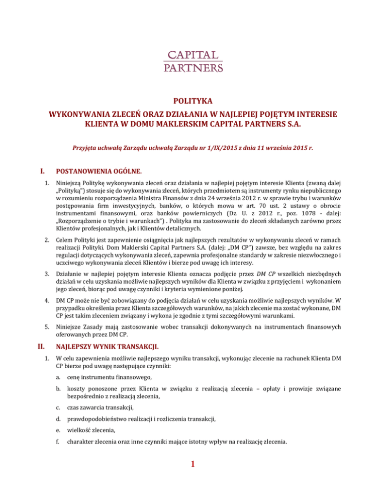 POLITYKA WYKONYWANIA ZLECEŃ ORAZ DZIAŁANIA W NAJLEPIEJ POJĘTYM INTERESIE KLIENTA W DOMU MAKLERSKIM CAPITAL PARTNERS S.A. Przyjęta uchwałą Zarządu uchwałą Zarządu nr 1/IX/2015 z dnia 11 września 2015 r. I. POSTANOWIENIA OGÓLNE. 1. Niniejszą Politykę wykonywania zleceń oraz działania w najlepiej pojętym interesie Klienta (zwaną dalej „Polityką") stosuje się do wykonywania zleceń, których przedmiotem są instrumenty rynku niepublicznego w rozumieniu rozporządzenia Ministra Finansów z dnia 24 września 2012 r. w sprawie trybu i warunków postępowania firm inwestycyjnych, banków, o których mowa w art. 70 ust. 2 ustawy o obrocie instrumentami finansowymi, oraz banków powierniczych (Dz. U. z 2012 r., poz. 1078 - dalej: „Rozporządzenie o trybie i warunkach”) . Polityka ma zastosowanie do zleceń składanych zarówno przez Klientów profesjonalnych, jak i Klientów detalicznych. 2. Celem Polityki jest zapewnienie osiągnięcia jak najlepszych rezultatów w wykonywaniu zleceń w ramach realizacji Polityki. Dom Maklerski Capital Partners S.A. (dalej: „DM CP”) zawsze, bez względu na zakres regulacji dotyczących wykonywania zleceń, zapewnia profesjonalne standardy w zakresie niezwłocznego i uczciwego wykonywania zleceń Klientów i bierze pod uwagę ich interesy. 3. Działanie w najlepiej pojętym interesie Klienta oznacza podjęcie przez DM CP wszelkich niezbędnych działań w celu uzyskania możliwie najlepszych wyników dla Klienta w związku z przyjęciem i wykonaniem jego zleceń, biorąc pod uwagę czynniki i kryteria wymienione poniżej. 4. DM CP może nie być zobowiązany do podjęcia działań w celu uzyskania możliwie najlepszych wyników. W przypadku określenia przez Klienta szczegółowych warunków, na jakich zlecenie ma zostać wykonane, DM CP jest takim zleceniem związany i wykona je zgodnie z tymi szczegółowymi warunkami. 5. Niniejsze Zasady mają zastosowanie wobec transakcji dokonywanych na instrumentach finansowych oferowanych przez DM CP. II. 1. NAJLEPSZY WYNIK TRANSAKCJI. W celu zapewnienia możliwie najlepszego wyniku transakcji, wykonując zlecenie na rachunek Klienta DM CP bierze pod uwagę następujące czynniki: a. cenę instrumentu finansowego, b. koszty ponoszone przez Klienta w związku z realizacją zlecenia – opłaty i prowizje związane bezpośrednio z realizacją zlecenia, c. czas zawarcia transakcji, d. prawdopodobieństwo realizacji i rozliczenia transakcji, e. wielkość zlecenia, f. charakter zlecenia oraz inne czynniki mające istotny wpływ na realizację zlecenia. 1 2. W przypadku zleceń składanych przez Klientów detalicznych, DM CP, aby uzyskać możliwie najlepszy wynik, największą wagę przypisuje czynnikom w ust 1 lit. a-b. powyżej. 3. W przypadku zleceń składanych przez Klientów profesjonalnych DM CP bierze pod uwagę czynniki wymienione w ust. 1 lit. c-f według własnej oceny. III. MIEJSCE WYKONANIA ZLECENIA. DM CP może wykonywać zlecenia wyłącznie bezpośrednio, zgodnie z Regulaminem świadczenia usług polegających na wykonywaniu zleceń nabycia lub zbycia instrumentów rynku niepublicznego („Regulamin rynku niepublicznego”). IV. ODSTĘPSTWA OD ZASADY DZIAŁANIA W NAJLEPIEJ POJĘTYM INTERESIE KLIENTA. 1. V. Obowiązek działania w najlepiej pojętym interesie Klienta nie dotyczy następujących przypadków: a. zawierania transakcji na podstawie zapytania o cenę, gdy Klient zwraca się do DM CP wyłącznie o podanie ceny lub przyjmuje (akceptuje) cenę i nie wymaga od DM CP ochrony swoich interesów, b. instrumentów finansowych oferowanych na rynku nieregulowanym, dostosowanych do konkretnej sytuacji Klienta, gdy na rynku nie są dostępne porównywalne (podobne) instrumenty, c. szczegółowych instrukcji Klienta, gdy Klient określa szczegółowe warunki, na jakich zlecenie ma zostać wykonane, DM CP zobowiązany jest wykonać zlecenie zgodnie z tymi szczegółowymi warunkami i w tym zakresie obowiązek DM CP działania w najlepiej pojętym interesie Klienta zostaje wykonany. OGÓLNE ZASADY WYKONYWANIA ZLECEŃ. 1. DM CP wykonuje zlecenia Klientów zgodnie z Rozporządzeniem o trybie i warunkach oraz zgodnie z Regulaminem rynku niepublicznego. 2. DM CP wykonuje zlecenia Klientów niezwłocznie, uczciwie i szybko w stosunku do innych zleceń Klientów oraz do transakcji na własny rachunek. DM CP wykonuje zlecenia w kolejności ich przyjmowania, chyba, że: 3. VI. a. co innego wynika z warunków wykonania zlecenia określonych przez Klienta lub, b. charakter zlecenia Klienta lub warunki panujące na rynku sprawiają, że ten sposób wykonania zlecenia nie może być zastosowany lub, czego innego wymaga interes Klienta. DM CP nie będzie łączył zleceń Klientów ze zleceniami własnymi (z transakcjami na własny rachunek) . POSTANOWIENIA KOŃCOWE. 1. DM CP regularnie monitoruje skuteczność wdrożonych rozwiązań i stosowanej Polityki. 2. DM CP dokonuje przeglądu Polityki nie rzadziej niż raz na rok. 3. O wszelkich istotnych zmianach w Polityce DM CP będzie informował Klientów przez umieszczenie zaktualizowanej Polityki na stronie internetowej DM CP. 4. Brak zawiadomienia przez Klienta o braku zgody na zmianę Polityki przed dniem jej wejścia w życie uważa się za przyjęcie nowych warunków. VII. POSTANOWIENIA KOŃCOWE. 5. Niniejsza Polityka jest przyjmowana i zmieniana przez Zarząd Domu Maklerskiego. 6. Niniejsza Polityka wchodzi w życie z dniem 11 września 2015 roku. 2