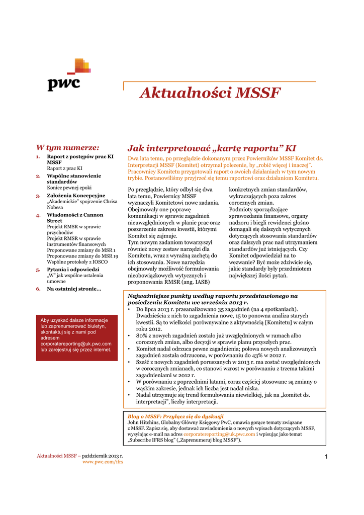 Aktualności MSSF W tym numerze: Jak interpretować „kartę raportu” KI 1. Raport z postępów prac KI MSSF Raport z prac KI 2. Wspólne stanowienie standardów Koniec pewnej epoki Dwa lata temu, po przeglądzie dokonanym przez Powierników MSSF Komitet ds. Interpretacji MSSF (Komitet) otrzymał polecenie, by „robić więcej i inaczej”. Pracownicy Komitetu przygotowali raport o swoich działaniach w tym nowym trybie. Postanowiliśmy przyjrzeć się temu raportowi oraz działaniom Komitetu. 3. Założenia Koncepcyjne „Akademickie” spojrzenie Chrisa Nobesa 4. Wiadomości z Cannon Street Projekt RMSR w sprawie przychodów Projekt RMSR w sprawie instrumentów finansowych Proponowane zmiany do MSR 1 Proponowane zmiany do MSR 19 Wspólne protokoły z IOSCO 5. Pytania i odpowiedzi „W” jak wspólne ustalenia umowne 6. Na ostatniej stronie... Aby uzyskać dalsze informacje lub zaprenumerować biuletyn, skontaktuj się z nami pod adresem [email protected] lub zarejestruj się przez internet. Po przeglądzie, który odbył się dwa lata temu, Powiernicy MSSF wyznaczyli Komitetowi nowe zadania. Obejmowały one poprawę komunikacji w sprawie zagadnień nieuwzględnionych w planie prac oraz poszerzenie zakresu kwestii, którymi Komitet się zajmuje. Tym nowym zadaniom towarzyszył również nowy zestaw narzędzi dla Komitetu, wraz z wyraźną zachętą do ich stosowania. Nowe narzędzia obejmowały możliwość formułowania nieobowiązkowych wytycznych i proponowania RMSR (ang. IASB) konkretnych zmian standardów, wykraczających poza zakres corocznych zmian. Podmioty sporządzające sprawozdania finansowe, organy nadzoru i biegli rewidenci głośno domagali się dalszych wytycznych dotyczących stosowania standardów oraz dalszych prac nad utrzymaniem standardów już istniejących. Czy Komitet odpowiedział na to wezwanie? Być może zdziwicie się, jakie standardy były przedmiotem największej ilości pytań. Najważniejsze punkty według raportu przedstawionego na posiedzeniu Komitetu we wrześniu 2013 r. • Do lipca 2013 r. przeanalizowano 35 zagadnień (na 4 spotkaniach). Dwadzieścia z nich to zagadnienia nowe, 15 to ponowna analiza starych kwestii. Są to wielkości porównywalne z aktywnością [Komitetu] w całym roku 2012. • 80% z nowych zagadnień zostało już uwzględnionych w ramach albo corocznych zmian, albo decyzji w sprawie planu przyszłych prac. • Komitet nadal odrzuca pewne zagadnienia; połowa nowych analizowanych zagadnień została odrzucona, w porównaniu do 43% w 2012 r. • Sześć z nowych zagadnień poruszanych w 2013 r. ma zostać uwzględnionych w corocznych zmianach, co stanowi wzrost w porównaniu z trzema takimi zagadnieniami w 2012 r. • W porównaniu z poprzednimi latami, coraz częściej stosowane są zmiany o wąskim zakresie, jednak ich liczba jest nadal niska. • Nadal utrzymuje się trend formułowania niewielkiej, jak na „komitet ds. interpretacji”, liczby interpretacji. Blog o MSSF: Przyłącz się do dyskusji John Hitchins, Globalny Główny Księgowy PwC, omawia gorące tematy związane z MSSF. Zapisz się, aby dostawać zawiadomienia o nowych wpisach dotyczących MSSF, wysyłając e-mail na adres [email protected] i wpisując jako temat „Subscribe IFRS blog” („Zaprenumeruj blog MSSF”). Aktualności MSSF – październik 2013 r. www.pwc.com/ifrs 1 www.pwc.com/ifrs Kto i o co pyta? Nikogo nie zdziwi to, do jakich standardów nadesłano najwięcej pytań w 2013 r. Są to MSSF 3, MSR 19 i MSSF 2 oraz MSR 7. MSSF 3, postrzegany przez wielu jako śmiały eksperyment w zakresie wyceny aktywów w wartości godziwej, jest obecnie przedmiotem planowanego przeglądu powdrożeniowego, ale co z pozostałymi? Możecie się zastanawiać, dlaczego nie MSR 39? Być może osoby, które chciały zadać pytania dotyczące instrumentów finansowych, nazdążyły się już zorientować, że Komitet prawdopodobnie i tak nie odpowie na nie, ze względu na toczące się obecnie prace nad MSSF 9. MSR 19 został dopiero co zaktualizowany w 2011 r., a wprowadzone zmiany obowiązują od 1 stycznia 2013 r. Skąd więc tyle pytań? Wygląda na to, że niewiele nowych standardów wytrzymało konfrontację z rzeczywistością. (Podobna sytuacja ma miejsce w przypadku MSSF 11 - zob. str. 10). Okazuje się tymczasem, że Komitet poświęcił tyle samo czasu na wyjaśnianie starego problemu związanego z MSR 19 dotyczącego stóp dyskontowych, co na objaśnianie nowych zmian do standardu. Z kolei planowany przegląd powdrożeniowy MSSF 2 nigdy nie został przeprowadzony. Stale napływają nowe pytania, a wiele z wcześniejszych Komitet odłożył na później w nadziei, że zostaną one uwzględnione w przeglądzie powdrożeniowym. Obecnie Komitet powraca do tych pytań i rozważa możliwość wprowadzenia zmian o ograniczonym zakresie. Jeśli zmiany te się zmaterializują, MSSF 2, który ma już 10 lat, będzie przedmiotem tylu zmian, co jego brat MSR 19. Komitet podjął także próby przeanalizowania klasyfikacji przepływów pieniężnych według MSR Aktualności MSSF – październik 2013 r. 7 ze względu na dużą liczbę pytań o interpretację. Wynikiem tych prac jest kilka poprawek zaproponowanych w ramach corocznych zmian, jednak Komitet uznał, że niezbędne jest jednak zastosowanie szerszego podejścia. Zagadnienia te zostały obecnie uwzględnione w średnioterminowym projekcie badawczym obejmującym MSR 1, MSR 7 i MSR 8. Czy widać jakieś standardy, których wyraźnie nie ma na liście? Jeden z członków rady zauważył, że w ciągu ostatnich czterech lat nie podniesiono kwestii związanych z MSR 36 i utratą wartości, mimo że były ku temu przesłanki. Jak działają nowe narzędzia? Komitet rozstrzygał kwestie głównie w trybie corocznych zmian oraz decyzji w sprawie planu przyszłych prac. Ten trend prawdopodobnie nadal się utrzyma, jednak coraz częściej stosowanym narzędziem stają się zmiany o ograniczonym zakresie. Mają