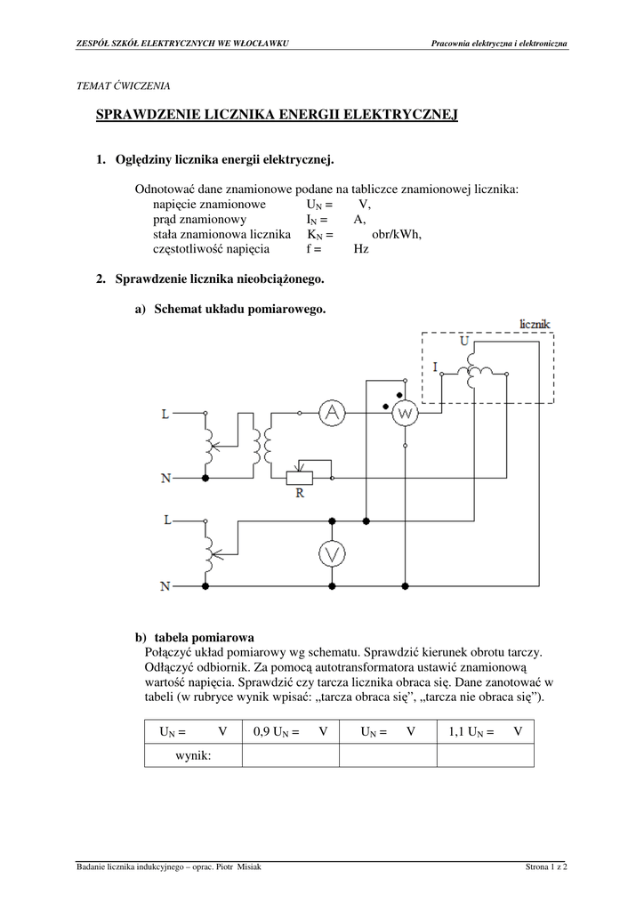 ZESPÓŁ SZKÓŁ ELEKTRYCZNYCH WE WŁOCŁAWKU Pracownia elektryczna i elektroniczna TEMAT ĆWICZENIA SPRAWDZENIE LICZNIKA ENERGII ELEKTRYCZNEJ 1. Oględziny licznika energii elektrycznej. Odnotować dane znamionowe podane na tabliczce znamionowej licznika: napięcie znamionowe UN = V, prąd znamionowy IN = A, stała znamionowa licznika KN = obr/kWh, częstotliwość napięcia f= Hz 2. Sprawdzenie licznika nieobciąŜonego. a) Schemat układu pomiarowego. b) tabela pomiarowa Połączyć układ pomiarowy wg schematu. Sprawdzić kierunek obrotu tarczy. Odłączyć odbiornik. Za pomocą autotransformatora ustawić znamionową wartość napięcia. Sprawdzić czy tarcza licznika obraca się. Dane zanotować w tabeli (w rubryce wynik wpisać: „tarcza obraca się”, „tarcza nie obraca się”). UN = V 0,9 UN = V UN = V 1,1 UN = V wynik: Badanie licznika indukcyjnego – oprac. Piotr Misiak Strona 1 z 2 ZESPÓŁ SZKÓŁ ELEKTRYCZNYCH WE WŁOCŁAWKU Pracownia elektryczna i elektroniczna 3. Sprawdzenie licznika obciąŜonego. Wyznaczenie stałej rzeczywistej licznika. Połączyć układ pomiarowy wg schematu. Za pomocą autotransformatora ustawić znamionowe wartości napięcia i prądu licznika. Sprawdzić czy tarcza licznika obraca się we właściwym kierunku. Zmierzyć czas t dla N obrotów tarczy licznika. Wyznaczyć stałą rzeczywistą licznika Krz, błąd pomiaru. Lp 1 2 3 4 5 6 7 8 9 10 U V I A P W t s N obr KN Krz obr/kWh obr/kWh δ % U – napięcie zmierzone woltomierzem [V], I – prąd zmierzony amperomierzem [A], P – moc zmierzona watomierzem [V], t – czas obrotu tarczy [s], N – liczba obrotów tarczy [obr] KN - stała znamionowa licznika [obr/kWh], Krz - stała rzeczywista licznika [obr/kWh], δ – błąd pomiaru licznikiem [%] K − KN N K rz = ⋅ 3,6 ⋅10 6 δ = rz ⋅ 100 P⋅t KN Na podstawie pomiarów i obliczeń określić czy licznik działa poprawnie. Badanie licznika indukcyjnego – oprac. Piotr Misiak Strona 2 z 2