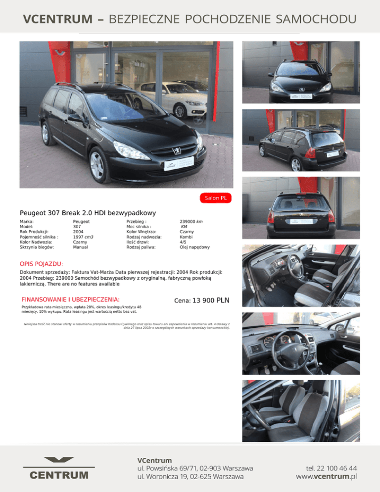 Peugeot 307 Break 2.0 HDI bezwypadkowy Marka: Model: Rok Produkcji: Pojemność silnika : Kolor Nadwozia: Skrzynia biegów: Peugeot 307 2004 1997 cm3 Czarny Manual Przebieg : Moc silnika : Kolor Wnętrza: Rodzaj nadwozia: Ilość drzwi: Rodzaj paliwa: 239000 km KM Czarny Kombi 4/5 Olej napędowy OPIS POJAZDU: Dokument sprzedaży: Faktura Vat-Marża Data pierwszej rejestracji: 2004 Rok produkcji: 2004 Przebieg: 239000 Samochód bezwypadkowy z oryginalną, fabryczną powłoką lakierniczą. There are no features available FINANSOWANIE I UBEZPIECZENIA: Cena: 13 900 PLN Przykładowa rata miesięczna, wpłata 20%, okres leasingu/kredytu 48 miesięcy, 10% wykupu. Rata leasingu jest wartością netto bez vat. Niniejsza treść nie stanowi oferty w rozumieniu przepisów Kodeksu Cywilnego oraz opisu towaru ani zapewnienia w rozumieniu art. 4 Ustawy z dnia 27 lipca 2002r o szczególnych warunkach sprzedaży konsumenckiej. Powered by TCPDF (www.tcpdf.org)
