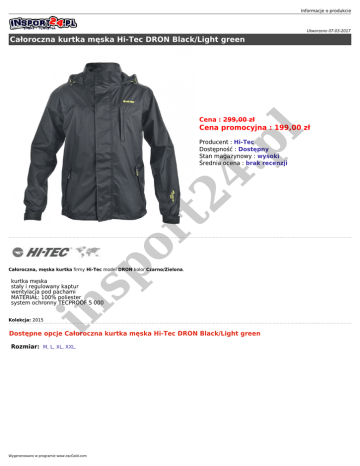Informacje o produkcie Utworzono 07-03-2017 Całoroczna kurtka męska Hi-Tec DRON Black/Light green Cena : 299,00 zł l Cena promocyjna : 199,00 zł sp or t2 4. p Producent : Hi-Tec Dostępność : Dostępny Stan magazynowy : wysoki Średnia ocena : brak recenzji Całoroczna, męska kurtka firmy Hi-Tec model DRON kolor Czarno/Zielona. in kurtka męska stały i regulowany kaptur wentylacja pod pachami MATERIAŁ: 100% poliester system ochronny TECPROOF 5 000 Kolekcja: 2015 Dostępne opcje Całoroczna kurtka męska Hi-Tec DRON Black/Light green Rozmiar: M, L, XL, XXL. Wygenerowano w programie www.oscGold.com