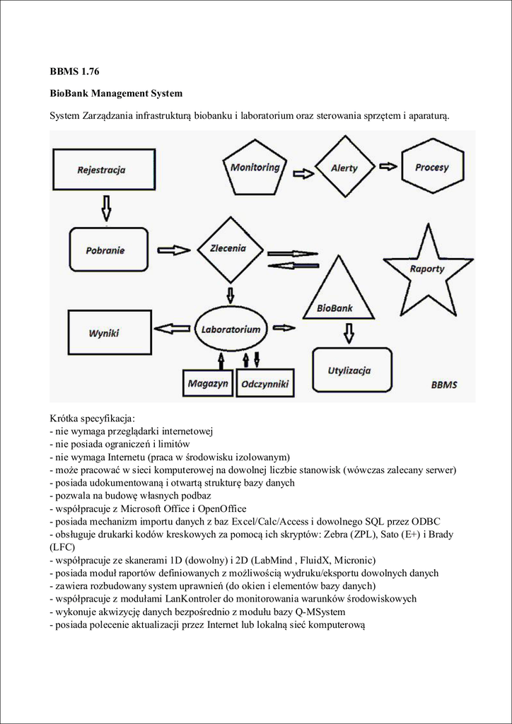 BBMS 1.76 BioBank Management System System Zarządzania infrastrukturą biobanku i laboratorium oraz sterowania sprzętem i aparaturą. Krótka specyfikacja: - nie wymaga przeglądarki internetowej - nie posiada ograniczeń i limitów - nie wymaga Internetu (praca w środowisku izolowanym) - może pracować w sieci komputerowej na dowolnej liczbie stanowisk (wówczas zalecany serwer) - posiada udokumentowaną i otwartą strukturę bazy danych - pozwala na budowę własnych podbaz - współpracuje z Microsoft Office i OpenOffice - posiada mechanizm importu danych z baz Excel/Calc/Access i dowolnego SQL przez ODBC - obsługuje drukarki kodów kreskowych za pomocą ich skryptów: Zebra (ZPL), Sato (E+) i Brady (LFC) - współpracuje ze skanerami 1D (dowolny) i 2D (LabMind , FluidX, Micronic) - posiada moduł raportów definiowanych z możliwością wydruku/eksportu dowolnych danych - zawiera rozbudowany system uprawnień (do okien i elementów bazy danych) - współpracuje z modułami LanKontroler do monitorowania warunków środowiskowych - wykonuj e akwizycję danych bezpośrednio z modułu bazy Q-MSystem - posiada polecenie aktualizacji przez Internet lub lokalną sieć komputerową - zawiera moduł definiowanego eksportu/importu XML - posiada interfejs w językach: polskim, angielskim, niemieckim, francuskim, hiszpańskim, włoskim, szwedzkim, holenderskim, esperanto, norweskim, duńskim, fińskim i estońskim - posiada pomoc kontekstową (klawisz F1) w każdym j ęzyku interfej su - j est zgodny z normami PN-EN ISO 17025 i ISO 15189 - nie posiada klucza sprzętowego, czyli nie wymaga portów USB - pozwala na zarządzanie dokumentacj ą laboratoryjną poprzez system załączników - zawiera moduł ewidencji zasobów pozwalaj ący na monitorowanie i nadzorowanie wyposażenia - umożliwia automatyczne generowanie serii raportów na wiele kont e-mail - posiada szybkie wyszukiwanie i filtrowanie danych w oknie - zawiera mechanizm kopiowania danych z okna do kontenera - odpowiednika schowka - wysyła wiadomości SMS na wskazany nr tel. o dowolnie zdefiniowanych zdarzeniach Producent oprogramowania, firma LabMind specj alizuje się w automatyzacj i biobanków i laboratoriów. W ramach tej działalności powstaje znacznie więcej aplikacj i, które współpracuj ą ze sobą. BBMS w wersji do obsługi zautomatyzowanego biobanku lub laboratorium zawiera dodatkowo oprogramowanie: Yeti (robot obsługi zamrażarek), Agata (suwnica laboratoryjna), Adjunct (mikro suwnica obsługi sortera), Sorter (kontroler sortera fiolek), 2D (kontroler skanera 2D), Agent (komunikacj a z pozostałymi terminalami), Robot (aplikacj a wykonująca zaprogramowane procesy z wykorzystaniem Agentów) i wiele innych. Aktualna wersja dokumentu w formacie pdf znajduj e się pod adresem http://bbms.pl/BBMS_PL.pdf . Oprogramowanie można aktualizować z Internetu pod adresem http://bbms.pl/ lub wykonanie odpowiedniego polecenia w menu Pomoc. Obsługa W każdej tabelce funkcj onuje menu kontekstowe pod prawym klawiszem myszy. Nową pozycję można dodać za pomocą polecenia z menu "Dodaj" lub przez naciśnięcie klawisza [Ins], a usunąć poleceniem "Usuń" lub klawiszem [Del]. "Kontener" kopiuje wybrany wiersz tabeli do kontenera. Polecenia "Góra" i "Dół" przesuwaj ą wybrany wiersz w odpowiednim kierunku. Wiele okien ma włączoną funkcjonalność Drag-and-drop, pozwalaj ącą na przeniesienie elementów w drzewie na inną gałąź za pomocą lewego klawisza myszy - odpowiednik polecenia "Przenieś" z menu podręcznego. "Drukuj " - umożliwia wydruk danych z okna, nie tylko na drukarkę, ale również do pliku w j ednym z wielu formatów "Arkusz" - wysłanie danych do arkusza kalkulacyjnego. Na komputerze powinien być zainstalowany dowolny pakiet biurowy, a j eśli są dwa, to można wybrać w zasobach domyślny. "Zmiany" - podgląd zmian wykonanych we wskazanej pozycj i tabeli. "Sumuj" - działa w wybranych modułach - uruchamia procedurę sumowania danych, np. stanów. "Notatka" - pozwala na wpisanie notatki do wybranej pozycji, to samo polecenie występuje w okienku edycyjnym. "Uprawnienia" - przydzielanie lub odbieranie uprawnień do bieżącego okna lub przepisanych do okna tabel. Prawa do tych czynności posiada Admin, a pozostali mogą sprawdzić aktualne uprawnienia. Okienko edycyjne: W każdym okienku edycyj nym, po ustawieniu wskaźnika myszy nad polem zostanie wyświetlony opis tego pola, a opis pola z kursorem poj awi się na paskach statusu. Okienka edycyj ne oprócz wprowadzania danych umożliwiają podpięcie i zarządzanie dokumentami w formie elektronicznej za pomocą zestawu guzików [+], [>], [-]. Po załączeniu dokumentu poj awi się do niego link, a sam dokument zostanie skopiowany. Sieć komputerowa - automatyzacja i integracja Oprogramowanie może pracować w sieci komputerowej współdzieląc wszystkie dane. Nie ma żadnych ograniczeń w tym zakresie i istniej ą metody optymalizacj i tej pracy. 1. wszystkie współdzielone dane powinny znaj dować się na komputerze udostępniającym dysk w taki sposób, żeby był widoczny katalog \BBMS\BAZY\ 2. pliki programów, czyli cała zawartość \BBMS\PRG może i powinna znaj dować się na dysku lokalnym np. C:\BBMS\PRG Po uruchomieniu program skanuje dyski lokalne i zmapowane dyski udostępnione w poszukiwaniu katalogu \BBMS\BAZY. Jeśli chcesz ograniczyć ilość skanowanych dysków, to uruchamiaj program z parametrem /S. Przykład: Placówka posiada siedem komputerów połączonych w sieć komputerową i nie posiada serwera: SZEF, SEKRET, REJESTR, LAB1, LAB2, BB1 Komputer SEKRET (sekretariat) posiada duży dysk lokalny podzielony na partycj e i w związku z tym decyduj emy się na instalacj ę danych w katalogu D:\BBMS\BAZY\BIOBANK. Ten dysk udostępniamy w sieci i mapujemy na pozostałych komputerach. Litera przydzielana mapowanemu dysku możne być dowolna jednak nie używa się liter określających domyślnie napędy dyskietek lub CD-ROM. Załó