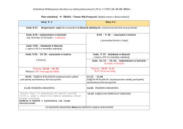 Rekolekcje Wielkopostne dla dzieci ze szkół podstawowych ( SP nr. 3 i PSP): 24- 26. 02. 2016 r Plan rekolekcji ŚRODA – Temat: Mój Przyjaciel (będzie mowa o Bożej miłości) klasy 0- 3 Godz. 8.15. klasy 4-6 Rozpoczęcie zajęć dla wszystkich w klasach szkolnych z wychowawcami lub nauczycielami Godz. 8.30 – nabożeństwo w kościele (np. Koronka 12 Gwiazd) – o. Stanisław 8.30. - 9. 30. - nauczanie w teatrze ( prowadzą Siostry z Lipia) Godz. 9.00. - śniadanie w klasach ( dzieci z SP 3 w świetlicy szkolnej) Godz. 9.30. - 10. 30. - nauczanie w teatrze ( Siostry) Godz. 9. 35 - śniadanie w klasach ( dzieci z SP 3 w świetlicy szkolnej) Godz. 10. 15. - 10. 45. - nabożeństwo w kościele – kl. Adam i S. Karmela Przerwa: 10.30. – 10. 45. Dzieci z SP. 3 wracają do szkoły 10.45. ZAJĘCIA W KLASACH (wykonywanie zadań) pod opieką wychowawcy lub nauczyciela 11.45. PRZERWA OBIADOWA Dzieci klas 1-3 powracają do swoich klas(do 13.05.), gdyż w świetlicy będzie podawany obiad klasom starszym. ZAJĘCIA W KLASIE z wychowawcą lub innym nauczycielem. Przerwa : 10.45.- 11.15. SP 3 wraca do szkoły 11.15. - 12.40. ZAJĘCIA W KLASACH (wykonywanie zadań) pod opieką wychowawcy lub nauczyciela 12.40. PRZERWA OBIADOWA 13.10. ZAJĘCIA NA ŚWIETLICY SZKOLNEJ PO PRZERWIE OBIADOWEJ MOGĄ SIĘ ODBYWAĆ ZAJĘCIA DODATKOWE Rekolekcje Wielkopostne dla dzieci ze szkół podstawowych ( SP nr. 3 i PSP): 24- 26. 02. 2016 r CZWARTEK : Temat: Jak zbliżyć się do Jezusa ( grzeszność człowieka i sumienie) - spowiedź klasy 0-2 !!! Godz. 8.15. klasy 3-6 !!! Rozpoczęcie zajęć dla wszystkich w klasach szkolnych z wychowawcami lub nauczycielami Godz. 8.30 – nauczanie w teatrze ( siostry) 8.30. – 9.30. SPOWIEDŹ ŚWIĘTA w kościele Godz. 9.30. - śniadanie w klasach ( dzieci z SP 3 w świetlicy szkolnej) Godz. 10.00 - 10. 40. Droga Krzyżowa w kaplicy (o. St.) Przerwa 10.45. – 11.00. Dzieci z SP 3 wracają do szkoły 11.00. ZAJĘCIA W KLASACH (wykonywanie zadań) pod opieką wychowawcy lub nauczyciela 11.45. PRZERWA OBIADOWA Dzieci klas 1-3 powracają do swoich klas(do 13.05.), gdyż w świetlicy będzie podawany obiad klasom starszym. Godz. 9. 30 - śniadanie w klasach ( dzieci z SP 3 w świetlicy szkolnej) Godz. 10. 00. - 11.15. Nauczanie w kościele - ( Siostry) Przerwa : 11.15- 11.30. SP 3 wraca do szkoły 11.30. - 12.40. ZAJĘCIA W KLASACH (wykonywanie zadań) pod opieką wychowawcy lub nauczyciela 12.40. PRZERWA OBIADOWA 13.10. ZAJĘCIA NA ŚWIETLICY SZKOLNEJ ZAJĘCIA W KLASIE z wychowawcą lub innym nauczycielem. PO PRZERWIE OBIADOWEJ MOGĄ SIĘ ODBYWAĆ ZAJĘCIA DODATKOWE Rekolekcje Wielkopostne dla dzieci ze szkół podstawowych ( SP nr. 3 i PSP): 24- 26. 02. 2016 r PIĄTEK ( spotkanie z Jezusem – ( o skarbie, jakim jest Niebo i o pragnieniu życia wiecznego) KLASY 0–3 KLASY 4- 6 GODZ. 8.15. ROZPOCZĘCIE LEKCJI W KLASACH Godz. 8.30. – 9.15. Spotkanie wszystkich w teatrze – nauczanie (Siostry) Śniadanie w klasach ( 9.15. – 9. 50) ( SP 3 jw.) Śniadanie w klasach ( 9.15. – 9.50.) (SP 3 jw.) 1. uwaga – mała przerwa na toaletę przed Mszą św. 2. Wyznaczyć miejsca w kościele dla klas, aby uniknąć zamieszania W kościele gromadzimy się o 10.00. – przygotowanie liturgii (śpiew) GODZ. 10. 15. - MSZA ŚW. w kościele dla wszystkich ( liturgię przygotują klasy 5 i 6 z SP nr. 3) Uwaga: wyjście z kościoła po Mszy św. – wypuszczamy dzieci klasami; PSP przez kaplicę; SP nr. 3 zbiórka pod chórem Klasy 0- 3 Godz. 11.45. – przerwa obiadowa Dzieci klas 1-3 powracają do swoich klas jw. Zajęcia w klasach z wychowawcą lub innym nauczycielem. Zajęcia dodatkowe Klasy 4-6 Godz. 11.45. zajęcia w klasach 12.40. – przerwa obiadowa 13.10. zajęcia na szkolnej świetlicy NB. warto pamiętać: REKOLEKCJE PROWADZIĆ BĘDĄ SIOSTRY ZE WSPÓLNOTY DZIECI ŁASKI BOŻEJ Z LIPIA K. KOSZALINA. KONTAKT: S. Grażyna Będą potrzebne materiały plastyczne – każde dziecko ma przygotować podczas zajęć m.inn.duże serce – stąd potrzebny zakup papieru (bristol czerwony)- kredki, mazaki, nożyczki itp. Najlepiej zgłosić do sekretariatu szkoły potrzebę zakupu w/w pomocy do prac w klasach. W rekolekcjach uczestniczą również dzieci ze Szkoły Podstaw. nr. 3 . Prośba do p. Łukasza Ciupińskiego o przygotowanie teatru, sprzętu multimedialnego i nagłośnienia i czuwanie nad w/w Podziękowanie dla Sióstr – dzieci z kl. 2 PSP ( 4 dzieci - kl. 2 a i 2 b) PROŚBA O PUNKTUALNOŚĆ Z NASZEJ STRONY ! ( Dzieci z nauczycielami z SP nr. 3. zawstydzają swoją punktualnością nas na miejscu….)