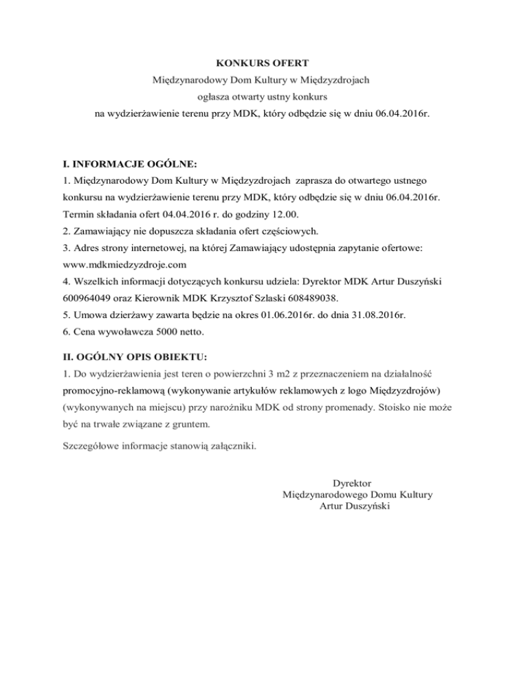 KONKURS OFERT Międzynarodowy Dom Kultury w Międzyzdrojach ogłasza otwarty ustny konkurs na wydzierżawienie terenu przy MDK, który odbędzie się w dniu 06.04.2016r. I. INFORMACJE OGÓLNE: 1. Międzynarodowy Dom Kultury w Międzyzdrojach zaprasza do otwartego ustnego konkursu na wydzierżawienie terenu przy MDK, który odbędzie się w dniu 06.04.2016r. Termin składania ofert 04.04.2016 r. do godziny 12.00. 2. Zamawiający nie dopuszcza składania ofert częściowych. 3. Adres strony internetowej, na której Zamawiający udostępnia zapytanie ofertowe: www.mdkmiedzyzdroje.com 4. Wszelkich informacji dotyczących konkursu udziela: Dyrektor MDK Artur Duszyński 600964049 oraz Kierownik MDK Krzysztof Szlaski 608489038. 5. Umowa dzierżawy zawarta będzie na okres 01.06.2016r. do dnia 31.08.2016r. 6. Cena wywoławcza 5000 netto. II. OGÓLNY OPIS OBIEKTU: 1. Do wydzierżawienia jest teren o powierzchni 3 m2 z przeznaczeniem na działalność promocyjno-reklamową (wykonywanie artykułów reklamowych z logo Międzyzdrojów) (wykonywanych na miejscu) przy narożniku MDK od strony promenady. Stoisko nie może być na trwałe związane z gruntem. Szczegółowe informacje stanowią załączniki. Dyrektor Międzynarodowego Domu Kultury Artur Duszyński Załącznik nr 1 do Ogłoszenia Dyrektora Międzynarodowego Domu Kultury WARUNKI - REGULAMIN USTNEGO KONKURSU OFERT na wydzierżawienie terenu przy MDK, który odbędzie się w dniu 06.04.2016r. Otwarcie i sprawdzenie zgłoszeń ofertowych przystąpienia do konkursu ustnego oraz licytacja stawek czynszu dzierżawnego nastąpi w dniu 06.04.2016r. o godz. 11 30 w sali nr 2 (I piętro) Międzynarodowego Domu Kultury w Międzyzdrojach, przy ulicy Bohaterów Warszawy 20. Termin składania ofert – 04.04.2016 r. do godziny 12.00 w sekretariacie MDK, w zamkniętej kopercie z dopiskiem „KONKURS OFERT NA DZIERŻAWĘ TERENU PRZY MDK”. Przewodniczący Komisji otwiera konkurs, a następnie wraz z komisją konkursową: • podaje liczbę otrzymanych zgłoszeń ofertowych; • dokonuje sprawdzenia, czy koperty z ofertami nie noszą śladów otwierania; • otwiera koperty ze zgłoszeniami ofertowymi oraz sprawdza dane podmiotów, które złożyły oferty; • przyjmuje wyjaśnienia lub oświadczenia zgłoszone przez oferentów; weryfikuje zgłoszenia ofertowe i ogłasza, które zgłoszenia są kompletne i spełniają warunki określone w ogłoszeniu. Komisja konkursowa odmawia zakwalifikowania zgłoszeń ofertowych do dalszej oceny, jeżeli: • nie spełniają warunków konkursu; • nie są kompletne i nie zostały uzupełnione w ramach składanych wyjaśnień lub oświadczeń oferentów; • wpłynęły po upływie wyznaczonego terminu składania zgłoszeń ofertowych; • są nieczytelne lub budzą wątpliwości co do ich treści. Konkurs może odbyć się, chociażby wpłynęło jedno zgłoszenie ofertowe spełniające wymogi i warunki ustnego konkursu. KONKURS USTNY - LICYTACJA STAWKI CZYNSZU: 1. Konkurs ustny odbywa się w obecności uczestników konkursu, w terminie i miejscu podanym w ogłoszeniu o konkursie. 2. Wchodząc do sali, gdzie odbywa się konkurs ustny, każdy z uczestników konkursu zobowiązany jest przedłożyć Komisji dokument stwierdzający tożsamość uczestnika. Jeżeli uczestnika w konkursie ustnym zastępuje inna osoba, winna ona przedstawić pełnomocnictwo w formie pisemnej. 3. Komisja dopuszcza do licytacji tylko tych uczestników, którzy złożyli dokumenty wymagane przez organizatora konkursu. Uczestnik konkursu, który spóźni się na otwarcie konkursu, nie zostanie dopuszczony do licytacji. 4. Konkurs ustny otwiera i prowadzi Przewodniczący Komisji, przekazując uczestnikom informacje o przedmiocie dzierżawy, cenie wywoławczej oraz podając do wiadomości imiona i nazwiska osób albo nazwy firmy, które złożyły „zgłoszenie udziału w konkursie ustnym” i zostały dopuszczone do uczestnictwa w konkursie. 5. Przewodniczący Komisji informuje uczestników konkursu, że po trzecim wywołaniu najwyższej zaoferowanej stawki dalsze postąpienia nie będą przyjęte. O wysokości postąpienia decydują uczestnicy konkursu, z tym, że postąpienie nie może wynosić mniej niż 1 % stawki (ceny) wywoławczej, z zaokrągleniem w górę do pełnych dziesiątek groszy. 6. Uczestnicy Konkursu ustnego zgłaszają ustnie kolejne postąpienie stawki dopóki mimo trzykrotnego wywołania nie ma dalszych postąpień. 7. Oferta przestaje wiązać, gdy inny uczestnik złożył ofertę korzystniejszą (zgłosił kolejne postąpienie). 8. Konkurs ustny jest ważny bez względu na liczbę uczestników, jeżeli chociaż jeden uczestnik zaoferował co najmniej jedno postąpienie powyżej stawki (ceny) wywoławczej. 9. Po ustaleniu postąpienia, Przewodniczący Komisji wywołuje trzykrotnie ostatnią najwyższą cenę i zamyka konkurs, a następnie ogłasza imię i nazwisko albo nazwę firmy, która konkurs wygrała. 10. Konkurs uważa się za zakończony wynikiem negatywnym, jeżeli żaden z uczestników konkursu ustnego nie zaoferował postąpienia ponad stawkę (cenę) wywoławczą oraz w sytuacji, gdy nikt do niego nie przystąpił. 11.Konkurs ustny uważa się za zamknięty z chwilą podpisania protokołu z przeprowadzonego postępowania. Komunikat o zamknięciu konkursu podaje się do wiadomości publicznej poprzez wywieszenie na tablicach ogłoszeń Międzynarodowego Domu Kultury w Międzyzdrojach. 12. Z oferentem, który wygrał konkurs ustny, zostanie zawarta umowa o treści odpowiadającej wzorowi umowy, w siedzibie Międzynarodowego Domu Kultury przy ul. Bohaterów Warszawy 20 (załącznik nr 3). 13. O terminie zawarcia umowy oferent zostanie powiadomiony odrębnym pismem. Brak stawiennictwa oferenta w wyznaczonym terminie będzie oznaczał uchylenie się od zawarcia umowy. 14. Wzór zgłoszenia ofertowego stanowi załącznik nr 4. Umowa najmu zostanie zawarta na czas określony od dnia 01.06.2016r. do dnia 31.08.2016r. D