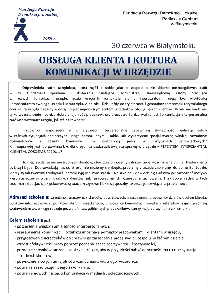 Fundacja Rozwoju Demokracji Lokalnej Podlaskie Centrum w Białymstoku 30 czerwca w Białymstoku OBSŁUGA KLIENTA I KULTURA KOMUNIKACJI W URZĘDZIE Odpowiednia kadra urzędnicza, która myśli o sobie jako o zespole a nie zbiorze poszczególnych osób – to fundament sprawnie i skutecznie działającej administracji samorządowej. Osoby pracujące w różnych komórkach urzędu, gdzie urzędnik kontaktuje się z interesantem, mogą być wizytówką i ambasadorem swojego urzędu i samorządu. Albo nie. Dziś każdy dobry starosta i gospodarz samorządu terytorialnego oraz kadra urzędu z reguły wiedzą, co jest największym atutem urzędników obsługujących klientów. Wcale nie wiek, nie tylko wykształcenie i bardzo dobra znajomość przepisów, czy procedur. Bardzo ważna jest komunikacja interpersonalna zarówno wewnątrz urzędu, jak też na zewnątrz. Pracownicy wyposażeni w umiejętności interpersonalne zapewniają skuteczność realizacji celów w różnych sytuacjach społecznych. Mogą pomóc innym i sobie. Jak wykorzystać specjalistyczną wiedzę, zawodowe doświadczenie i zasady komunikacji w codziennej pracy w instytucjach samorządowych? Kim naprawdę jest lub powinna być dla urzędnika osoba załatwiająca sprawę w urzędzie – PETENTEM, INTERESANTEM, KLIENTEM, GOŚCIEM URZĘDU…? To nieprawda, że nie ma trudnych klientów, choć często możemy usłyszeć takie, dość naiwne opinie. Trudni klienci byli, są i będą! Doprowadzają nas do stresu, nie możemy się skupić, problemy z urzędu zabieramy do domu itd. Ludzie, którzy są tak zwanymi trudnymi klientami żyją w silnym stresie. Na szkoleniu dowiecie się Państwo jak rozpoznać motywy kierujące różnymi typami trudnych klientów, jak reagować na ich różnorodne zachowania. I jak sobie radzić w tych trudnych sytuacjach, jak pokonywać sytuacje kryzysowe i jakie są sposoby twórczego rozwiązania problemów. Adresaci szkolenia: Urzędnicy, pracownicy starostw powiatowych, miast i gmin, pracownicy działów obsługi klienta, punktów informacyjnych, punktów obsługi mieszkańców, pracownicy komunikacji miejskich, referatów zajmujących się wydawaniem wszelkiego rodzaju pozwoleń - wszystkich tych pracowników, którzy mają do czynienia z klientem . Celem szkolenia jest: - poszerzenie wiedzy i umiejętności interpersonalnych, - usprawnienie komunikacji i przekazu informacji pomiędzy pracownikami i klientami w urzędu, - przygotowanie uczestników do sprawnego zarządzania pracą swoją i zespołu w którym działają, - wzrost efektywności pracy poprzez poznanie zasad asertywności, kreatywności, - poznanie sposobów radzenia sobie ze stresem, aby w przyszłości nabyć odporności na trudne sytuacje i trudnych klientów, - pozyskanie nowych umiejętności wzmocnienia własnego wizerunku, - poznania zasad urzędniczego savoir-vivru, - poznanie nowych narzędzi komunikacji w mediach społecznościowych, Prowadzący: Od 15 lat współpracuje z regionalnymi i ogólnopolskimi instytucjami szkoleniowymi; zrealizowała 1600 godzin szkoleniowych: w tym większość dla samorządu terytorialnego. Jako trenerka szkoli przedstawicieli samorządu oraz organizacji pozarządowych z zakresu: aktywizacja społeczna partycypacja, konsultacji społecznych, komunikacji i promocji, wystąpień publicznych warsztaty medialne. Z zawodu dziennikarka radiowa i telewizyjna. W latach 2003 -2007 dyrektor Departamentu Informacji i Promocji w Urzędzie Marszałkowskim Województwa Podlaskiego; redaktor naczelna portalu „Wrota Podlasia”, koordynacja działań promocyjnych, rzecznik prasowy marszałka województwa podlaskiego. Jest członkiem Zespołu Konsultacyjnego Organizacji Pozarządowych przy Prezydencie Miasta Białegostoku. W 2013 stanęła na czele grupy roboczej, która wypracowała projektu regulaminu powoływania komisji dialogu społecznego – proces tworzenia był w całości partycypacyjny. W 2013-2014 r. przewodniczyła międzysektorowej Komisji Dialogu Społecznego ds. konsultacji która wypracowała projekt Regulaminu Konsultacji Społecznych w Mieście Białystok. Program szkolenia: 1. My dla Klienta czy Klient dla nas - jak myśleć o Kliencie, zanim się przyjdzie, zatelefonuje, napisze? 2. Portret urzędnika administracji samorządowej – jak myślimy o sobie sami i jak myślą o nas inni? 3. Tajniki komunikacji – co wpływa na jakość obsługi, sztuka rozmawiania i aktywnego słuchania, 4. Typologia trudnych interesantów, 5. Zarządzanie stresem i emocjami w kontakcie z klientem, 6. Etykieta – podstawowe zasady samorządowego savoir-vivru 7. Rozmowy telefoniczne – jak je skutecznie prowadzić i wykorzystywać w pracy, 8. Pokaż mi swoją stronę www - budowanie wizerunku samorządu, urzędu i urzędnika – jak redagować stronę i wybrać nowoczesne narzędzia promocji ? 9. Media społecznościowe – czy warto? YouTube, Facebook, Twitter, blogi, vlogi, virale i in. - komu, co i kiedy? SZKOLENIE: OBSŁUGA KLIENTA I KULTURA KOMUNIKACJI W URZĘDZIE Miejsce: DANE D O K ON T AK T U : Fundacja Rozwoju Demokracji Lokalnej Podlaskie Centrum ul. Choroszczańska 31 15-732 Białystok (Dawny budynek Wyższej Szkoły Ekonomicznej) tel./fax. 85 732 17 88, 85 732 94 84 e-mail: [email protected] w w w. frd l.b ia ly s tok .p l OS OB A D O K ONT A K TU : Agnieszka Lipińska [email protected] Urszula Szczesiul [email protected] SALA SZKOLENIOWA FRDL-PC UL. Choroszczańska 31, 15-732 Białystok (dawny budynek WSE) Termin i godzina: 30 czerwca 2015r. godz. 10.00-15.00 Cena: 320 zł/os. Rabat: 10% - za zgłoszenie 2 lub więcej osób Zwolnione z VAT przy finansowaniu szkolenia ze środków publicznych. Cena zawiera materiały szkoleniowe, zaświadczenie o ukończeniu szkolenia, lunch i serwis kawowy. Zgłoszenia: Wypełnioną kartę zgłoszenia (zamieszczona poniżej) należy przesłać faksem lub mailem do 23 czerwca 2015r. Płatność przelewem na podstawie faktury otrzymanej po szkoleniu. Karta zgłos