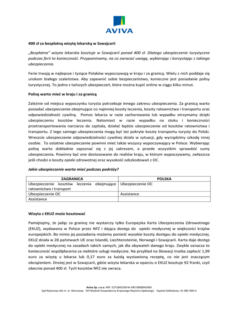 400 zł za bezpłatną wizytę lekarską w Szwajcarii „Bezpłatna” wizyta lekarska kosztuje w Szwajcarii ponad 400 zł. Dlatego ubezpieczenie turystyczne podczas ferii to konieczność. Przypominamy, na co zwracać uwagę, wybierając i korzystając z takiego ubezpieczenia. Ferie trwają w najlepsze i tysiące Polaków wypoczywają w kraju i za granicą. Wielu z nich poddaje się urokom białego szaleństwa. Aby zapewnić sobie bezpieczeństwo, konieczne jest posiadanie polisy turystycznej. To jedno z tańszych ubezpieczeń, które można kupić online w ciągu kilku minut. Polisę warto mieć w kraju i za granicą Zależnie od miejsca wypoczynku turysta potrzebuje innego zakresu ubezpieczenia. Za granicą warto posiadać ubezpieczenie obejmujące co najmniej koszty leczenia, koszty ratownictwa i transportu oraz odpowiedzialność cywilną. Pomoc lekarza w razie zachorowania lub wypadku otrzymamy dzięki ubezpieczeniu kosztów leczenia. Natomiast w razie wypadku na stoku i konieczności przetransportowania narciarza do szpitala, działać będzie ubezpieczenie od kosztów ratownictwa i transportu. Z tego samego ubezpieczenia mogą być też pokryte koszty transportu turysty do Polski. Wreszcie ubezpieczenie odpowiedzialności cywilnej działa w sytuacji, gdy wyrządzimy szkodę innej osobie. To ostatnie ubezpieczenie powinni mieć także wszyscy wypoczywający w Polsce. Wybierając polisę warto dokładnie zapoznać się z jej zakresem, a przede wszystkim sprawdzić sumy ubezpieczenia. Powinny być one dostosowane do realiów kraju, w którym wypoczywamy, zwłaszcza jeśli chodzi o koszty opieki zdrowotnej oraz wysokość odszkodowań z OC. Jakie ubezpieczenie warto mieć podczas podróży? ZAGRANICA Ubezpieczenie kosztów leczenia obejmujące Ubezpieczenie OC ratownictwo i transport Ubezpieczenie OC Assistance Assistance POLSKA Wizyta z EKUZ może kosztować Pamiętajmy, że jadąc za granicę nie wystarczy tylko Europejska Karta Ubezpieczenia Zdrowotnego (EKUZ), wydawana w Polsce przez NFZ i dająca dostęp do opieki medycznej w większości krajów europejskich. Bo mimo jej posiadania możemy ponieść wysokie koszty dostępu do opieki medycznej. EKUZ działa w 28 państwach UE oraz Islandii, Liechtensteinie, Norwegii i Szwajcarii. Karta daje dostęp do opieki medycznej na zasadach takich samych, jak dla obywateli danego kraju. Zwykle oznacza to konieczność współpłacenia za niektóre usługi medyczne. Na przykład na Słowacji trzeba zapłacić 1,99 euro za wizytę u lekarza lub 0,17 euro za każdą wystawioną receptę, co nie jest znaczącym obciążeniem. Drożej jest w Szwajcarii, gdzie wizyta lekarska w oparciu o EKUZ kosztuje 92 franki, czyli obecnie ponad 400 zł. Tych kosztów NFZ nie zwraca. Aviva Sp. z o.o. NIP: 5271845338 Nr KRS 0000043360 Sąd Rejonowy dla m. st. Warszawy XIII Wydział Gospodarczy Krajowego Rejestru Sądowego Kapitał Zakładowy: 41 085 500 zł EKUZ nigdy też nie zapewnia kosztów transportu i ratownictwa. Kilkadziesiąt tysięcy złotych może kosztować transport medyczny śmigłowcem do szpitala po wypadku na stoku. Także transport do Polski jest drogi. W niektórych wypadkach pacjentów trzeba przewozić specjalnym samolotem medycznym z asystą lekarską. Transport w ten sposób pacjenta po wypadku z krajów Beneluksu kosztował niedawno 40 tys. zł. Nawet przy mniejszych urazach koszty mogą być duże, bo np. osoba ze złamaną i usztywnioną nogą może potrzebować dwóch lub nawet trzech foteli w samolocie, a na każdy z nich trzeba wykupić oddzielny bilet. Nie zbaczaj z trasy Standardowe ubezpieczenie z opcją narciarską zwykle działa, gdy rekreacyjnie szusujemy po wyznaczonych trasach. Jeśli zamierzamy jeździć poza nimi, potrzebujemy specjalnego, znacznie droższego, ubezpieczenia. Warto o tym pamiętać i nie zbaczać z wyznaczonych szlaków, po poza trasami niebezpieczeństwo wypadku może być znacznie wyższe. Podobnie sprawa ma się z alkoholem. Grzane wino to jeden z najpopularniejszych napojów na narciarskich stokach, szczególnie w mroźne dni. Gdy wypijemy go jednak za dużo, a zdarzy się wypadek, z wypłatą odszkodowania może być problem. Większość ubezpieczycieli odmówi wypłaty, gdy następuje związek przyczynowy pomiędzy faktem picia alkoholu a wypadkiem. Pamiętajmy, że limity spożycia alkoholu związane z ubezpieczeniem narciarskim są zwykle inne niż te stosowane wobec kierowców. Informacje o tym, ile możemy wypić, znajdziemy w ogólnych warunkach naszego ubezpieczenia, czyli tzw. OWU. Tam też w każdym wypadku znajdziemy informacje, jak jeździć bezpiecznie, by ubezpieczenie chroniło nas w każdej sytuacji. Dlatego przed wyjazdem powinniśmy zapoznać się z najważniejszymi informacjami zawartymi w OWU, a najlepiej przeczytać je w całości. Ostatnio jest to łatwiejsze, bo ubezpieczyciele stosują bardziej przystępny i zrozumiały język, dodają wyjaśnienia, a nawet ilustracje oraz infografiki. Paweł Majtkowski Główny Analityk Centrum Finansów Aviva Aviva Sp. z o.o. NIP: 5271845338 Nr KRS 0000043360 Sąd Rejonowy dla m. st. Warszawy XIII Wydział Gospodarczy Krajowego Rejestru Sądowego Kapitał Zakładowy: 41 085 500 zł