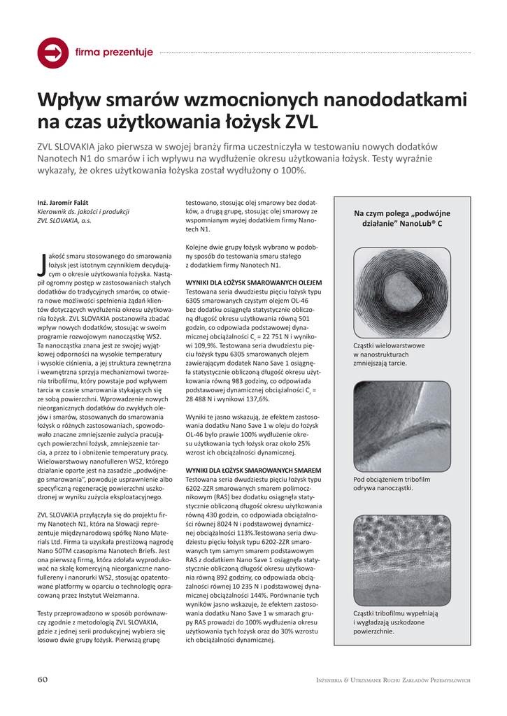 firma prezentuje Wpųyw smarów wzmocnionych nanododatkami na czas uǏytkowania ųoǏysk ZVL ZVL SLOVAKIA jako pierwsza w swojej branǏy firma uczestniczyųa w testowaniu nowych dodatków Nanotech N1 do smarów i ich wpųywu na wydųuǏenie okresu uǏytkowania ųoǏysk. Testy wyraǍnie wykazaųy, Ǐe okres uǏytkowania ųoǏyska zostaų wydųuǏony o 100%. InǏ. Jaromír Falát Kierownik ds. jakoƑci i produkcji ZVL SLOVAKIA, a.s. J akoƑđ smaru stosowanego do smarowania ųoǏysk jest istotnym czynnikiem decydujČcym o okresie uǏytkowania ųoǏyska. NastČpių ogromny postħp w zastosowaniach staųych dodatków do tradycyjnych smarów, co otwiera nowe moǏliwoƑci speųnienia ǏČdaŷ klientów dotyczČcych wydųuǏenia okresu uǏytkowania ųoǏysk. ZVL SLOVAKIA postanowiųa zbadađ wpųyw nowych dodatków, stosujČc w swoim programie rozwojowym nanoczČstkħ WS2. Ta nanoczČstka znana jest ze swojej wyjČtkowej odpornoƑci na wysokie temperatury i wysokie ciƑnienia, a jej struktura zewnħtrzna i wewnħtrzna sprzyja mechanizmowi tworzenia tribofilmu, który powstaje pod wpųywem tarcia w czasie smarowania stykajČcych siħ ze sobČ powierzchni. Wprowadzenie nowych nieorganicznych dodatków do zwykųych olejów i smarów, stosowanych do smarowania ųoǏysk o róǏnych zastosowaniach, spowodowaųo znaczne zmniejszenie zuǏycia pracujČcych powierzchni ųoǏysk, zmniejszenie tarcia, a przez to i obniǏenie temperatury pracy. Wielowarstwowy nanofulleren WS2, którego dziaųanie oparte jest na zasadzie „podwójnego smarowania”, powoduje usprawnienie albo specyficznČ regeneracjħ powierzchni uszkodzonej w wyniku zuǏycia eksploatacyjnego. ZVL SLOVAKIA przyųČczyųa siħ do projektu firmy Nanotech N1, która na Sųowacji reprezentuje miħdzynarodowČ spóųkħ Nano Materials Ltd. Firma ta uzyskaųa prestiǏowČ nagrodħ Nano 50TM czasopisma Nanotech Briefs. Jest ona pierwszČ firmČ, która zdoųaųa wyprodukowađ na skalħ komercyjnČ nieorganiczne nanofullereny i nanorurki WS2, stosujČc opatentowane platformy w oparciu o technologiħ opracowanČ przez Instytut Weizmanna. Testy przeprowadzono w sposób porównawczy zgodnie z metodologiČ ZVL SLOVAKIA, gdzie z jednej serii produkcyjnej wybiera siħ losowo dwie grupy ųoǏysk. PierwszČ grupħ 60 testowano, stosujČc olej smarowy bez dodatków, a drugČ grupħ, stosujČc olej smarowy ze wspomnianym wyǏej dodatkiem firmy Nanotech N1. Na czym polega „podwójne dziaųanie” NanoLub® C Kolejne dwie grupy ųoǏysk wybrano w podobny sposób do testowania smaru staųego z dodatkiem firmy Nanotech N1. WYNIKI DLA BOYSK SMAROWANYCH OLEJEM Testowana seria dwudziestu piħciu ųoǏysk typu 6305 smarowanych czystym olejem OL-46 bez dodatku osiČgnħųa statystycznie obliczonČ dųugoƑđ okresu uǏytkowania równČ 501 godzin, co odpowiada podstawowej dynamicznej obciČǏalnoƑci Cr = 22 751 N i wynikowi 109,9%. Testowana seria dwudziestu piħciu ųoǏysk typu 6305 smarowanych olejem zawierajČcym dodatek Nano Save 1 osiČgnħųa statystycznie obliczonČ dųugoƑđ okresu uǏytkowania równČ 983 godziny, co odpowiada podstawowej dynamicznej obciČǏalnoƑci Cr = 28 488 N i wynikowi 137,6%. CzČstki wielowarstwowe w nanostrukturach zmniejszajČ tarcie. Wyniki te jasno wskazujČ, Ǐe efektem zastosowania dodatku Nano Save 1 w oleju do ųoǏysk OL-46 byųo prawie 100% wydųuǏenie okresu uǏytkowania tych ųoǏysk oraz okoųo 25% wzrost ich obciČǏalnoƑci dynamicznej. WYNIKI DLA BOYSK SMAROWANYCH SMAREM Testowana seria dwudziestu piħciu ųoǏysk typu 6202-2ZR smarowanych smarem polimocznikowym (RAS) bez dodatku osiČgnħųa statystycznie obliczonČ dųugoƑđ okresu uǏytkowania równČ 430 godzin, co odpowiada obciČǏalnoƑci równej 8024 N i podstawowej dynamicznej obciČǏalnoƑci 113%.Testowana seria dwudziestu piħciu ųoǏysk typu 6202-2ZR smarowanych tym samym smarem podstawowym RAS z dodatkiem Nano Save 1 osiČgnħųa statystycznie obliczonČ dųugoƑđ okresu uǏytkowania równČ 892 godziny, co odpowiada obciČǏalnoƑci równej 10 235 N i podstawowej dynamicznej obciČǏalnoƑci 144%. Porównanie tych wyników jasno wskazuje, Ǐe efektem zastosowania dodatku Nano Save 1 w smarach grupy RAS prowadzi do 100% wydųuǏenia okresu uǏytkowania tych ųoǏysk oraz do 30% wzrostu ich obciČǏalnoƑci dynamicznej. Pod obciČǏeniem tribofilm odrywa nanoczČstki. CzČstki tribofilmu wypeųniajČ i wygųadzajČ uszkodzone powierzchnie. INŻYNIERIA & UTRZYMANIE RUCHU ZAKŁADÓW PRZEMYSŁOWYCH www.zvl.com.pl PROFIL SPÓŁKI Główną misją ZVL Slovakia, a. s. jest dostarczanie klientom niezawodnych i skutecznych rozwiązań oraz wysokiej jakości produktów branży łożyskowej. Fakt, że ponad 86% produkcji jest eksportowana na cały świat jest dowodem na wysoką jakość i gwarancją satysfakcji użytkownika. Z ponad 40-letnim doświadczeniem ZVL zalicza się do grona liderów w dziedzinie produkcji łożysk i komponentów dla różnych gałęzi przemysłu. Jesteśmy stabilnym partnerem dla wiodących producentów maszyn i urządzeń. Posiadamy sieć dystrybucji obsługującą klientów w zakresie potrzeb remontowych. Oferujemy naszym kontrahentom szeroki asortyment tradycyjnej, europejskiej marki. Znak towarowy ZVL jest zarejestrowany w ponad 60 krajach na całym świecie. Ze względu na wielkość i atrakcyjność rynku polskiego koncern utworzył spółkę „Łożyska Słowacja Sp. z o.o.” z siedzibą w Gliwicach, której celem jest rozwój sprzedaży i obsługa klienta na powierzonym terenie. HISTORIA 40LETNIA TRADYCJA W PRODUKCJI ŁOŻYSK Historia naszej firmy związana jest z powstaniem koncernu ZKL-ZVL w byłej Czechosłowacji. Najważniejszym faktem w historii było rozpoczęcie produkcji łożysk kulkowych w 1968 roku w fabryce w Žylinie. W tym samym roku firma została włączona do koncernu ZVL z siedzibą w Považskej Bystrici. Głównym celem koncernu ZVL było zjednoczenie zakładów produkujących łożyska w jeden koncer