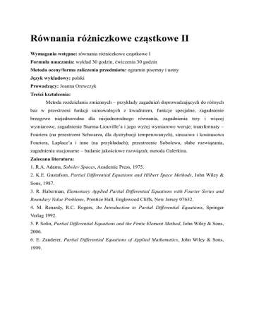 Równania różniczkowe cząstkowe II Wymagania wstępne: równania różniczkowe cząstkowe I Formuła nauczania: wykład 30 godzin, ćwiczenia 30 godzin Metoda oceny/forma zaliczenia przedmiotu: egzamin pisemny i ustny Język wykładowy: polski Prowadzący: Joanna Orewczyk Treści kształcenia: Metoda rozdzielania zmiennych – przykłady zagadnień doprowadzających do różnych baz w przestrzeni funkcji sumowalnych z kwadratem, funkcje specjalne, zagadnienie brzegowe niejednorodne dla niejednorodnego równania, zagadnienia trzy i więcej wymiarowe, zagadnienie Sturma-Liouville’a i jego wyżej wymiarowe wersje; transformaty – Fouriera (na przestrzeni Schwarza, dla dystrybucji temperowanych), sinusowa i kosinusowa Fouriera, Laplace’a i inne (na przykładach); przestrzenie Sobolewa, słabe rozwiązania, zagadnienia stacjonarne – badanie jakościowe rozwiązań; metoda Galerkina. Zalecana literatura: 1. R.A. Adams, Sobolev Spaces, Academic Press, 1975. 2. K.E. Gustafson, Partial Differential Equations and Hilbert Space Methods, John Wiley & Sons, 1987. 3. R. Haberman, Elementary Applied Partial Differential Equations with Fourier Series and Boundary Value Problems, Prentice Hall, Englewood Cliffs, New Jersey 07632. 4. M. Renardy, R.C. Rogers, An Introduction to Partial Differential Equations, Springer Verlag 1992. 5. P. Solin, Partial Differential Equations and the Finite Element Method, John Wiley & Sons, 2006. 6. E. Zauderer, Partial Differential Equations of Applied Mathematics, John Wiley & Sons, 1999.