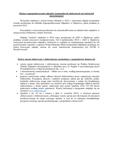 Miejsce zagospodarowania odpadów komunalnych odebranych od właścicieli nieruchomości Wszystkie odebrane z terenu Gminy Mielnik w 2014 r. zmieszane odpady komunalne zostały przekazane do Zakładu Zagospodarowania Odpadów w Hajnówce, gdzie poddano je procesowi R12. Pozostałość z sortowania przekazano do unieszkodliwienia na składowisko odpadów w miejscowości Olchówka, Gmina Narewka. Odpady "zielone" odebrane w 2014 roku, przekazano do ZZO w Hajnówce, gdzie poddane zostały procesowi kompostowania. Od 6 października 2014 r. ZZO w Hajnówce wstrzymał przyjmowanie odpadów zielonych ze względu na modernizację instalacji do ich przetwarzania i zgodnie z zapisem Wojewódzkiego Planu Gospodarki Odpadami instalacją, do której kierowano odpady zielone do czasu zakończenia modernizacji był ZUOK w Hryniewiczach. Zużyty sprzęt elektryczny i elektroniczny pochodzący z gospodarstw domowych zużyty sprzęt elektryczny i elektroniczny można przekazać do Punktu Selektywnej Zbiórki Odpadów Komunalnych w Mielniku przy ul. Popław 8 prowadzonego przez Przedsiębiorstwo Usług Komunalnych Sp. z o.o. z nieruchomości zamieszkałych – odbiór raz w roku, według harmonogramu, w formie tzw. „wystawek” poprzez zamówienie usługi odbioru dużych elektrośmieci przez organizację odzysku ElektroEko. Posiadacze dużych i ciężkich urządzeń, takich jak np. lodówki, pralki, kuchenki elektryczne mogą mieć możliwość skorzystania z usługi ich bezpłatnego odbioru z domu. Aby sprawdzić czy możliwa jest usługa bezpłatnego odbioru dużych elektrośmieci z domu należy zadzwonić pod numer telefonu 2222 333 00 (koszt połączenia według stawki operatora). Więcej informacji o programie znajduje się na stronach www.elektroeko.pl. Zgodnie z art. 42 ust 1 ustawy z dnia 11 września 2015r. o zużytym sprzęcie elektrycznym i elektronicznym „zbierający zużyty sprzęt jest obowiązany do przyjęcia przekazywanego do niego zużytego sprzętu, w tym do co najmniej nieodpłatnego przyjęcia zużytego sprzętu pochodzącego z gospodarstw domowych”.