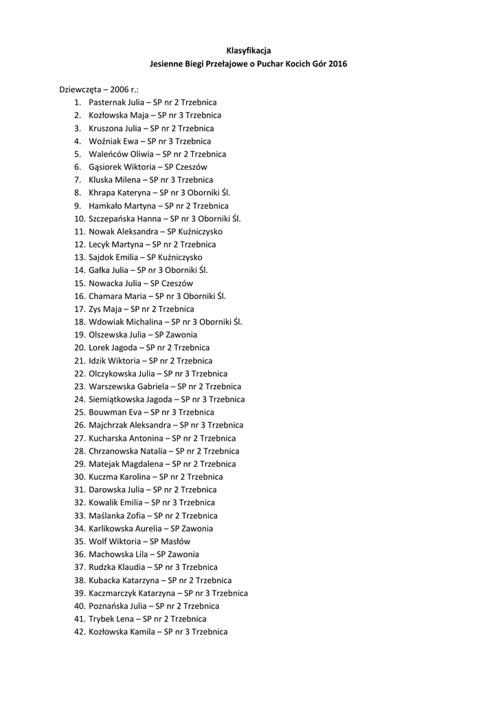 Klasyfikacja Jesienne Biegi Przełajowe o Puchar Kocich Gór 2016 Dziewczęta – 2006 r.: 1. Pasternak Julia – SP nr 2 Trzebnica 2. Kozłowska Maja – SP nr 3 Trzebnica 3. Kruszona Julia – SP nr 2 Trzebnica 4. Woźniak Ewa – SP nr 3 Trzebnica 5. Waleńców Oliwia – SP nr 2 Trzebnica 6. Gąsiorek Wiktoria – SP Czeszów 7. Kluska Milena – SP nr 3 Trzebnica 8. Khrapa Kateryna – SP nr 3 Oborniki Śl. 9. Hamkało Martyna – SP nr 2 Trzebnica 10. Szczepańska Hanna – SP nr 3 Oborniki Śl. 11. Nowak Aleksandra – SP Kuźniczysko 12. Lecyk Martyna – SP nr 2 Trzebnica 13. Sajdok Emilia – SP Kuźniczysko 14. Gałka Julia – SP nr 3 Oborniki Śl. 15. Nowacka Julia – SP Czeszów 16. Chamara Maria – SP nr 3 Oborniki Śl. 17. Zys Maja – SP nr 2 Trzebnica 18. Wdowiak Michalina – SP nr 3 Oborniki Śl. 19. Olszewska Julia – SP Zawonia 20. Lorek Jagoda – SP nr 2 Trzebnica 21. Idzik Wiktoria – SP nr 2 Trzebnica 22. Olczykowska Julia – SP nr 3 Trzebnica 23. Warszewska Gabriela – SP nr 2 Trzebnica 24. Siemiątkowska Jagoda – SP nr 3 Trzebnica 25. Bouwman Eva – SP nr 3 Trzebnica 26. Majchrzak Aleksandra – SP nr 3 Trzebnica 27. Kucharska Antonina – SP nr 2 Trzebnica 28. Chrzanowska Natalia – SP nr 2 Trzebnica 29. Matejak Magdalena – SP nr 2 Trzebnica 30. Kuczma Karolina – SP nr 2 Trzebnica 31. Darowska Julia – SP nr 2 Trzebnica 32. Kowalik Emilia – SP nr 3 Trzebnica 33. Maślanka Zofia – SP nr 2 Trzebnica 34. Karlikowska Aurelia – SP Zawonia 35. Wolf Wiktoria – SP Masłów 36. Machowska Lila – SP Zawonia 37. Rudzka Klaudia – SP nr 3 Trzebnica 38. Kubacka Katarzyna – SP nr 2 Trzebnica 39. Kaczmarczyk Katarzyna – SP nr 3 Trzebnica 40. Poznańska Julia – SP nr 2 Trzebnica 41. Trybek Lena – SP nr 2 Trzebnica 42. Kozłowska Kamila – SP nr 3 Trzebnica 43. 44. 45. 46. 47. 48. Świat Kinga – SP nr 2 Trzebnica Skuza Zuzanna – SP nr 3 Trzebnica Kocik Zuzanna – SP nr 3 Trzebnica Plewka Amelia – SP nr 2 Trzebnica Adamek Katarzyna – SP nr 3 Trzebnica Śliwiak Pola – SP nr 3 Trzebnica Chłopcy – 2006r.: 1. Przybylok Kajetan – SP nr 3 Trzebnica 2. Pierzchała Adam – SP nr 2 Trzebnica 3. Kuczmarz Jan – SP nr 3 Trzebnica 4. Kosowski Kajetan – SP Czeszów 5. Zyber Dominik – SP nr 3 Trzebnica 6. Tabor Jakub – SP nr 2 Trzebnica 7. Waloch Dawid – SP nr 2 Trzebnica 8. Kurnicki Hubert – SP nr 3 Trzebnica 9. Dmytrowski Igor – SP nr 3 Trzebnica 10. Ferte Stanisław – SP nr 2 Trzebnica 11. Maj Bartosz – SP Czeszów 12. Kalinowski Łukasz – SP Kuźniczysko 13. Majgier Wojciech – SP nr 3 Trzebnica 14. Hajduk Szymon – SP nr 3 Trzebnica 15. Dmytrowski Borys – SP nr 3 Trzebnica 16. Rybski Adrian – SP nr 2 Trzebnica 17. Grzelak Wojciech – SP nr 2 Trzebnica 18. Kurnicki Jan – SP nr 3 Oborniki Śl. 19. Michalski Brajan – SP nr 2 Trzebnica 20. Woźniak Melchior – SP nr 2 Trzebnica 21. Kałaga Kamil – SP Czeszów 22. Zdzmiera Dawid – SP nr 3 Trzebnica 23. Kawa Wiktor – SP nr 3 Trzebnica 24. Pałka Filip – SP nr 3 Oborniki Śl. 25. Nowowiejski Mikołaj – SP nr 3 Oborniki Śl. 26. Binek Maciej – SP nr 2 Trzebnica 27. Grzegorczyk Bartosz – SP nr 2 Trzebnica 28. Spychała Igor – SP nr 2 Trzebnica 29. Lewczak Jeremi – SP nr 3 Trzebnica 30. Szymański Mateusz – SP Masłów 31. Nawroct Maciej – SP nr 3 Trzebnica 32. Janik Maciej – SP Czeszów 33. Tereniuk Maksymilian – SP nr 2 Trzebnica 34. Wawruszczak Gracjan – SP nr 3 Trzebnica 35. Styperek Jakub – SP nr 2 Trzebnica 36. Pilik Patryk – SP nr 2 Trzebnica 37. Olczyk Filip – SP Zawonia 38. Podgórny Witold – SP nr 2 Trzebnica 39. 40. 41. 42. 43. 44. 45. 46. 47. 48. 49. 50. 51. Dudziak Eryk – SP nr 2 Trzebnica Guzowski Jakub – SP nr 3 Oborniki Śl. Sztadilów Szymon – SP nr 2 Trzebnica Lorenc Patryk – SP nr 3 Oborniki Śl. Żelichowski Konrad – SP nr 2 Trzebnica Kaczmarek Krzysztof – SP nr 2 Trzebnica Zalewski Michał – SP nr 2 Trzebnica Prześlak Franciszek – SP nr 3 Trzebnica Bliźniak Karol – SP nr 3 Trzebnica Fijałkowski Oskar – SP nr 3 Trzebnica Łopyta Robert – SP Zawonia Deka Bartosz – SP nr 3 Trzebnica Stępień Patryk – SP Czeszów Dziewczęta – 2005r.: 1. Marczakova Viktoria – SP nr 3 Trzebnica 2. Adamek Maja – SP nr 3 Oborniki Śl. 3. Sagan Zuzanna – SP nr 2 Trzebnica 4. Antosik Alicja – SP nr 2 Trzebnica 5. Gawron Michalina – SP nr 3 Trzebnica 6. Kaniewska Hania – SP nr 3 Trzebnica 7. Wołoszyn Natalia – SP nr 2 Trzebnica 8. Rzerźnik Martyna – SP nr 3 Trzebnica 9. Franczak Weronika – SP nr 3 Trzebnica 10. Kręźlik Julia – SP Zawonia 11. Hys Hania – SP nr 3 Trzebnica 12. Małogoska Zuzanna – SP nr 2 Trzebnica 13. Szymonowicz Maja – SP Zawonia 14. Tennort Barbara – SP nr 2 Trzebnica 15. Obroca Julia – SP nr 3 Trzebnica 16. Hemmerling Nikola – SP Pakosławsko 17. Wróblewska Małgorzata – SP nr 3 Oborniki Śl. 18. Stanisz Oliwia – SP Zawonia 19. Wójcik Hanna – SP nr 3 Trzebnica 20. Krawczyk Ula – SP nr 2 Trzebnica 21. Moczulska Zosia – SP nr 3 Trzebnica 22. Bienkiewicz Natalia – SP Pakosławsko 23. Olejniczak Katarzyna – SP nr 3 Oborniki Śl. 24. Czajkowska Julia – SP nr 2 Trzebnica 25. Papierz Karolina – SP nr 2 Trzebnica 26. Raczyk Dominika – SP nr 3 Trzebnica 27. Gąsior Jagoda – SP 3 Trzebnica 28. Górczyńska Alicja – SP nr 2 Trzebnica 29. Umańska Kinga – SP Masłów 30. Dalach Nikola – SP nr 2 Trzebnica 31. Nowak Kaja – SP nr 3 Trzebnica 32. 33. 34. 35. 36. 37. 38. 39. 40. 41. 42. 43. 44. 45. 46. Górecka Monika – SP nr 3 Oborniki Śl. Nowak Amelia – SP nr 3 Trzebnica Gorboda Patrycja – SP nr 3 Trzebnica Śródka Weronika – SP nr 3 Trzebnica Wiatr Alicja – SP nr 3 Trzebnica Soto Julia – SP nr 2 Trzebnica Grabia Asia – SP nr 3 Trzebnica Malinowska Oda – SP nr 2 Trzebnica Okuniewicz Maja – SP nr 3 Trzebnica Szatanik Wiktoria – SP nr 2 Trzebnica Wojtkowiak Magdalena – SP nr 3 Trzebnica Jaszczyk Jagoda – SP nr