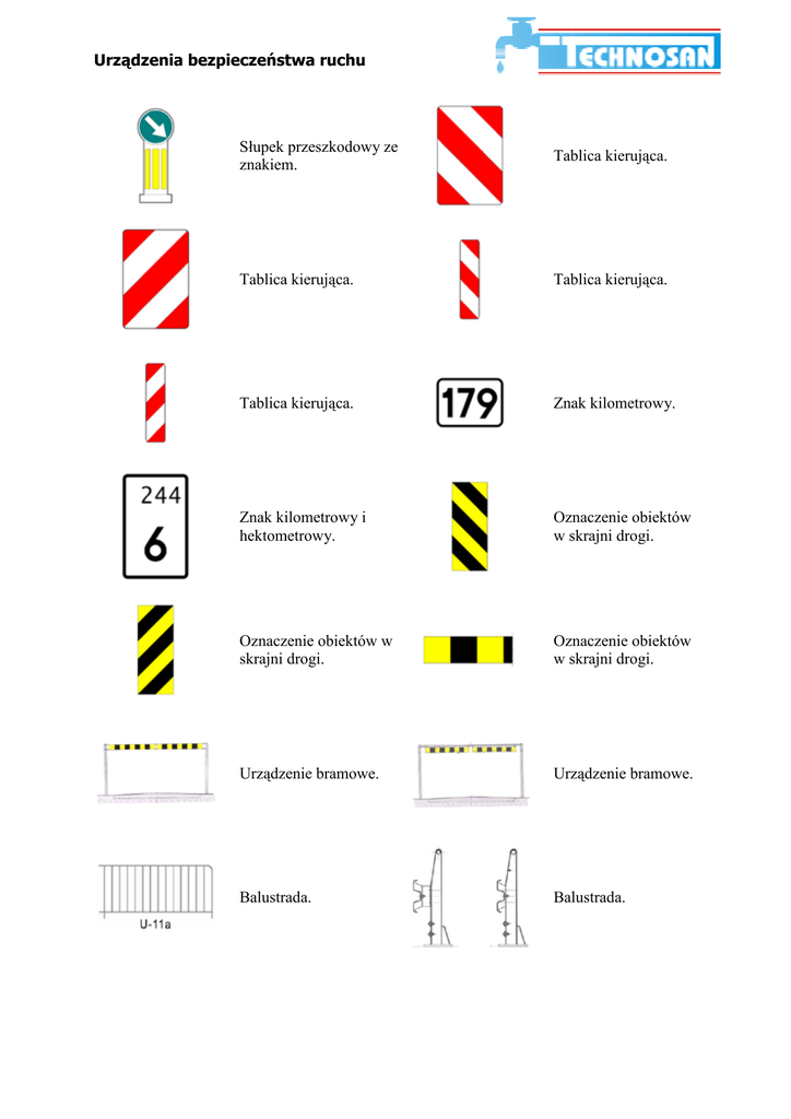 Urządzenia bezpieczeństwa ruchu Słupek przeszkodowy prze ze znakiem. Tablica kierująca. kieruj Tablica kierująca. kieruj Tablica kierująca. kieruj Tablica kierująca. kieruj Znak kilometrowy. Znak kilometrowy i hektometrowy. Oznaczenie obiektów w skrajni drogi. Oznaczenie obiektów w skrajni drogi. Oznaczenie obiektów o w skrajni drogi. Urządzenie ądzenie bramowe. Urzą Urządzenie bramowe. Balustrada. Balustrada. Urządzenia bezpieczeństwa ruchu Ogrodzenie. Ogrodzenie łańcuchowe. Słupek blokujący. blokuj Zapora. Rogatki (zapora). Bariera. Osłona zabezpieczająca. zabezpieczaj Osłona zabezpieczaj zabezpieczająca. Próg zwalniający. zwalniaj Próg zwalniający. zwalniaj Próg zwalniający. zwalniaj Próg zwalniający. zwalniaj Lustro drogowe. Lustro drogowe. Osłona przeciwol przeciwolśnieniowa. Zapora drogowa. Zapora drogowa. Zapora drogowa. Urządzenia bezpieczeństwa ruchu Zapora drogowa. Tablica kierująca. kieruj Tablica kierująca, ki U-21b. Tablica kierująca, kieruj U21c. Tablica kierująca, kieruj U-21d. Tablica kierująca, kieruj U21e. Tablica kierująca, kieruj U-21f. Taśma ostrzegawcza, Taś U-22a. 22a. Taśma śma ostrzegawcza, UU 22-02. Taśma ostrzegawcza, Taś U-22 22-03. Pachołek drogowy, UU 23a. Pachołek drogowy, Pach U-23b. 23b. Pachołek drogowy, UU 23c. Pachołek drogowy, U-23d. 23d. Urządzenia bezpieczeństwa ruchu Tablica uchylna, U-24. U Separator ruchu, UU 25a. Separator ruchu, U-25b. U Tablica ostrzegawcza, U-26. 26. Tablica zamykająca, zamykaj U26a. Tablica zamykająca, zamykaj U-26b. 26b. Tablica zamykająca, z U26c. Tablica zamykająca, zamykaj U-26d. 26d. Tablica wcześnie wcze ostrzegaj ostrzegająca, U-27. Kładka dla pieszych, U-28. 28.