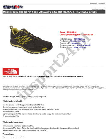 Informacje o produkcie Utworzono 07-03-2017 Męskie buty The North Face LITEWAVE GTX TNF BLACK/ CITRONELLE GREEN Cena : 399,00 zł Cena promocyjna : 299,00 zł sp or t2 4. p l Nr katalogowy : T0CD09C1V Producent : The North Face Dostępność : Dostępny Stan magazynowy : bardzo wysoki Średnia ocena : brak recenzji Męskie buty firmy The North Face model Litewave GTX kolor TNF BLACK/ CITRONELLE GREEN. in Lekkie buty do pieszych wędrówek i górskiej aktywności z doskonale oddychającą, bezszwową, zgrzewaną cholewką. Zapewniają ochronę podczas szybkiego przemieszczania się po niemal każdym terenie. Wyposażone w wodoodporną i oddychającą membranę GORE-TEX, wspierającą technologię Snake Plate i gumową podeszwę zewnętrzną UltrATAC. Średnia waga: 368 g ( pary) / 736 g (para) - męska 9 Właściwości cholewki: wodoodporna i oddychająca membrana GORE-TEX lekka, bezszwowa, zgrzewana konstrukcja cholewki materiał cholewki doskonale oddycha, odprowadzając nadmiar ciepła ochraniacz na palce zgrzewane panele TPU na wysokości środkowej części stopy dla utrzymania struktury 5 mm wkładka EVA Właściwości podeszwy: wtryskiwana środkowa podeszwa EVA technologia TPU Snake Plate dla stabilności i ochrony przedniej części stopy przed kamieniami ekskluzywna, gumowa podeszwa zewnętrzna UltrATAC Technologia: Wygenerowano w programie www.oscGold.com Snake Plate to specjalny trzon TPU, który ma za zadanie zapewnić ochronę dla przedniej części stopy. 4. p l UltrATAC to technologia gumowych podeszw zewnętrznych, która zapewnia maksimum komfortu i trakcji zarówno na suchej, jak i na mokrej nawierzchni. in sp or t2 Pianka EVA to spieniony kopolimer etylenu i octanu winylu o ciężarze 100 kg/m3. Jest bardzo elastycznym porowatym tworzywem posiadającym doskonałe właściwości amortyzujące, ochronne, izolujące, ozdobne. Zastosowanie: akcesoria sportowe, ochraniacze, wykładziny, wkładki amortyzujące w obuwiu sportowym, żeglarstwo, sport, zabawki, akcesoria reklamowe itp. GORE-TEX to znak handlowy zarejestrowany przez międzynarodową korporację W.L. Gore & Associates. W 1969 Bob Gore wynalazł posiadającą mikro-pory membranę, o nadzwyczajnych właściwościach nieprzemakalnych i oddychających. Efektywność tej membrany bazuje na jej charakterystyce strukturalnej. Jest ona ekstremalnie porowata (1,4 miliarda mikroskopijnych porów na cm), lecz każdy por jest do 20.000 razy mniejszy niż kropla wody, a przy tym około 7.000 razy większy niż wyparowująca molekuła wody, powstająca w trakcie perspiracji. W rezultacie pot może swobodnie wyparowywać a deszcz czy wilgoć, panująca na zewnątrz, jest blokowana przez membranę i nie przedostaje się do środka. Membrana GORE-TEX może być nałożona na różne materiały, w zależności od ich wykorzystania i może być używana jako wyściółka zapewniająca najbardziej ochronny mikroklimat dla twoich stóp. GORE-TEX jest materiałem odpornym na wodę, dzięki któremu zawsze będziesz suchy. Odporność na wiatr zapewni Tobie ciepło, a oddychające właściwości zapewnią komfort przez cały dzień. Informacje o produkcie Dostępne opcje Męskie buty The North Face LITEWAVE GTX TNF BLACK/ CITRONELLE GREEN in sp or t2 4. p l Rozmiar: 43, 44. Wygenerowano w programie www.oscGold.com