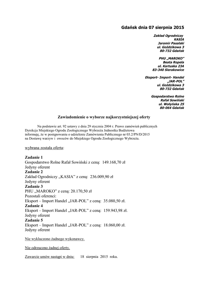 Gdańsk dnia 07 sierpnia 2015 Zakład Ogrodniczy KASIA Jaromir Pasalski ul. Goździkowa 3 80-732 Gdańsk PHU „MAROKO” Beata Ropela ul. Kartuska 23A 83-340 Sierakowice Eksport- Import- Handel „JAR-POL” ul. Goździkowa 3 80-732 Gdańsk Gospodarstwo Rolne Rafał Sowiński ul. Wołyńska 25 80-064 Gdańsk Zawiadomienie o wyborze najkorzystniejszej oferty Na podstawie art. 92 ustawy z dnia 29 stycznia 2004 r. Prawo zamówień publicznych Dyrekcja Miejskiego Ogrodu Zoologicznego Wybrzeża Jednostka Budżetowa informuję, że w postępowaniu o udzielenie Zamówienia Publicznego nr 03.2/PN/D/2015 na Dostawę warzyw i owoców do Miejskiego Ogrodu Zoologicznego Wybrzeża. wybrana została oferta: Zadanie 1 Gospodarstwo Rolne Rafał Sowiński z ceną: 149.168,70 zł Jedyny oferent Zadanie 2 Zakład Ogrodniczy „KASIA” z ceną: 236.009,90 zł Jedyny oferent Zadanie 3 PHU „MAROKO” z ceną: 20.170,50 zł Pozostali oferenci: Eksport – Import Handel „JAR-POL” z ceną: 35.080,50 zł. Zadanie 4 Eksport – Import Handel „JAR-POL” z ceną: 159.943,98 zł. Jedyny oferent Zadanie 5 Eksport – Import Handel „JAR-POL” z ceną: 18.060,00 zł. Jedyny oferent Nie wykluczono żadnego wykonawcy. Nie odrzucono żadnej oferty. Zawarcie umów nastąpi w dniu: 18 sierpnia 2015 roku.