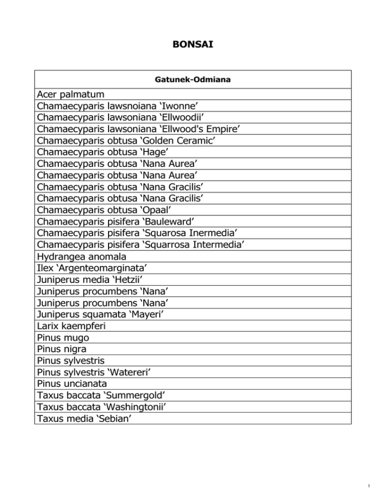 BONSAI Gatunek-Odmiana Acer palmatum Chamaecyparis lawsnoiana ‘Iwonne’ Chamaecyparis lawsoniana ‘Ellwoodii’ Chamaecyparis lawsoniana ‘Ellwood's Empire’ Chamaecyparis obtusa ‘Golden Ceramic’ Chamaecyparis obtusa ‘Hage’ Chamaecyparis obtusa ‘Nana Aurea’ Chamaecyparis obtusa ‘Nana Aurea’ Chamaecyparis obtusa ‘Nana Gracilis’ Chamaecyparis obtusa ‘Nana Gracilis’ Chamaecyparis obtusa ‘Opaal’ Chamaecyparis pisifera ‘Bauleward’ Chamaecyparis pisifera ‘Squarosa Inermedia’ Chamaecyparis pisifera ‘Squarrosa Intermedia’ Hydrangea anomala Ilex ‘Argenteomarginata’ Juniperus media ‘Hetzii’ Juniperus procumbens ‘Nana’ Juniperus procumbens ‘Nana’ Juniperus squamata ‘Mayeri’ Larix kaempferi Pinus mugo Pinus nigra Pinus sylvestris Pinus sylvestris ‘Watereri’ Pinus uncianata Taxus baccata ‘Summergold’ Taxus baccata ‘Washingtonii’ Taxus media ‘Sebian’ 1