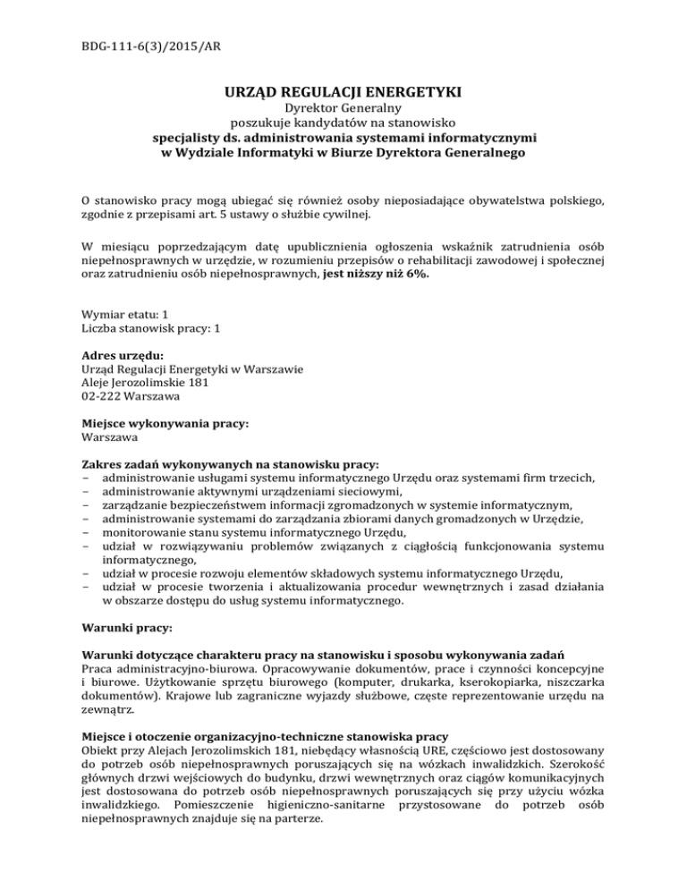 BDG-111-6(3)/2015/AR URZĄD REGULACJI ENERGETYKI Dyrektor Generalny poszukuje kandydatów na stanowisko specjalisty ds. administrowania systemami informatycznymi w Wydziale Informatyki w Biurze Dyrektora Generalnego O stanowisko pracy mogą ubiegać się również osoby nieposiadające obywatelstwa polskiego, zgodnie z przepisami art. 5 ustawy o służbie cywilnej. W miesiącu poprzedzającym datę upublicznienia ogłoszenia wskaźnik zatrudnienia osób niepełnosprawnych w urzędzie, w rozumieniu przepisów o rehabilitacji zawodowej i społecznej oraz zatrudnieniu osób niepełnosprawnych, jest niższy niż 6%. Wymiar etatu: 1 Liczba stanowisk pracy: 1 Adres urzędu: Urząd Regulacji Energetyki w Warszawie Aleje Jerozolimskie 181 02-222 Warszawa Miejsce wykonywania pracy: Warszawa Zakres zadań wykonywanych na stanowisku pracy: administrowanie usługami systemu informatycznego Urzędu oraz systemami firm trzecich, administrowanie aktywnymi urządzeniami sieciowymi, zarządzanie bezpieczeństwem informacji zgromadzonych w systemie informatycznym, administrowanie systemami do zarządzania zbiorami danych gromadzonych w Urzędzie, monitorowanie stanu systemu informatycznego Urzędu, udział w rozwiązywaniu problemów związanych z ciągłością funkcjonowania systemu informatycznego, udział w procesie rozwoju elementów składowych systemu informatycznego Urzędu, udział w procesie tworzenia i aktualizowania procedur wewnętrznych i zasad działania w obszarze dostępu do usług systemu informatycznego. Warunki pracy: Warunki dotyczące charakteru pracy na stanowisku i sposobu wykonywania zadań Praca administracyjno-biurowa. Opracowywanie dokumentów, prace i czynności koncepcyjne i biurowe. Użytkowanie sprzętu biurowego (komputer, drukarka, kserokopiarka, niszczarka dokumentów). Krajowe lub zagraniczne wyjazdy służbowe, częste reprezentowanie urzędu na zewnątrz. Miejsce i otoczenie organizacyjno-techniczne stanowiska pracy Obiekt przy Alejach Jerozolimskich 181, niebędący własnością URE, częściowo jest dostosowany do potrzeb osób niepełnosprawnych poruszających się na wózkach inwalidzkich. Szerokość głównych drzwi wejściowych do budynku, drzwi wewnętrznych oraz ciągów komunikacyjnych jest dostosowana do potrzeb osób niepełnosprawnych poruszających się przy użyciu wózka inwalidzkiego. Pomieszczenie higieniczno-sanitarne przystosowane do potrzeb osób niepełnosprawnych znajduje się na parterze. Pomieszczenia Urzędu zlokalizowane są na II, IV i V piętrze budynku. Wymagania związane ze stanowiskiem pracy: niezbędne: wykształcenie: wyższe techniczne doświadczenie: powyżej 1 roku w obszarze administrowania systemami informatycznymi pozostałe wymagania niezbędne: dobra znajomość przepisów dotyczących informatyzacji działalności podmiotów realizujących zadania publiczne, znajomość standardów zarządzania usługami IT, dobra znajomość środowiska MS Windows serwer 2008 R2, w tym funkcji i ról serwera, dobra znajomość MS SQL Server, dobra znajomość zagadnień związanych z obsługą usług Active Directory (usługa katalogowa dla systemów Windows), DNS (system nazw domenowych) i DHCP (protokół dynamicznego konfigurowania hostów), dobra znajomość protokołu IPv4, dobra znajomość obsługi urządzeń sieciowych (switch, router), dobra znajomość topologii sieci LAN/WAN, dobra znajomość administrowania serwerem Proxy, znajomość języka angielskiego na poziomie komunikatywnym, umiejętność rozwiązywania problemów, komunikatywność, umiejętność pracy w zespole, umiejętność pracy z trudnym klientem, wymagania dodatkowe: wykształcenie wyższe techniczne na kierunku informatyka lub pokrewnym, doświadczenie zawodowe w obszarze administrowania systemami opartymi o technologię Microsoft lub Cisco, przeszkolenie z obsługi i zarządzania systemami opartymi o technologię Microsoft lub Cisco, certyfikat ITIL, dobra znajomość wirtualizacji środowiska serwerowego opartego o Hyper-V, dobra znajomość administrowania serwerami certyfikacji, dobra znajomość obsługi urządzeń sieciowych (switch, router) Cisco, dobra znajomość obsługi urządzeń klasy Cisco ASA 5500, znajomość systemu Trezor, Płatnik, Videotel. Wymagane dokumenty i oświadczenia: życiorys i list motywacyjny, oświadczenie kandydata o wyrażeniu zgody na przetwarzanie danych osobowych do celów rekrutacji, oświadczenie kandydata o korzystaniu z pełni praw publicznych, oświadczenie kandydata o nieskazaniu prawomocnym wyrokiem za umyślne przestępstwo lub umyślne przestępstwo skarbowe, kopie dokumentów potwierdzających wykształcenie, kopia dokumentu potwierdzającego posiadane obywatelstwo lub oświadczenie o posiadanym obywatelstwie, w przypadku osób nieposiadających obywatelstwa polskiego - kopia dokumentu potwierdzającego znajomość języka polskiego zgodnie z rozporządzeniem Prezesa Rady Ministrów w sprawie określenia rodzajów dokumentów potwierdzających znajomość języka polskiego przez osoby nieposiadające obywatelstwa polskiego, ubiegające się o zatrudnienie w służbie cywilnej, kopie dokumentów potwierdzających doświadczenie zawodowe (świadectwa pracy, zaświadczenia o zatrudnieniu, referencje), Inne dokumenty i oświadczenia: kopie dokumentów potwierdzających posiadanie dodatkowych kwalifikacji (certyfikaty językowe, itp.), kopia dokumentu potwierdzającego niepełnosprawność - w przypadku kandydatów, którzy zamierzają skorzystać z pierwszeństwa w zatrudnieniu, w przypadku, gdy znajdą się w gronie najlepszych kandydatów. Termin składania dokumentów: 14.04.2015 r. Miejsce składania dokumentów: Urząd Regulacji Energetyki Biuro Dyrektora Generalnego – Wydział Kadr i Szkoleń Aleje Jerozolimskie 181 02-222 Warszawa z dopiskiem: ”BDG – specjalista” Inne informacje: Oświadczenia muszą być podpisane własnoręcznie. Druki oświadczeń dostępne są na stronie BIP URE. Oferty otrzymane