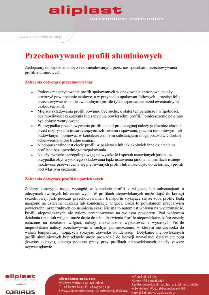 Przechowywanie profili aluminiowych Zachęcamy do zapoznania się z rekomendowanymi przez nas sposobami przechowywania profili aluminiowych. Zalecenia dotyczące przechowywania: • • • • • Podczas magazynowania profili spakowanych w opakowania kartonowe, należy otworzyć powierzchnie czołowe, a w przypadku opakowań foliowych – rozciąć folię i przechowywać w stanie swobodnym (profile tylko separowane przed ewentualnymi uszkodzeniami). Miejsce składowania profili powinno być suche, o stałej temperaturze i wilgotności, bez możliwości zakurzenia lub zapylenia powierzchni profili. Pomieszczenie powinno być dobrze wentylowane. W przypadku przechowywania profili na hali produkcyjnej należy je również chronić przed rozpryskami towarzyszącymi szlifowaniu i spawaniu, pracom remontowym lub budowlanym, ponieważ w kontakcie z innymi substancjami mogą pozostawić drobne odbarwienia, które trudno usunąć. Niedopuszczalne jest cięcie profili w pakietach lub jakiekolwiek inne działanie na profilach bez uprzedniego rozpakowania. Należy zwrócić szczególną uwagę na wysokość i sposób ustawianych jarzm - w przypadku zbyt wysokiego składowania bądź ustawienia jarzma na profilach istnieje możliwość przewrócenia się piętrowanych profili lub może dojść do deformacji profili pod własnym ciężarem. Zalecenia dotyczące profili niepowlekanych Zmiany korozyjne mogą wystąpić w kontakcie profili z wilgocią lub substancjami o odczynach kwaśnych lub zasadowych. W profilach niepowlekanych może dojść do korozji szczelinowej, jeśli podczas przechowywania i transportu stykające się ze sobą profile będą narażone na działanie deszczu lub kondensację wilgoci. Grozi to powstaniem przebarwień powierzchni oraz trudnych do usunięcia skaz. Nie ma to natomiast wpływu na wytrzymałość. Profili niepowlekanych nie należy przechowywać na wolnym powietrzu. Pod wpływem działania tlenu lub wilgoci może dojść do ich odbarwienia Profile niepowlekane, które zostały narażone na działanie wilgoci, należy niezwłocznie wypakować i wysuszyć. Profile niepowlekane należy przechowywać w suchym pomieszczeniu, w którym nie dochodzi do wahań temperatury mogących sprzyjać zjawisku kondensacji. Dotykanie niepowlekanych profili aluminiowych bez rękawic może prowadzić do korozji wywołanej działaniem potu (kwaśny odczyn), dlatego podczas pracy przy profilach niepowlekanych należy zawsze używać rękawic.