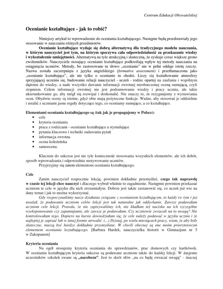 Centrum Edukacji Obywatelskiej Ocenianie kształtujące - jak to robić? Niniejszy artykuł to wprowadzenie do oceniania kształtującego. Następne będą przedstawiały jego stosowanie w nauczaniu różnych przedmiotów. Ocenianie kształtujące wydaje się dobrą alternatywą dla tradycyjnego modelu nauczania, w którym nauczyciel jest tym, na którym spoczywa cała odpowiedzialność za przekazanie wiedzy i wykształcenie umiejętności. Alternatywą na tyle atrakcyjną i skuteczną, że zyskuje coraz większe grono zwolenników. Nauczyciele stosujący ocenianie kształtujące podkreślają wpływ tej metody nauczania na osiągnięcia uczniów. Metody, bo zastosowane tu słowo „ocenianie” nie w pełni oddaje istotę rzeczy. Nazwa została zaczerpnięta z języka angielskiego (formative assessment) i przetłumaczona jako „ocenianie kształtujące”, ale nie tylko o ocenianie tu chodzi. Liczy się kształtowanie atmosfery sprzyjającej uczeniu się, budowanie relacji nauczyciel - uczeń - rodzic opartej na zaufaniu i wspólnym dążeniu do wiedzy, a nade wszystko dawanie informacji zwrotnej nieobarczonej oceną sumującą, czyli stopniem. Celem informacji zwrotnej nie jest podsumowanie wiedzy i pracy ucznia, ale takie ukierunkowanie go, aby mógł się rozwijać i doskonalić. Nie znaczy to, że rezygnujemy z wystawiania ocen. Obydwie oceny są istotne, gdyż obie mają pożyteczne funkcje. Ważne, aby stosować je oddzielnie i ustalić z uczniami jasne reguły dotyczące tego, co oceniamy sumująco, a co kształtująco. Elementami oceniania kształtującego są (tak jak je propagujemy w Polsce): • cele • kryteria oceniania • praca z rodzicami - ocenianie kształtujące a stymulujące • pytania kluczowe i techniki zadawania pytań • informacja zwrotna • ocena koleżeńska • samoocena. Kluczem do sukcesu jest nie tyle konieczność stosowania wszystkich elementów, ale ich dobór, sposób wprowadzania i odpowiednie motywowanie uczniów. Przyjrzyjmy się zatem elementom oceniania kształtującego. Cele Zanim nauczyciel rozpocznie lekcję, powinien dokładnie przemyśleć, czego tak naprawdę w czasie tej lekcji chce nauczyć i dlaczego wybrał właśnie to zagadnienie. Następnie powinien przekazać uczniom te cele w języku dla nich zrozumiałym. Dobrze jest także zastanowić się, co uczeń już wie na dany temat i jak to można wykorzystać. Gdy rozpoczynaliśmy nasze działania związane z ocenianiem kształtującym, to każdy (w tym i ja) uważał, że podawanie uczniom celów lekcji jest tak naturalne jak oddychanie. Zawsze podawałam uczniom cele lekcji. Prawda, że nie zapisywaliśmy ich, nie kładłam też nacisku na ich szczególne wyeksponowanie czy zapamiętanie, ale zawsze je podawałam. Czy uczniowie zwracali na to uwagę? Nie kontrolowałam tego. Dopiero na kursie dowiedziałam się, że cele należy podawać w języku ucznia i że najlepiej je zapisać lub w innej formie utrwalić. (...) Dzisiaj, po wielu miesiącach pracy, wiem, że aby były skuteczne, muszą być bardzo dokładnie przemyślane. W chwili obecnej są one moim priorytetowym elementem oceniania kształtującego. [Barbara Hardek, nauczycielka historii w Gimnazjum nr 5 w Zakopanem] Kryteria oceniania Na ogół stosujemy kryteria oceniania do sprawdzianów, prac domowych czy kartkówek. W ocenianiu kształtującym kryteria sukcesu są podawane uczniom także do każdej lekcji. W żargonie uczestników szkoleń zwane są „nacobezu”. Jest to skrót słów „na co będę zwracać uwagę" - inaczej Centrum Edukacji Obywatelskiej mówiąc - co z tej lekcji uczeń powinien zapamiętać, utrwalić, co będzie decydowało o tym, że cele lekcji zostały osiągnięte. Określanie „nacobezu” przynosi wiele korzyści nie tylko uczniowi, ale również nauczycielowi. Jest formą zawieranego przez nas małego kontraktu z uczniami. W kontrakcie tym podajemy uczniom dokładną informację o tym, co będzie podlegało ocenie. Dzięki temu mogą oni dobrze przygotować się do sprawdzianu, bądź prawidłowo wykonać polecone im zadanie. Kontrakt zobowiązuje nauczyciela do oceniania tylko i wyłącznie tego, co jest zgodne z wcześniejszymi ustaleniami. Ogromnym plusem „nacobezu” jest to, że uczniowie mogą współdecydować o kryteriach wpływających na ocenę ich pracy. Mają świadomość tego, że sami je ustalili, co mobilizuje ich do nauki i zwiększa ich zaangażowanie w pracę nad zleconymi zadaniami. Dzięki „nacobezu” uczniowie czują się pewniej, gdyż wiedzą, że nauczyciel nie zaskoczy ich czymś zupełnie nowym. To pozwala im podczas nauki lub odrabiania pracy domowej zwrócić uwagę na te elementy, które będą podlegały ocenie. [Anna Kozieł, nauczycielka historii w Szkole Podstawowej w Chechle] Jest to element oceniania kształtującego, który przede wszystkim włącza uczniów w odpowiedzialność za własne uczenie się. Pokazuje nauczycielowi i uczniowi, czy cel lekcji został osiągnięty oraz pozwala opanować niezbędne zagadnienia, które chcemy osiągnąć wraz z uczniami na lekcji. Jasne kryteria już na wstępie ukierunkują uczenie się: uczeń wie, co jest ważne, na co powinien położyć większy nacisk lub, po prostu, zwrócić uwagę. Określenie tego, co będzie oceniane, ułatwia i skraca pracę uczniowi i nauczycielowi. Uczeń czuje się bezpieczniej, gdyż wie, co nauczyciel będzie oceniał w jego pracy. (...) Na efekty nie musiałem długo czekać. W trakcie kolejnych lekcji, na których stosowałem jasne kryteria oceniania, uczniowie chętniej odrabiali pracę domową, aktywniej uczestniczyli w zajęciach oraz, co mnie najbardziej ucieszyło, bardzo dobrze napisali sprawdzian wiadomości. Rodzice bardziej aktywnie włączyli się w proces uczenia się ich dzieci, poczuli się bardziej współodpowiedzialni za efekty kształcenia. [Kazimierz Urynowicz, nauczyciel historii w Szkole Podstawowej w Jeleniewie] Praca z rodzicami Bardzo ważne w o