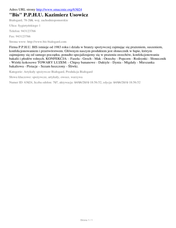 Adres URL strony http://www.smacznie.org/63024 "Bis" P.P.H.U. Kazimierz Usowicz Białogard, 78-200, woj. zachodniopomorskie Ulica: Sygietyńskiego 1 Telefon: 943123766 Fax: 943123766 Strona www: http://www.bis-bialogard.com Firma P.P.H.U. BIS istnieje od 1983 roku i działa w branży spożywczej zajmując się prażeniem, suszeniem, konfekcjonowaniem i przetwórstwem. Głównym naszym produktem jest słonecznik w łupie, którym zajmujemy się od samego początku, ponadto specjalizujemy się w prażeniu orzechów, konfekcjonowaniu bakalii i płodów rolnych. KONFEKCJA: - Fasola - Groch - Mak - Orzechy - Popcorn - Rodzynki - Słonecznik - Wiórki kokosowe TOWARY LUZEM: - Chipsy bananowe - Daktyle - Dynia - Migdały - Mieszanka bakaliowa - Pistacje - Sezam łuszczony - Śliwki. Kategorie: Artykuły spożywcze Białogard, Produkcja Białogard Słowa kluczowe: spożywcze, artykuły, owoce, warzywa Numer ID: 63024, liczba odsłon: 707, aktywacja: 04/06/2010 18:56:52, edycja: 04/06/2010 18:56:52 Strona 1 / 1
