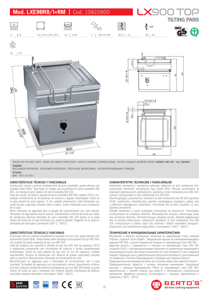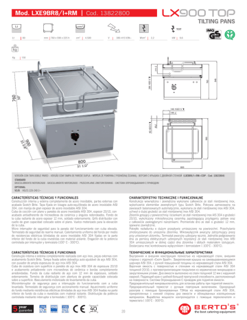 Mod. LXE9BR8/ l+RM | Cod. 13822800 TILTING PANS 80 Kg 150 mm 760 x 590 x 225 h cm2 4.500 V 380-415 V3N~ Wcm2 2,2 kW 9,6 846 30” 760 760 260 H2O ½" 213 Lt 140 H2O ½" 900 40 40 H2O ½" 140 35 3 900/8” 800 31 1/2” 800 VERSIÓN CON TAPA DOBLE PARED - VERSÃO COM TAMPA DE PAREDE DUPLA - WERSJA ZE POKRYWA Z PODWÓJNĄ ŚCIANKĄ - ВЕРСИЯ С КРЫШКА С ДВОЙНОЙ СТЕНКОЙ (LXEBR8/I+RM+CDP - Cod. 13822804) STANDARD BASCULAMIENTO MOTORIZADO - BASCULAMENTO MOTORIZADO - PRZECHYLANIE ZMOTORYZOWANE - СИСТЕМА ОПРОКИДЫВАНИЯ С ПРИВОДОМ OPTIONAL V3/B VOLTS 220-240 3~ CARACTERÍSTICAS TÉCNICAS Y FUNCIONALES CHARAKTERYSTYKI TECHNICZNE I FUNKCJONALNE Construcción interna y externa completamente de acero inoxidable, partes externas con acabado Scotch Brite. Tapa fijada en bisagra auto-equilibrada de acero inoxidable AISI 304, con manija de gran espesor de acero inoxidable AISI 304. Cuba de cocción con plano y paredes de acero inoxidable AISI 304, espesor 20/10, con acabado antiadherente de microesferas de cerámica y ángulos redondeados. Fondo de la cuba radiante de acero espesor 12 mm, soldado externamente. Grifo distribuidor con cuello de gran capacidad colocado sobre el plano. Vuelco motorizado para la elevación de la cuba. Micro interruptor de seguridad para la parada del funcionamiento con cuba elevada. Termostato de seguridad de rearme manual. Calentamiento uniforme del fondo por medio de resistencias eléctricas blindadas de acero inoxidable AISI 304 fijadas en la parte inferior del fondo de la cuba revestidas con material aislante. Erogación de la potencia controlada por interruptor y termostato (100° C - 300°C). Konstrukcje wewnętrzna i zewnętrzna wykonane całkowicie ze stali nierdzewnej inox, wykończenie elementów zewnętrznych typu Scotch Brite. Pokrywa zamocowana na zawiasach balansowanych automatycznie, wykonana ze stali nierdzewnej inox AISI 304, uchwyt o dużej grubości ze stali nierdzewnej inox AISI 304. Zbiornik gotujący z powierzchnią i ściankami ze stali nierdzewnej inox AIS 304 o grubości 20/10, wykończony mikrosferyczną ceramiką zapobiegającą przyleganiu potraw oraz z całkowicie zaokrąglonymi narożnikami. Promieniste dno ze stali o grubości 12 mm, spawane zewnętrznie. Pokrętło rozładunku o dużym przepływie umieszczone na powierzchni. Przechylanie zmotoryzowane do unoszenia zbiornika. Mikrowyłącznik awaryjny zatrzymujący pracę przy uniesionym zbiorniku. Termostat awaryjny uzbrajany ręcznie. Jednolite podgrzewanie dna za pomocą elektrycznych uzbrojonych rezystancji ze stali nierdzewnej inox AISI 304 umieszczonych w dolnej części dna zbiornika i obitych materiałem izolującym. Dostarczana moc kontrolowana wyłącznikiem i termostatem ( 100°C - 300°C). CARACTERÍSTICAS TÉCNICAS E FUNCIONAIS ТЕХНИЧЕСКИЕ И ФУНКЦИОНАЛЬНЫЕ ХАРАКТЕРИСТИКИ Construção interna e externa completamente realizada com aço inox, peças externas com acabamento Scotch Brite. Tampa fixada sobre dobradiça auto-ajustável de aço AISI 304, con puxador de ampla espessura de aço inox AISI 304. Cuba de cozedura com superfície e paredes de aço inox AISI 304 de espessura 20/10 e acabamento antiaderente com microesferas de cerâmica e bordas completamente arredondadas. Fundo da cuba radiante de aço com 12 mm de espessura, soldado externamente. Torneira de distribuição com abertura de grande capacidade colocada sobre a superfície. Basculamento motorizado de levantamento da cuba. Microinterruptor de segurança para a interrupção do funcionamento com a cuba levantada. Termostato de segurança com accionamento manual. Aquecimento uniforme do fundo mediante resistências eléctricas blindadas de aço inox AISI 304 fixadas na parte inferior do fundo da cuba e revestidas com material isolante. Distribuição da potência controlada mediante interruptor e termostato ( 100°C - 300°C). Внутренняя и внешняя конструкция полностью из нержавеющей стали, внешняя сторона с отделкой «Скотч Брайт». Закрепленная крышка на самовыравнивающемся шарнире AISI 304, с ручкой повышенной толщины из нержавеющей стали AISI 304. Варочная емкость с поверхностью и стенками из нержавеющей стали AISI 304 толщиной 20/10, с противоприлипающим покрытием из керамических микрошаров и закругленными углами. Дно емкости выполнено из стали толщиной 12 мм с наружной сваркой. Подающий кран с шейкой большой пропускной способности, расположенный на поверхности. Система Опрокидывания С приводом для поднятия емкости. Предохранительный микровыключатель для останова работы при поднятой емкости. Предохранительный термостат с ручным повторным включением. Однородный разогрев с помощью бронированных ТЭНов из нержавеющей стали AISI 304, прикрепленных с нижней стороны дна емкости и облицованных изоляционным материалом. Выработка мощности контролируется с помощью переключателя и термостата ( 100°C - 300°C). 20
