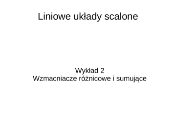 Liniowe układy scalone Wykład 2 Wzmacniacze różnicowe i sumujące Wzmacniacze o wejściu symetrycznym ● ● ● Do wzmacniania małych sygnałów z różnych czujników, występujących na tle dużej składowej sumacyjnej (tłumionej przez wzmacniacz) Wzmacniacz różnicowy (wada – silny wpływ doboru rezystorów na wartość CMRR) Układ ulepszony - wzmacniacz pomiarowy (2 lub więcej wzmacniaczy operacyjnych) CMRR−wsp. tłumienia sygnału współbieżnegowspólnego , sumacyjnego K UR CMRR= K US K UR−wzmocnienie napięciowe składowej różnicowej K US −wzmocnienie napięciowe składowej wspólnej Wzmacniacz różnicowy (odejmujący) Wzmacniacz realizuje odejmowanie napięć wejściowych w stosunku zależnym od wartości rezystorów w układzie ● ● Analiza - patrz tablica Dokładne zrównoważenie wzmacniacza – dobór rezystorów R3 R 4 = R1 R 2 WZMOCNIENIE UO R3 R4 K= = = U 2−U 1 R1 R2 Wzmacniacz różnicowy ● Rezystancja wejściowa dla wejścia odwracającego przy U 2=0 R we= R1 R3 ● Rezystancja wejściowa dla wejścia nieodwracającego przy U 1=0 R we=R 2R 4 ● Kompensacja błędu spowodowanego wejściowymi prądami polaryzującymi R1∥R3=R2∥R4 R1 R3 R2 R 4 = R1 R3 R 2R4 Wzmacniacz różnicowy dokładność ● ● Aby uzyskać większą dokładność (rzędu 0,01%) przyjmuje się tylko 2 wartości rezystorów Wówczas wzmocnienie: UO R2 K= = U 2−U 1 R1 Dokładne zrównoważenie - przykład ● ● Zamiast rezystora R4 – potencjometr Możliwość dokładnego ustawienia zrównoważenia wzmacniacza Wzmacniacz różnicowy z regulacją wzmocnienia ● ● ● ● Regulacja jest utrudniona – wymaga zachowania symetrii rezystorów – w przeciwnym wypadku następuje pogorszenie tłumienia składowej sumacyjnej Potencjometr włączony w taki sposób, że jednocześnie wpływa na rezystancję obu gałęzi układu Regulacja nie zmienia CMRR Regulacja jest nieliniowa !!! R 2 m1 K =2 R1 m Wzmacniacz różnicowy z regulacją wzmocnienia (2) ● ● Aby uzyskać liniowość regulacji – dodatkowy wzmacniacz w pętli sprzężenia o regulowanym wzmocnieniu Wzmocnienie układu zależy liniowo od rezystancji potencjometru R2 R2 K =m R1 Wzmacniacz różnicowy z regulacją wzmocnienia (2) c.d. ● Wady: – W2 wprowadza dodatkowe napięcie niezrównoważenia wzmacniane przez W1 – W2 wprowadza dodatkowe przesunięcie fazy – co wpływa na stabilność W1 W2 Wzmacniacze pomiarowe ● ● ● Parametry prostych wzm. różnicowych na jednym WO w niektórych zastosowaniach nie spełniają stawianych wymagań Przeciwstawność wymagań dotyczących wzmocnienia i Rwe Duża Rwe – trzeba użyć rezystorów o dużych wartościach w pętli sprzężenia zwrotnego – niekorzystne ze względu na niestabilność termiczną i spadki napięć wywołane przez prądy polaryzujące. ● Ograniczenie CMRR spowodowane niesymetrią par rezystorów ● Dla tolerancji rezystorów rzędu 0.1% --> CMRR < 65 dB ● Dla układów K>1000, CMRR > 100 dB i małym dryfie napięcia i prądu niezrównoważenia – stosujemy kilka WO --> wzmacniacze pomiarowe Wzmacniacz pomiarowy 2-elementowy ● ● W1 Dzięki wykorzystaniu 2 wejść (+) uzyskuje się dużą Rwe niezależną od wartości rezystorów Przy spełnieniu warunku: W2 R4 R 1 = R3 R 2 UO R4 R4 K= =1 2 U 1 −U 2 R3 R5 Wzmacniacz pomiarowy 2-elementowy - zalety i wady ● Zalety: ● Regulacja potencjometrem R5 nie wpływa na CMRR, który zależy od doboru par rezystorów: R4, R3 oraz R2, R1. ● ● Wartości rezystorów mogą być mniejsze, łatwiej dobrać ich wartość, gdyż nie wpływają na Rwe Wady: ● ● Zależność dopuszczalnego zakresu składowej sumacyjnej sygnału wej. od wzmocnienia układu Wzmacniacz W1 wzmacnia składową sumacyjną (R1+R2) / R1 razy – może to spowodować nasycenie wzmacniacza Wzmacniacz pomiarowy 3-elementowy ● ● Wzmacniacz różnicowy poprzedzony dwoma wzmacniaczami nieodwracającymi Zakładając: R6 R7 = R 4 R5 R6 R6 R1 R2R3 U o= U 2 −U 1 = U I2 −U I1 R4 R1 R4 UO R6 R2 Zakładając R2 =R3 mamy K = = 12 U I2 −U I1 R4 R1 Wzmacniacz pomiarowy 3-elementowy - cechy ● ● ● ● ● Dobór rezystorów w stopniach wej. nie wpływa na CMRR CMRR zależy od dokładności doboru rezystorów stopnia wyj. oraz od CMRR W3 Układ projektuje się tak, by stopień wej. miał duże K, a stopień wyj. małe K – wówczas nie ma potrzeby stosowania dużych rezystorów w stopniu wyj. – co ułatwia ich dobór Wzmocnienie układu reguluje się rezystorem R1 Wzmocnienie składowej sumacyjnej sygnału W1 i W2 jest zawsze równe 1 i niezależne od wzmocnienia składowej różnicowej – zaleta !!! Wzmacniacz sumacyjny ● ● ● Realizuje dodawanie analogowe napięć ze wzmocnieniem określonym przez dobór rezystorów Analiza – patrz tablica Otrzymane napięcie wyjściowe: U1 U 2 Un U O =−R ... R1 R2 Rn Wzmacniacz sumacyjny (2) ● ● ● Jeżeli wszystkie rezystory na wejściach są równe (= R') to napięcie wyjściowe będzie równe sumie napięć wejściowych pomnożoną przez R / R' Jeżeli rezystancja w pętli sprzężenia zwrotnego R = R' to mamy układ idealnie sumujący z odwróceniem fazy Aby zmniejszyć prądy polaryzujące: Ra =R1∥R2∥...∥R n Wzmacniacz sumująco - odejmujący ● ● Napięcie wyjściowe : U O =F U 3U 4 −U 1 U 2 Otrzymujemy w wyniku połączenia wzmacniaczy różnicowego i sumującego W celu uniknięcia błędów należy pamiętać, aby rezystancje widziane między wejściem wzmacniacza a masą były jednakowe dla obu wejśc wzmacniacza