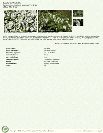Exochorda 'The Bride' Synonim lac.: Exochorda racemosa 'The Bride' obiela 'The Bride' (c) fot. Gabriel Tomżyński TOMŻYŃSKI Szkółka Roślin (c) fot. Bronisław Szmit SZMIT Szkółka Luźny krzew z głównymi pędami wyprostowanymi, a bocznymi szeroko rozłożonymi. Dorasta do 1-1,5 m wys. Liście owalne, jasnozielone. Kwiaty czystobiałe, zebrane w efektowne, zwisające kwiatostany, do 10 cm dł. Nadzwyczajnie obficie kwitnący, V. Wymaga stanowiska słonecznego i dobrych, zasobnych, wilgotnych gleb. Nie znosi wapnia. Polecany do małych ogrodów. autorzy: Magdalena Tomżyńska; APZ, Agencja Promocji Zieleni; grupa roślin liściaste grupa użytkowa liściaste krzewy docelowa wysokość od 1 m do 2 m barwa kwiatów białe pora kwitnienia maj nasłonecznienie stanowisko słoneczne walory ozdobne z kwiatów zastosowanie ogrody przydomowe strefa 5b Copyright © 2013. Związek Szkółkarzy Polskich Wszelkie Prawa Zastrzeżone. Producentów roślin znajdziesz na www.zszp.pl
