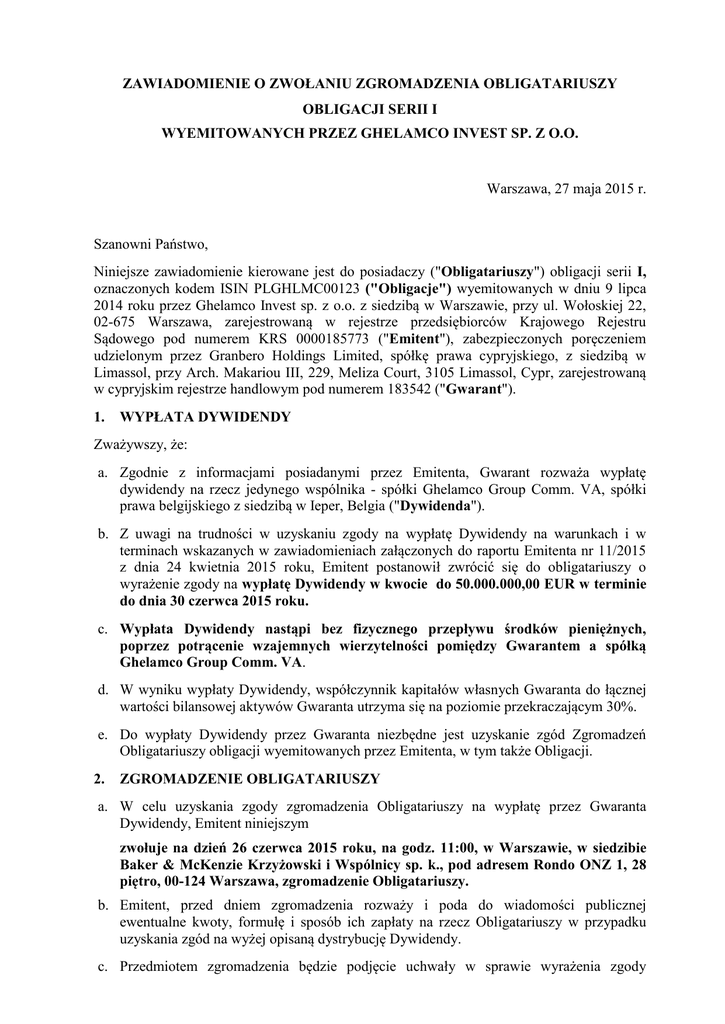 PLGHLMC00123 ("Obligacje"), wyemitowanych w dniu 9 lipca 2014 roku przez Ghelamco