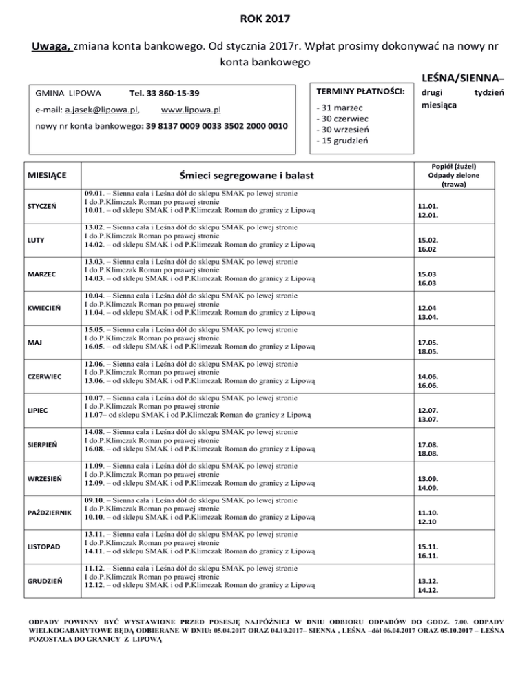 ROK 2017 Uwaga, zmiana konta bankowego. Od stycznia 2017r. Wpłat prosimy dokonywać na nowy nr konta bankowego LEŚNA/SIENNA– GMINA LIPOWA Tel. 33 860-15-39 e-mail: [email protected], www.lipowa.pl nowy nr konta bankowego: 39 8137 0009 0033 3502 2000 0010 MIESIĄCE STYCZEŃ LUTY MARZEC KWIECIEŃ MAJ CZERWIEC LIPIEC SIERPIEŃ WRZESIEŃ PAŹDZIERNIK LISTOPAD GRUDZIEŃ Śmieci segregowane i balast 09.01. – Sienna cała i Leśna dół do sklepu SMAK po lewej stronie I do.P.Klimczak Roman po prawej stronie 10.01. – od sklepu SMAK i od P.Klimczak Roman do granicy z Lipową 13.02. – Sienna cała i Leśna dół do sklepu SMAK po lewej stronie I do.P.Klimczak Roman po prawej stronie 14.02. – od sklepu SMAK i od P.Klimczak Roman do granicy z Lipową 13.03. – Sienna cała i Leśna dół do sklepu SMAK po lewej stronie I do.P.Klimczak Roman po prawej stronie 14.03. – od sklepu SMAK i od P.Klimczak Roman do granicy z Lipową 10.04. – Sienna cała i Leśna dół do sklepu SMAK po lewej stronie I do.P.Klimczak Roman po prawej stronie 11.04. – od sklepu SMAK i od P.Klimczak Roman do granicy z Lipową 15.05. – Sienna cała i Leśna dół do sklepu SMAK po lewej stronie I do.P.Klimczak Roman po prawej stronie 16.05. – od sklepu SMAK i od P.Klimczak Roman do granicy z Lipową 12.06. – Sienna cała i Leśna dół do sklepu SMAK po lewej stronie I do.P.Klimczak Roman po prawej stronie 13.06. – od sklepu SMAK i od P.Klimczak Roman do granicy z Lipową 10.07. – Sienna cała i Leśna dół do sklepu SMAK po lewej stronie I do.P.Klimczak Roman po prawej stronie 11.07– od sklepu SMAK i od P.Klimczak Roman do granicy z Lipową 14.08. – Sienna cała i Leśna dół do sklepu SMAK po lewej stronie I do.P.Klimczak Roman po prawej stronie 16.08. – od sklepu SMAK i od P.Klimczak Roman do granicy z Lipową 11.09. – Sienna cała i Leśna dół do sklepu SMAK po lewej stronie I do.P.Klimczak Roman po prawej stronie 12.09. – od sklepu SMAK i od P.Klimczak Roman do granicy z Lipową 09.10. – Sienna cała i Leśna dół do sklepu SMAK po lewej stronie I do.P.Klimczak Roman po prawej stronie 10.10. – od sklepu SMAK i od P.Klimczak Roman do granicy z Lipową 13.11. – Sienna cała i Leśna dół do sklepu SMAK po lewej stronie I do.P.Klimczak Roman po prawej stronie 14.11. – od sklepu SMAK i od P.Klimczak Roman do granicy z Lipową 11.12. – Sienna cała i Leśna dół do sklepu SMAK po lewej stronie I do.P.Klimczak Roman po prawej stronie 12.12. – od sklepu SMAK i od P.Klimczak Roman do granicy z Lipową TERMINY PŁATNOŚCI: - 31 marzec - 30 czerwiec - 30 wrzesień - 15 grudzień drugi miesiąca tydzień Popiół (żużel) Odpady zielone (trawa) 11.01. 12.01. 15.02. 16.02 15.03 16.03 12.04 13.04. 17.05. 18.05. 14.06. 16.06. 12.07. 13.07. 17.08. 18.08. 13.09. 14.09. 11.10. 12.10 15.11. 16.11. 13.12. 14.12. ODPADY POWINNY BYĆ WYSTAWIONE PRZED POSESJĘ NAJPÓŹNIEJ W DNIU ODBIORU ODPADÓW DO GODZ. 7.00. ODPADY WIELKOGABARYTOWE BĘDĄ ODBIERANE W DNIU: 05.04.2017 ORAZ 04.10.2017– SIENNA , LEŚNA –dół 06.04.2017 ORAZ 05.10.2017 – LEŚNA POZOSTAŁA DO GRANICY Z LIPOWĄ