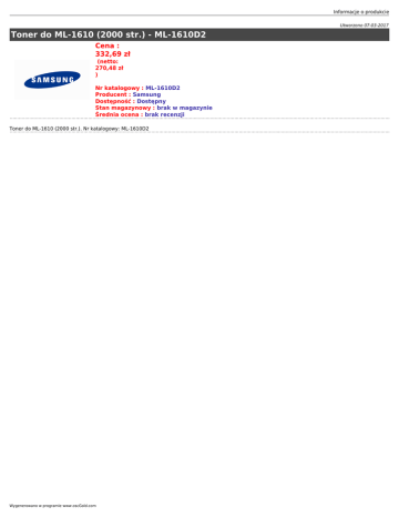Informacje o produkcie Utworzono 07-03-2017 Toner do ML-1610 (2000 str.) - ML-1610D2 Cena : 332,69 zł (netto: 270,48 zł ) Nr katalogowy : ML-1610D2 Producent : Samsung Dostępność : Dostępny Stan magazynowy : brak w magazynie Średnia ocena : brak recenzji Toner do ML-1610 (2000 str.). Nr katalogowy: ML-1610D2 Wygenerowano w programie www.oscGold.com