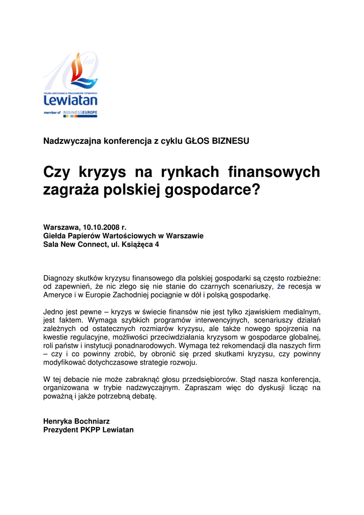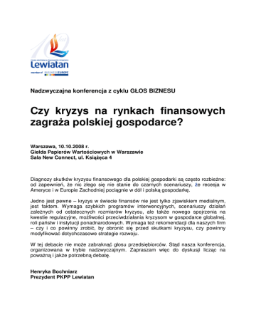 Nadzwyczajna konferencja z cyklu GŁOS BIZNESU Czy kryzys na rynkach finansowych zagraża polskiej gospodarce? Warszawa, 10.10.2008 r. Giełda Papierów Wartościowych w Warszawie Sala New Connect, ul. Książęca 4 Diagnozy skutków kryzysu finansowego dla polskiej gospodarki są często rozbieżne: od zapewnień, że nic złego się nie stanie do czarnych scenariuszy, że recesja w Ameryce i w Europie Zachodniej pociągnie w dół i polską gospodarkę. Jedno jest pewne – kryzys w świecie finansów nie jest tylko zjawiskiem medialnym, jest faktem. Wymaga szybkich programów interwencyjnych, scenariuszy działań zależnych od ostatecznych rozmiarów kryzysu, ale także nowego spojrzenia na kwestie regulacyjne, możliwości przeciwdziałania kryzysom w gospodarce globalnej, roli państw i instytucji ponadnarodowych. Wymaga też rekomendacji dla naszych firm – czy i co powinny zrobić, by obronić się przed skutkami kryzysu, czy powinny modyfikować dotychczasowe strategie rozwoju. W tej debacie nie może zabraknąć głosu przedsiębiorców. Stąd nasza konferencja, organizowana w trybie nadzwyczajnym. Zapraszam więc do dyskusji licząc na poważną i jakże potrzebną debatę. Henryka Bochniarz Prezydent PKPP Lewiatan PROGRAM 10.30 11.00 Rejestracja, poranna kawa Otwarcie konferencji Henryka Bochniarz – PKPP Lewiatan Wprowadzenie Jan Vincent-Rostowski – Minister Finansów 11.30 Panel ekspertów: Od diagnozy do rekomendacji Moderator: Jan Krzysztof Bielecki – Bank Pekao SA Uczestnicy: Mirosław Gronicki – Goldman Sachs , Maciej Krzak – PKPP Lewiatan, Leszek Zienkowski – PAN, Małgorzata Krzysztoszek – PKPP Lewiatan, Wiktor Askanas 12:30 Przerwa kawowa 13.00 Panel regulatorów: Ocena skutków kryzysu i niezbędne kroki z perspektywy regulatorów rynku Moderator: Jacek Socha – PricewaterhouseCoopers Uczestnicy: Lesław Gajek – Komisja Nadzoru Finansowego, Ludwik Sobolewski – Giełda Papierów Wartościowych w Warszawie, Piotr Wiesiołek – NBP, Zofia Barbara Liberda – GUS, Beata Stelmach – SEG, Małgorzata Zaleska – BFG 14.00 Panel przedsiębiorców: Jak kryzys na rynkach finansowych wpływa na realną gospodarkę Moderator: Henryka Bochniarz – PKPP Lewiatan Uczestnicy: Sławomir S. Sikora – Citi Handlowy, Enrico Pavoni – Fiat Polska, Francois Colombie – Auchan Polska, Sławomir Jędrzejczyk – PKN Orlen, Paweł Smoleń – Vattenfall Heat Poland, Zygmunt Kostkiewicz – Commercial Union Polska, Beata Gessel – GESSEL, Andrzej Krzemiński – EFL 15.00 Podsumowanie konferencji KARTA ZGŁOSZENIOWA Czy kryzys na rynkach finansowych zagraża polskiej gospodarce? Warszawa, 10 października 2008, Giełda Papierów Wartościowych w Warszawie, Sala New Connect, ul. Książęca 4 UDZIAŁ BEZPŁATNY Imię i nazwisko Stanowisko Firma Adres Tel.: Fax: e-mail: Podpis i pieczątka Zgłoszenia prosimy przesyłać do 9 października 2008 r. fax: (22) 845 95 51, mail: [email protected] [email protected] Liczba uczestników ograniczona. Decyduje kolejność zgłoszeń.