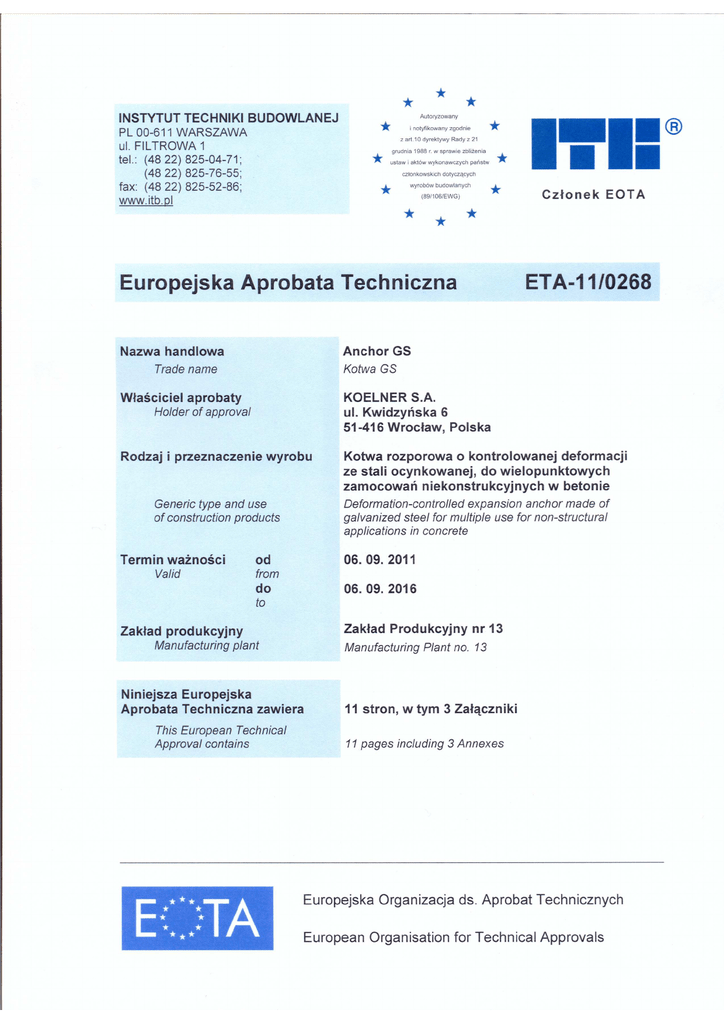 Strona 2 Europejskiej Aprobaty Technicznej ETA-11/0268, wydanej XX sierpnia 2011 r. I PODSTAWY PRAWNE I OGÓLNE WARUNKI UDZIELANIA EUROPEJSKICH APROBAT TECHNICZNYCH 1. Niniejsza Europejska Aprobata Techniczna została wydana przez Instytut Techniki Budowlanej zgodnie z: – Dyrektywą Rady 89/106/EWG z 21 grudnia 1988 r. w sprawie zbliĪenia ustaw i aktów wykonawczych PaĔstw Członkowskich dotyczących wyrobów budowlanych1, z poprawkami zawartymi w Dyrektywie Rady 93/68/EWG z 22 lipca 19932; – ustawą z dnia 16 kwietnia 2004 r. o wyrobach budowlanych3; – rozporządzeniem Ministra Infrastruktury z dnia 14 paĨdziernika 2004 r. w sprawie europejskich aprobat technicznych oraz polskich jednostek organizacyjnych upowaĪnionych do ich wydawania4; – Wspólnymi zasadami proceduralnymi składania wniosków, opracowywania i udzielania Europejskich Aprobat Technicznych, okreĞlonymi w załączniku do Decyzji Komisji 94/23/EC5; – Wytycznymi do europejskich aprobat technicznych ”Kotwy metalowe do stosowania w betonie – CzĊĞü 6: Kotwy metalowe do montaĪowych zamocowaĔ wielopunktowych”, ETAG 001-06. 2. Instytut Techniki Budowlanej jest upowaĪniony do sprawdzania, czy są spełnione wymagania niniejszej Europejskiej Aprobaty Technicznej. Sprawdzanie moĪe odbywaü siĊ w zakładzie produkcyjnym. NiezaleĪnie od tego odpowiedzialnoĞü za zgodnoĞü wyrobów z Europejską Aprobatą Techniczną i za ich przydatnoĞü do zamierzonego stosowania ponosi właĞciciel Europejskiej Aprobaty Technicznej. 3. Prawa do niniejszej Europejskiej Aprobaty Technicznej nie mogą byü przenoszone na producentów, przedstawicieli producentów lub zakłady produkcyjne nie wymienione na stronie 1 niniejszej Europejskiej Aprobaty Technicznej. 4. Niniejsza Europejska Aprobata Techniczna moĪe byü wycofana przez Instytut Techniki Budowlanej, w szczególnoĞci po informacji Komisji Europejskiej w trybie art. 5 ust. 1 Dyrektywy 89/106/EWG. 5. Niniejsza Europejska Aprobata Techniczna moĪe byü kopiowana, włączając w to Ğrodki przekazu elektronicznego, jedynie w całoĞci. Publikowanie czĊĞci dokumentu jest moĪliwe po uzyskaniu pisemnej zgody Instytutu Techniki Budowlanej. W tym przypadku na kopii powinna byü podana informacja, Īe jest to fragment dokumentu. Teksty i rysunki w materiałach reklamowych nie mogą byü sprzeczne z Europejską Aprobatą Techniczną. 6. Europejska Aprobata Techniczna jest wydawana przez jednostkĊ aprobującą w jĊzyku oficjalnym tej jednostki i w pełni odpowiada wersji uzgodnionej w ramach EOTA. Inne wersje jĊzykowe powinny zawieraü informacjĊ, Īe są to tłumaczenia. 1 Dziennik UrzĊdowy Wspólnot Europejskich Nr L. 40, 11.02.1989, p. 12 Dziennik UrzĊdowy Unii Europejskiej Nr L. 220, 30.08.1993, p. 1 3 Dziennik Ustaw Rzeczypospolitej Polskiej Nr 92/2004, poz. 881 4 Dziennik Ustaw Rzeczypospolitej Polskiej Nr 237/2004, poz. 2375 5 Dziennik UrzĊdowy Unii Europejskiej Nr L. 17, 20.01.1994, p. 34 2 Strona 3 Europejskiej Aprobaty Technicznej ETA-11/0268, wydanej XX sierpnia 2011 r. II SZCZEGÓŁOWE WARUNKI DOTYCZĄCE EUROPEJSKIEJ APROBATY TECHNICZNEJ 1 OkreĞlenie wyrobu i zakresu jego stosowania 1.1 OkreĞlenie wyrobu Przedmiotem niniejszej aprobaty są kotwy GS o Ğrednicy Ø6, wykonane ze stali ocynkowanej. KotwĊ wprowadza siĊ w wywiercony otwór, a zakotwienie nastĊpuje poprzez rozprĊĪenie o kontrolowanej deformacji. KotwĊ i jej zamocowanie w podłoĪu pokazano w Załącznikach 1 i 2. 1.2 Zakres stosowania Kotwy GS są przeznaczone do stosowania w zamocowaniach spełniających wymagania bezpieczeĔstwa uĪytkowania w rozumieniu Wymagania Podstawowego 4 dyrektywy 89/106/EWG, których zniszczenie moĪe powodowaü powstanie warunków zagraĪających Īyciu ludzkiemu. Kotwy mogą byü stosowane tylko do wykonywania montaĪowych zamocowaĔ wielopunktowych. DefinicjĊ zamocowaĔ wielopunktowych według poszczególnych paĔstw członkowskich podano w Załączniku 1 (informacyjnym) do ETAG 001, CzĊĞü 6. Kotwy mogą byü stosowane tylko do wykonywania zamocowaĔ elementów statycznie obciąĪonych lub przyjmowanych jako statycznie obciąĪone, w podłoĪu ze zbrojonego lub niezbrojonego betonu zwykłego klasy nie niĪszej niĪ C20/25 i nie wyĪszej niĪ C50/60 według normy EN 206-1. Zamocowania mogą byü wykonywane w betonie zarysowanym lub niezarysowanym. Kotwy mogą byü stosowane tylko w konstrukcjach znajdujących siĊ w suchych warunkach wewnĊtrznych. Postanowienia niniejszej Europejskiej Aprobaty Technicznej oparte są na załoĪeniu przewidywanego 50-letniego okresu uĪytkowania kotwy. ZałoĪenie dotyczące okresu uĪytkowania wyrobu nie moĪe byü interpretowane jako gwarancja udzielana przez producenta lub jednostkĊ aprobującą, ale jako informacja, która moĪe byü wykorzystana przy wyborze odpowiedniego wyrobu, w związku z przewidywanym, ekonomicznie uzasadnionym okresem uĪytkowania obiektu. 2 WłaĞciwoĞci wyrobu i metody ich sprawdzania 2.1 WłaĞciwoĞci wyrobu Kotwy odpowiadają rysunkom i opisom podanym w Załącznikach 1 i 2. WłaĞciwoĞci materiałów, wymiary i tolerancje wymiarów kotew, nie podane w Załącznikach, powinny odpowiadaü właĞciwoĞciom materiałów, wymiarom i tolerancjom zawartym w dokumentacji technicznej6 niniejszej Europejskiej Aprobaty Technicznej. 6 Dokumentacja techniczna niniejszej Europejskiej Aprobaty Technicznej jest przechowywana w Instytucie Techniki Budowlanej i moĪe byü udostĊpniona tylko jednostce notyfikowanej, uczestniczącej w procedurze oceny zgodnoĞci. Strona 4 Europejskiej Aprobaty Technicznej ETA-11/0268, wydanej XX sierpnia 2011 r. Z uwagi na wymagania związane z bezpieczeĔstwem poĪarowym, przyjmuje siĊ, Īe kotwy spełniają wymagania okreĞlone dla klasy A1 reakcji na ogieĔ, zgodnie z decyzją Komisji Europejskiej 96/603/EC, wersje poprawione 2000/605/EC i 2003/424/EC. Potrzebne do projektowania zamocowaĔ wielkoĞci charakterystyczne podano w Załączniku 3. KaĪdy łeb kotwy p