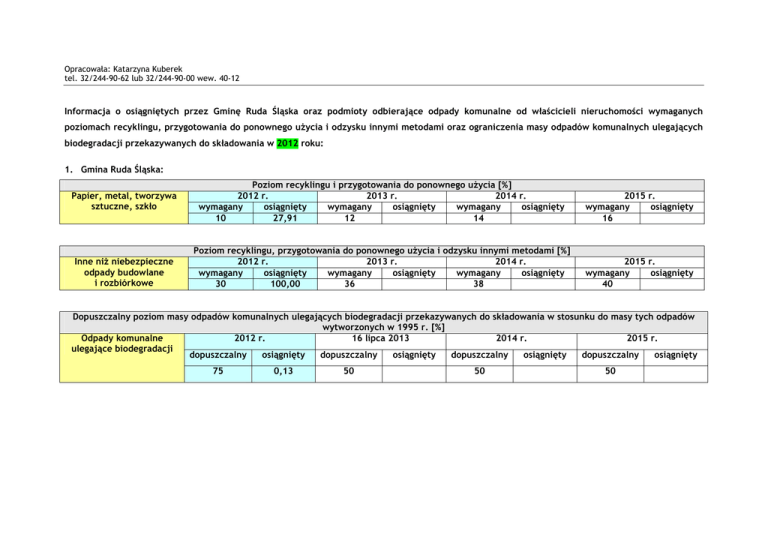 Opracowała: Katarzyna Kuberek tel. 32/244-90-62 lub 32/244-90-00 wew. 40-12 Informacja o osiągniętych przez Gminę Ruda Śląska oraz podmioty odbierające odpady komunalne od właścicieli nieruchomości wymaganych poziomach recyklingu, przygotowania do ponownego użycia i odzysku innymi metodami oraz ograniczenia masy odpadów komunalnych ulegających biodegradacji przekazywanych do składowania w 2012 roku: 1. Gmina Ruda Śląska: Papier, metal, tworzywa sztuczne, szkło Inne niż niebezpieczne odpady budowlane i rozbiórkowe Poziom recyklingu i przygotowania do ponownego użycia [%] 2012 r. 2013 r. 2014 r. wymagany osiągnięty wymagany osiągnięty wymagany osiągnięty 10 27,91 12 14 2015 r. wymagany osiągnięty 16 Poziom recyklingu, przygotowania do ponownego użycia i odzysku innymi metodami [%] 2012 r. 2013 r. 2014 r. wymagany osiągnięty wymagany osiągnięty wymagany osiągnięty 30 100,00 36 38 2015 r. wymagany osiągnięty 40 Dopuszczalny poziom masy odpadów komunalnych ulegających biodegradacji przekazywanych do składowania w stosunku do masy tych odpadów wytworzonych w 1995 r. [%] Odpady komunalne 2012 r. 16 lipca 2013 2014 r. 2015 r. ulegające biodegradacji dopuszczalny osiągnięty dopuszczalny osiągnięty dopuszczalny osiągnięty dopuszczalny osiągnięty 75 0,13 50 50 50