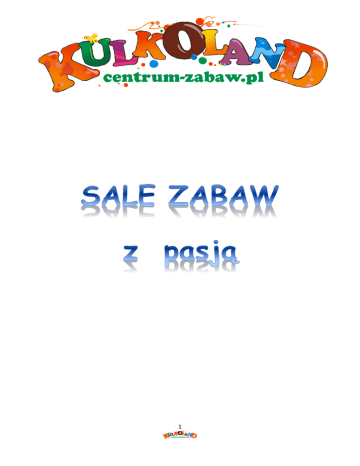 1 KULKOLAND jest to wymarzone miejsce do spędzania wolnego czasu dla dzieci, całych rodzin oraz grup przedszkolnych i uczniów szkół podstawowych do 10 lat. Można pobawić się na : piętrowej konstrukcji z przeszkodami, pomalować buzię, przebrać się za ulubioną postać z bajki, pobawić się w suchym basenie, poskakać na trampolinie, pozjeżdżać na zjeżdżalniach, pograć na Play Station, pooglądać projekcję bajek animowanych w salce kinowej, przeżyć nie zapomniane przyjęcia urodzinowe oraz dużo, dużo więcej … Rodzice mogą uczestniczyć w zabawie lub odpocząć w kawiarence delektując się wyśmienitą kawą, słodkim poczęstunkiem, korzystając z bezprzewodowego dostępu do Internetu i prasy codziennej. 2 DLA TWOJEGO DZIECKA W KTÓREJ ZAPEWNIAMY WESOŁĄ NIEZAPOMNIANĄ I PRZEDEWSZYSTKIM BEZPIECZNĄ ZABAWĘ W PIĘKNEJ BAJKOWEJ OPRAWIE. 3 - URODZINY DLA DZIECI - BAJKOWE NOCE - OPIEKA NAD DZIEMI - SPOTKANIE MIKOŁAJOWE - ZABAWA ANDRZEJKOWA - DZIEŃ WOLNY OD SZKOŁY - BAL KARNAWAŁOWY - SYLWESTROWA NOC - FERIE ZIMOWE - PÓŁKOLONIE WAKACYJNE - DZIEŃ DZIECKA - DNI Z ANIMATOREM - HALLOWEEN - IMPREZY MIKOŁAJKOWE DLA GRUP SZKOLNYCH I PRZEDSZKOLNYCH. - PRZYJMUJEMY GRUPY SZKOLNE I PRZEDSZKOLNE. - ORGANIZUJEMY IMPREZY DLA FIRM - KARNETY WEJŚCIOWE DLA FIRM - CAŁOROCZNA WYPOŻYCZALNIA STROJÓW - FESTYNY PLENEROWE - ORGANIZUJEMY W LOKALACH ZABAWY DLA DZIECI NA PRZYJĘCIACH : KOMUNIE CHRZCINY WESELA IMPREZY OKOLICZNOŚCIOWE I INNE 4 Urodziny to magiczny i wyczekiwany przez każde dziecko dzień. Dziecko czuje się wtedy wyjątkowo. Ażeby dzień ten był niezapomniany dla twojego dziecka proponujemy zorganizowanie przyjęcia urodzinowego w Kulkolandzie. Mogą Państwo zorganizować swojemu dziecku przyjęcie unikając wszystkich związanych z tym trudności i problemów. Prosimy zarezerwować salkę urodzinową na konkretny dzień i wybraną godzinę. Później dzieci będą się bawić, a Państwo będą mogli usiąść w kawiarence i napić się kawy, poczytać aktualna prasę albo skorzystać z Internetu WiFi. Przyjęcia odbywają się przez cały tydzień w wybranych przez Państwa godzinach. Można u nas organizować przyjęcia 3 - godzinne! 5 Czy nie potrafisz oprzeć się czekoladzie? Jeśli tak, to ta czekoladowa fontanna jest spełnieniem twoich słodkich marzeń. Produkt ten ucieszy nie tylko Twoje podniebienie, ale również zaoferuje ciekawe doznania wzrokowe. Czekolada zostanie przetransportowana do góry, po czym spłynie niczym kaskada do dolnej części urządzenia. Proszę zanurzyć teraz np. banany, truskawki lub inne łakocie, które dużo lepiej smakują w czekoladzie. Nasza fontanna jest idealna dla łakomczuchów w każdym wieku i stanowi atrakcję każdego przyjęcia. Istnieje możliwość wynajęcia Fontanny Czekoladowej w Kulkolandzie. 6 Zaproś naszych animatorów do swojego domu lub ogrodu, a Oni zorganizują dla twojego dziecka niezapomniane urodziny z mnóstwem atrakcji: Dmuchaniec „ Skakaniec ” Malowanie twarzy Przebieranie w stroje Bańki Opiekę dwóch animatorów zabaw Ciekawy scenariusz przygotowany pod indywidualnego klienta ( o dowolnej tematyce ) lub wybranie gotowego scenariusza przygotowanego przez Nas np. Piraci, Księżniczki, Piłkarze itp. Czas trwania Kinder Party do 3- godzin. W tajemnicy przed Solenizantem zarezerwuj termin przyjęcia. Nic nie mówiąc dziecku zaproś gości i poproś ich, aby byli punktualnie! 10 Minut przed wyznaczoną godziną. TO BĘDZIE ZASKOCZENIE! My przygotujemy tort i poczęstunek, a nasi Animatorzy przywitają Waszych gości i poprowadzą zabawę. Z pełną ofertą oraz szczegółowymi informacjami dotyczącymi SEKRETNYCH PRZYJĘĆ możecie się Państwo zapoznać bezpośrednio w naszym Centrum Zabaw "KULKOLAND" oraz pod numerami DĘBICA tel. 14 666 58 56 lub 506 636 087. MIELEC tel. 17 250 65 45 lub 507 840 804. 7 Serdecznie zapraszamy dzieci w wieku od 2 do 10 Lat. Na wyjątkowy Ball Halloween, odwiedzą nas przyjazne duszki ze starego zamku. Wszystko, co straszy jest w tym dniu dopuszczalne, ale trzeba pamiętać, że jest to nadal zabawa. Podstawowe kolory to pomarańczowy, fiolet, seledyn oraz biały z czarnym, Tych kolorów używa się zarówno do przyozdabiania domów, malowania twarzy czy przygotowania strasznych słodyczy... Konieczna wcześniejsza rezerwacja ze względu na ograniczona liczbę miejsc. 8 Nie ma lekcji w szkole, twoje dziecko nudzi się w domu, musisz iść do pracy i nie masz z kim zostawić pociechy... Przyprowadź dziecko na cały dzień do Kulkolandu. Zapewniamy: drugie śniadanie gry i zabawy na terenie Kulkolandu opiekę animatorek malowanie twarzy zajęcia plastyczne konkursy z nagrodami coś na ciepło JUŻ DZIŚ ZAPYTAJ O KOLEJNY WOLNY DZIEŃ OD SZKOŁY SZCZEGÓŁY U OBSŁUGI KULKOLANDU 9 W okresie ferii zimowych i wakacji letnich na terenie KULKOLANDU odbywają się 5-cio dniowe turnusy półkolonijne. Każdy turnus ma swój temat przewodni, wokół którego staramy się zorganizować zabawy i wycieczki. Zapraszamy dzieci na BAŚNIOWE NOCE w KULKOLANDZIE. O godz. 19.00 rozpoczynamy wspólną zabawę, która potrwa aż do godz. 9.30 dnia następnego. Dla dzieci wspaniała zabawa, a dla rodziców wolny wieczór! Zapraszamy również na BAŚNIOWE WIECZORKI które odbywać się będą w tym samym terminie co BAŚNIOWE NOCE jednak zabawa potrwa krócej ponieważ do godz. 24:00 Szczegółowe Informacje u obsługi Sali Zabaw. 10 Organizują Państwo piknik lub imprezę firmową dla swoich pracowników? Spotkanie świąteczne, zabawę Karnawałową lub Andrzejkową? My zadbamy o dobrą zabawę dla najmłodszych. Przygotujemy dla dzieci: gry i zabawy w Państwa Firmie lub w dowolnie wskazanym miejscu lub też u Nas w KULKOLANDZIE . Zapraszamy do współpracy. Posiadamy w Swojej ofercie: - dmuchany zamek - bańki mydlane duże - i inne Jesteśmy Firmą, która zajmuje się organizacją imprez i zabaw dla dzieci. - komunie - wesela – chrzciny oraz inne imprezy okoliczn