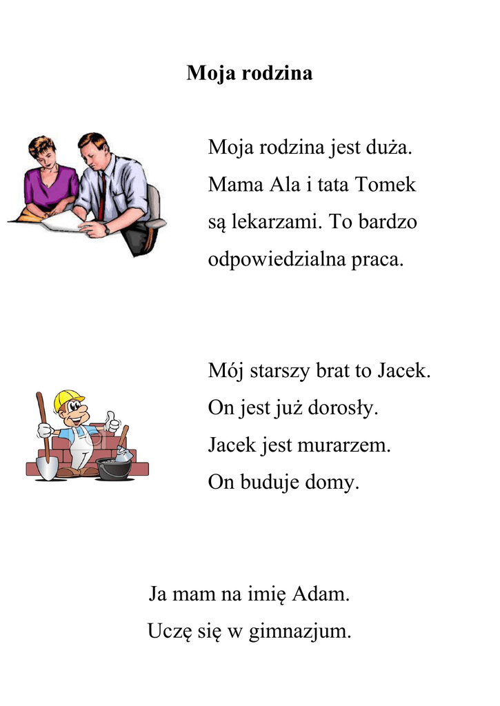 Moja rodzina Moja rodzina jest duża. Mama Ala i tata Tomek są lekarzami. To bardzo odpowiedzialna praca. Mój starszy brat to Jacek. On jest już dorosły. Jacek jest murarzem. On buduje domy. Ja mam na imię Adam. Uczę się w gimnazjum. Mam też młodsze siostry. Sylwia i Natalia są bliźniaczkami. Oznacza to, że wyglądają tak samo. Uczą się w szkole podstawowej. Ubierają się zawsze tak samo. Czasem trudno je rozpoznać nawet rodzicom. Ola jest moją najmłodszą siostrą. Ona jest całkiem mała. Uczy się dopiero chodzić i mówić. Wszyscy bardzo się kochamy.