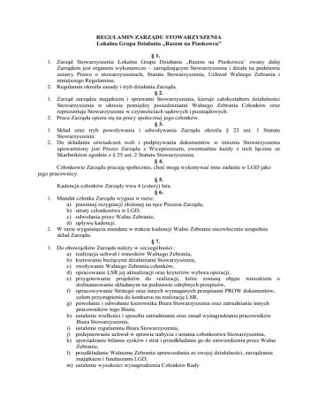 REGULAMIN ZARZĄDU STOWARZYSZENIA Lokalna Grupa Działania „Razem na Piaskowcu” § 1. 1. Zarząd Stowarzyszenia Lokalna Grupa Działania „Razem na Piaskowcu’ zwany dalej Zarządem jest organem wykonawczo – zarządzającym Stowarzyszenia i działa na podstawie ustawy Prawo o stowarzyszeniach, Statutu Stowarzyszenia, Uchwał Walnego Zebrania i niniejszego Regulaminu. 2. Regulamin określa zasady i tryb działania Zarządu. § 2. 1. Zarząd zarządza majątkiem i sprawami Stowarzyszenia, kieruje całokształtem działalności Stowarzyszenia w okresie pomiędzy posiedzeniami Walnego Zebrania Członków oraz reprezentuje Stowarzyszenie w czynnościach sądowych i pozasądowych. 2. Praca Zarządu opiera się na pracy społecznej jego członków. § 3. 1. Skład oraz tryb powoływania i odwoływania Zarządu określa § 23 ust. 1 Statutu Stowarzyszenia. 2. Do składania oświadczeń woli i podpisywania dokumentów w imieniu Stowarzyszenia upoważniony jest Prezes Zarządu z Wiceprezesem, ewentualnie każdy z nich łącznie ze Skarbnikiem zgodnie z § 25 ust. 2 Statutu Stowarzyszenia. § 4. Członkowie Zarządu pracują społecznie, choć mogą wykonywać inne zadania w LGD jako jego pracownicy. § 5. Kadencja członków Zarządy trwa 4 (cztery) lata. § 6. 1. Mandat członka Zarządu wygasa w razie: a) pisemnej rezygnacji złożonej na ręce Prezesa Zarządu, b) utraty członkostwa w LGD, c) odwołania przez Walne Zebranie, d) upływu kadencji. 2. W razie wygaśnięcia mandatu w trakcie kadencji Walne Zebranie niezwłocznie uzupełnia skład Zarządu. § 7. 1. Do obowiązków Zarządu należy w szczególności : a) realizacja uchwał i wniosków Walnego Zebrania, b) kierowanie bieżącymi działaniami Stowarzyszenia, c) zwoływanie Walnego Zebrania członków, d) opracowanie LSR jej aktualizacji oraz kryteriów wyboru operacji, e) przygotowanie projektów do realizacji, które zostaną objęte wnioskiem o dofinansowanie składanym na podstawie odrębnych przepisów, f) opracowywanie Strategii oraz innych wymaganych przepisami PROW dokumentów, celem przystąpienia do konkursu na realizację LSR, g) powołanie i odwołanie kierownika Biura Stowarzyszenia oraz zatrudnianie innych pracowników tego Biura, h) ustalenie wielkości i sposobu zatrudniania oraz zasad wynagradzania pracowników Biura Stowarzyszenia, i) ustalenie regulaminu Biura Stowarzyszenia, j) podejmowanie uchwał w sprawie nabycia i ustania członkostwa Stowarzyszenia, k) sporządzanie bilansu zysków i strat i przedkładanie go do zatwierdzenia przez Walne Zebranie, l) przedkładanie Walnemu Zebraniu sprawozdania ze swojej działalności, zarządzania majątkiem i funduszami LGD, m) ustalenie wysokości wynagrodzenia Członków Rady § 8. Do kompetencji Zarządu należy w szczególności : 1. w sprawach członkowskich : a) przyjmowanie członków zwyczajnych i wspierających Stowarzyszenia, na zasadach określonych w Statucie, b) przyjmowanie oświadczeń nowych członków o wstąpieniu do Stowarzyszenia, c) ustalanie zasad wspierania Stowarzyszenia przez członków wspierających, d) skreślanie z listy członków zwyczajnych i wspierających, e) składanie informacji Walnemu Zebraniu Członków o skreśleniu z listy członków Stowarzyszenia, f) wykluczanie członków zwyczajnych i wspierających, 2. w sprawach Walnego Zebrania Członków : a) zwoływanie Walnego Zebrania Członków, b) przygotowanie organizacyjne Walnego Zebrania Członków, c) przygotowanie niezbędnych materiałów, projektów uchwał Walnego Zebrania Członków, 3. w sprawach majątkowych : a) pozyskiwanie funduszy na działalność statutową Stowarzyszenia, b) inicjowanie i prowadzenie działalności gospodarczej w zakresie ustalonym w Statucie Stowarzyszenia. § 9. 1. Prace Zarządu organizuje i pracom tym przewodniczy Prezes Zarządu. 2. W razie nieobecności Prezesa zastępuje go Wiceprezes. 3. Posiedzenia Zarządu zwołuje Prezes z własnej inicjatywy albo na wniosek któregokolwiek z członków Zarządu. W razie złożenia wniosku o zwołanie posiedzenia przez członka Zarządu, Prezes zobowiązany jest zwołać posiedzenie w terminie nie dłuższym niż 3 dni. 4. Posiedzenia Zarządu odbywają się w miarę potrzeby, ale nie rzadziej niż raz na dwa miesiące. 5. W posiedzeniach Zarządu mogą brać udział z głosem doradczym : 1) członkowie Komisji Rewizyjnej, 2) przedstawiciele członków wspierających, 3) goście zaproszeni przez Zarząd. 6. Porządek obrad posiedzenia ustala Prezes lub zwołujący, uwzględniając wnioski złożone przez członków Zarządu. Wnioski członków Zarządu o umieszczenie poszczególnych spraw w porządku obrad wraz z projektami uchwał i innymi niezbędnymi materiałami, składane są do Biura Stowarzyszenia w terminie nie krótszym niż na trzy dni przed planowanym terminem posiedzenia. § 10. 1. O dacie, godzinie, miejscu i porządku posiedzenia zawiadamia się wszystkich członków Zarządu za pośrednictwem Biura Stowarzyszenia, na trzy dni przed posiedzeniem. 2. Z ważnych powodów posiedzenie może być zwołane bez zachowania trzydniowego terminu powiadomienia. 3. Obecność na posiedzeniu Zarządu jego członków jest obowiązkowa. O niemożności wzięcia udziału w posiedzeniu Zarządu należy powiadomić niezwłocznie zwołującego posiedzenie. § 11. 1. Posiedzeniom Zarządu przewodniczy Prezes, a w razie jego nieobecności Wiceprezes lub inny wskazany przez Prezesa członek Zarządu, zwany dalej Przewodniczącym posiedzenia. 2. Po otwarciu posiedzenia stwierdza się prawidłowość jego zwołania, a następnie przedstawia porządek obrad oraz protokół z poprzedniego posiedzenia Zarządu. 3. W uzasadnionych przypadkach członek Zarządu może zgłosić wniosek o rozpatrzenie sprawy nie przewidzianej w porządku obrad lub o nierozpatrywanie danej sprawy objętej porządkiem obrad. Wnioski w tych sprawach podlegają głosowaniu. § 12. 1. Zarząd głosuje jawnie. 2. Głosowanie tajne zarządz