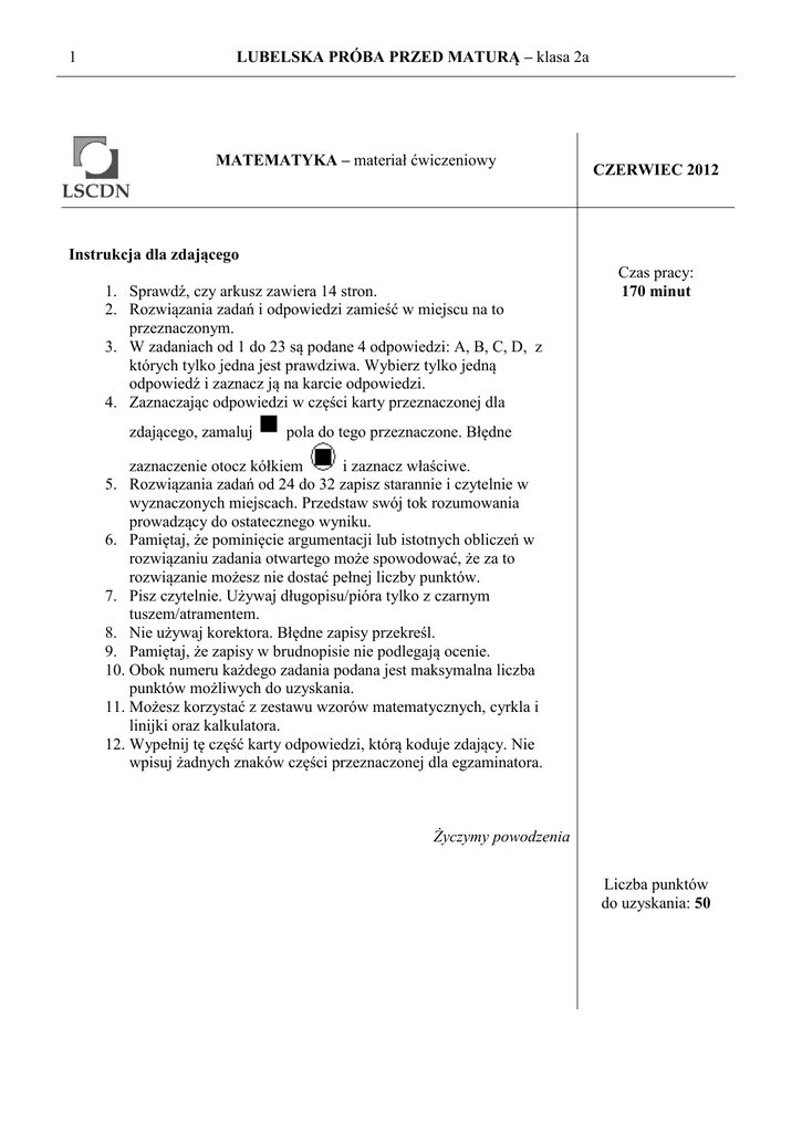 1 LUBELSKA PRÓBA PRZED MATURĄ – klasa 2a MATEMATYKA – materiał ćwiczeniowy CZERWIEC 2012 Instrukcja dla zdającego 1. Sprawdź, czy arkusz zawiera 14 stron. 2. Rozwiązania zadań i odpowiedzi zamieść w miejscu na to przeznaczonym. 3. W zadaniach od 1 do 23 są podane 4 odpowiedzi: A, B, C, D, z których tylko jedna jest prawdziwa. Wybierz tylko jedną odpowiedź i zaznacz ją na karcie odpowiedzi. 4. Zaznaczając odpowiedzi w części karty przeznaczonej dla zdającego, zamaluj Czas pracy: 170 minut pola do tego przeznaczone. Błędne zaznaczenie otocz kółkiem i zaznacz właściwe. 5. Rozwiązania zadań od 24 do 32 zapisz starannie i czytelnie w wyznaczonych miejscach. Przedstaw swój tok rozumowania prowadzący do ostatecznego wyniku. 6. Pamiętaj, że pominięcie argumentacji lub istotnych obliczeń w rozwiązaniu zadania otwartego może spowodować, że za to rozwiązanie możesz nie dostać pełnej liczby punktów. 7. Pisz czytelnie. Używaj długopisu/pióra tylko z czarnym tuszem/atramentem. 8. Nie używaj korektora. Błędne zapisy przekreśl. 9. Pamiętaj, że zapisy w brudnopisie nie podlegają ocenie. 10. Obok numeru każdego zadania podana jest maksymalna liczba punktów możliwych do uzyskania. 11. Możesz korzystać z zestawu wzorów matematycznych, cyrkla i linijki oraz kalkulatora. 12. Wypełnij tę część karty odpowiedzi, którą koduje zdający. Nie wpisuj żadnych znaków części przeznaczonej dla egzaminatora. Życzymy powodzenia Liczba punktów do uzyskania: 50 LUBELSKA PRÓBA PRZED MATURĄ – klasa 2a 2 ZADANIA ZAMKNIĘTE W zadaniach o numerach od 1 do 23 wybierz i zaznacz na karcie odpowiedzi jedną poprawną odpowiedź Zadanie 1. (1p) Dane są zbiory liczbowe A (10, 2 , B 2, 6 i C (0, 4 . Wynikiem działań B \ A C jest zbiór A. 6, 4 Zadanie 2. C. 10, 0 B. 0,4 D. 2, 4 (1p) 3 5(0,2 ) 2 5 1 wynosi Wartość wyrażenia 3,2 3 2 3 Zadanie 3. A. 3 2 B. C. 4 3 D. 5 2 1 27 2 : 9 2 Liczbą odwrotną do liczby a = jest 3 9 3 A. 3 1 3 B. 3 2 3 C. 3 1 3 D. 3 2 3 Zadanie 4. (1p) Jeden bok kwadratu o polu P zmniejszono o 30% a drugi zwiększono o 30%. Pole powstałego w ten sposób prostokąta jest równe A. B. 91%P 90%P C. 100%P D. 60%P Zadanie 5. (1p) Wartość liczbowa wyrażenia 2(log 4 2 2 log 4 2) jest równa A . 1,5 Zadanie 6. B. 2 C. 2,5 D. 3 C. 3 D. 4 C. x 4,1 D. x 1,5 (1p) Ile rozwiązań ma układ równań A. 1 y 3 0 ? 2 y ( x 1) 4 B. 2 Zadanie 7. (1p) Rozwiązaniem nierówności x 4 1 5 jest zbiór A . x 2,10 B. x 4,6 3 LUBELSKA PRÓBA PRZED MATURĄ – klasa 2a BRUDNOPIS 4 LUBELSKA PRÓBA PRZED MATURĄ – klasa 2a Zadanie 8. (1p) Zbiorem wartości funkcji y ( x 3)( x 3) określonej dla x 1, 4 jest przedział A . 8,7) C. 7, 8 B. 7,8) D. 3,3) Zadanie 9. (1p) Jeżeli proste k i l są równoległe (patrz rysunek), to długość odcinka x wynosi A. 9 B. 9 1 6 C. 9 1 3 D. 9 1 2 Zadanie10. (1p) Wskaż równanie prostej prostopadłej do prostej o równaniu 5x y 4 0 . A . 0,2 x y 4 0 Zadanie 11. (1p) Rozwiązaniem równania A. 1 B. 0,2 x y 1 0 C. 5x y 4 0 D. 0,5x y 1 0 1 6 x 2 x 9 jest liczba 2 2 B. -3 C. -1 D. 3 Zadanie 12. (1p) 20% pola okręgu o równaniu x 22 y 12 25 wynosi A. 25 B. 5 C. 5 Zadanie 13. (1p) Oś symetrii paraboli określonej wzorem y ( x 4)(6 x) ma następujące równanie A . x 4 B. y 1 C. x 1 D. 5 2 D. y 6 Zadanie 14. (1p) Funkcja liniowa określona wzorem f ( x) (k 2) x 3 jest malejąca jeśli A . k 2 B. k 2 C. k 2 D. k 2 Zadanie 15. (1p) Pole rombu o boku równym 13 cm i kącie rozwartym wynoszącym 150o wynosi A . 85 cm2 B. 84,5 cm2 C. 85,5 cm2 D. 169 cm2 Zadanie16. (1p) Długości boków trójkąta wychodzących z wierzchołka kąta ostrego wynoszą odpowiednio 2dm i 40cm. Jaką miarę ma kąt , jeśli pole tego trójkąta jest równe 2dm 2 ? A . 450 B. 30 0 C. 60 0 D. 750 5 LUBELSKA PRÓBA PRZED MATURĄ – klasa 2a BRUDNOPIS LUBELSKA PRÓBA PRZED MATURĄ – klasa 2a 6 Zadanie17. (1p) 2 sin 30 cos 60 wynosi Wartość liczbowa wyrażenia tg 30 A. 1 3 B. 3 C. 3 D. 3 3 Zadanie18. (1p) Jeżeli punkty A 2012,10 i B 12,210 są końcami odcinka AB , to środkiem tego odcinka jest punkt o współrzędnych A . 2000,200 B. 1000,100 C. 100,1000 D. 1000,100 Zadanie19. (1p) Proste o równaniach x y 2 0 i 2 x y 1 0 przecinają się w punkcie o współrzędnych A . 2,2 B. 2,1 C. 1,1 D. 2,2 Zadanie 20. (1p) Wierzchołek paraboli opisanej wzorem f ( x) ( x 6,6) 2 2012 należy do A . I ćwiartki układu współrzędnych B. II ćwiartki układu współrzędnych C. III ćwiartki układu współrzędnych D. IV ćwiartki układu współrzędnych Zadanie 21. (1p) Miejscem zerowym wielomianu W ( x) x 3 2 x 2 5x 6 nie jest liczba B. 1 A . -2 C. 4 D. 3 Zadanie 22. (1p) Kąt ABC (patrz rysunek) ma miarę A. 40o B. 50o C. 60o D. 70o Zadanie 23. (1p) 1 Dla jakiej wartości parametru c, miejscem zerowym funkcji f ( x) 2 x c jest liczba ? 2 A. -2 B. -1 C. 1 D. 2 7 LUBELSKA PRÓBA PRZED MATURĄ – klasa 2a BRUDNOPIS LUBELSKA PRÓBA PRZED MATURĄ – klasa 2a 8 ZADANIA OTWARTE Zadania o numerach od 24 do 32 należy zapisać w wyznaczonych miejscach pod treścią zadania Zadanie 24. (2p) Na kwadracie ABCD opisano okrąg o promieniu r =3 cm. Oblicz pole zacieniowanej figury. Wynik podaj z dokładnością do 0,01. Odpowiedź ……………………………………………………………………………………………… Zadanie 25. (2p) Rozwiąż nierówność x 2 10 8 x 2 Odpowiedź ……………………………………………………………………………………………… 9 LUBELSKA PRÓBA PRZED MATURĄ – klasa 2a Zadanie 26. (2p) Lina o długości 16 m podtrzymuje maszt. Na jakiej wysokości jest umocowana lina, jeżeli jej kąt nachylenia do powierzchni ziemi wynosi 60o? Zadanie 27. (2p) Wykaż, że różnica kwadratów dwóch kolejnych liczb nieparzystych jest podzielna przez 8. Zadanie 28. (2p) W równoległoboku wpisano dwa przystające okręgi styczne zewnętrznie do siebie (patrz rysunek). Wykaż, że średnica każdego z t