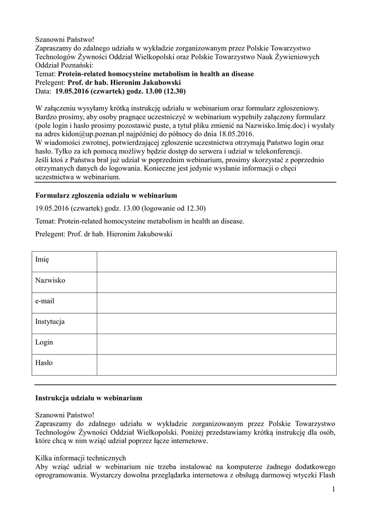 Szanowni Państwo! Zapraszamy do zdalnego udziału w wykładzie zorganizowanym przez Polskie Towarzystwo Technologów Żywności Oddział Wielkopolski oraz Polskie Towarzystwo Nauk Żywieniowych Oddział Poznański: Temat: Protein-related homocysteine metabolism in health an disease Prelegent: Prof. dr hab. Hieronim Jakubowski Data: 19.05.2016 (czwartek) godz. 13.00 (12.30) W załączeniu wysyłamy krótką instrukcję udziału w webinarium oraz formularz zgłoszeniowy. Bardzo prosimy, aby osoby pragnące uczestniczyć w webinarium wypełniły załączony formularz (pole login i hasło prosimy pozostawić puste, a tytuł pliku zmienić na Nazwisko.Imię.doc) i wysłały na adres [email protected] najpóźniej do północy do dnia 18.05.2016. W wiadomości zwrotnej, potwierdzającej zgłoszenie uczestnictwa otrzymają Państwo login oraz hasło. Tylko za ich pomocą możliwy będzie dostęp do serwera i udział w telekonferencji. Jeśli ktoś z Państwa brał już udział w poprzednim webinarium, prosimy skorzystać z poprzednio otrzymanych danych do logowania. Konieczne jest jedynie wysłanie informacji o chęci uczestnictwa w webinarium. Formularz zgłoszenia udziału w webinarium 19.05.2016 (czwartek) godz. 13.00 (logowanie od 12.30) Temat: Protein-related homocysteine metabolism in health an disease. Prelegent: Prof. dr hab. Hieronim Jakubowski Imię Nazwisko e-mail Instytucja Login Hasło Instrukcja udziału w webinarium Szanowni Państwo! Zapraszamy do zdalnego udziału w wykładzie zorganizowanym przez Polskie Towarzystwo Technologów Żywności Oddział Wielkopolski. Poniżej przedstawiamy krótką instrukcję dla osób, które chcą w nim wziąć udział poprzez łącze internetowe. Kilka informacji technicznych Aby wziąć udział w webinarium nie trzeba instalować na komputerze żadnego dodatkowego oprogramowania. Wystarczy dowolna przeglądarka internetowa z obsługą darmowej wtyczki Flash 1 player. Oczywiście, aby czynnie uczestniczyć w webinarium konieczne jest posiadanie mikrofonu oraz kamery internetowej (większość przenośnych komputerów jest wyposażona fabrycznie w tego typu akcesoria) oraz dostęp do Internetu o minimalnej przepustowości łącza 512 kB/s. Dodatkowo ważny jest również czas opóźnienia tzw. latency. Dla sprawnego działania maksymalna wartość opóźnienia nie powinna przekroczyć 75 ms. Zalecane jest korzystanie z łącza stałego, która posiada zwykle odpowiednie parametry. Radzimy unikać połączenia komórkowego, które zwykle ze względu na znaczne czasy opóźnienia może nie być odpowiednie. Korzystanie z interfejsu programu jest dość proste i podobne do przeglądania stron internetowych, więc nie powinno sprawić Państwu kłopotów. Prosimy również o pewną wyrozumiałość. Jak w wielu sprawach technicznych i informatycznych mogą pojawić się problemy lub zakłócenia, których nie będziemy w stanie naprawić. Oczywiście dołożymy wszelkich starań, aby problemów tych było jak najmniej. W przypadku pytań lub wątpliwości pomocą służy Dr inż. Marcin Kidoń (tel. 61 8487311; 608560855; e-mail [email protected]). Przed rozpoczęciem webinarium Bardzo prosimy, aby osoby zainteresowane udziałem w webinarium zgłosiły chęć uczestnictwa, wypełniając załączony formularz i wysyłając mailowo na adres [email protected] do dnia 25.02.2016. W wiadomości zwrotnej, potwierdzającej zgłoszenie uczestnictwa otrzymają Państwo login oraz hasło. Tylko za ich pomocą możliwy będzie dostęp do serwera i udział w telekonferencji. Ze względów bezpieczeństwa logowanie do webinarium będzie możliwe najwcześniej na 30 minut przed rozpoczęciem wykładu. Prosimy zalogować się w tym czasie, aby przetestować działanie sprzętu i rozwiązać ewentualne problemy przed rozpoczęciem webinarium. Osoby, które już posiadają nadany login oraz hasło (uczestniczyły we wcześniej organizowanym webinarium) prosimy nie wysyłać formularza, tylko zalogować się za pomocą posiadanych danych. Logowanie do systemu webinarium i udział Wchodzimy na stronę http://150.254.205.110:5080/openmeetings Wpisujemy dane logowania: użytkownik i hasło. W lewym górnym rogu klikamy zakładkę „Rooms”. Po rozwinięciu się listy wybieramy pozycję „Public Rooms”, aby rozwinąć listę dostępnych „pokoi konferencyjnych”. Dołączamy do pokoju „Webinarium PTTŻ” klikając „enter”. Kończymy udział w obradach klikając przycisk „EXIT” w prawym górnym rogu ekranu, a następnie wylogowujemy klikając „Logout” w prawym górnym rogu ekranu. Nadawanie obrazu i dźwięku z własnego komputera Domyślnie w celu sprawnego przebiegu konferencji uczestnicy otrzymują bierny dostęp (mogą tylko obserwować i słuchać wykładu, a sami nie mogą nadawać). Udzielać głosu i zezwalać na będzie osoba zarządzająca webinarium tzw. moderator (w przypadku naszego wykładu, będzie to głównie wymieniony już powyżej Dr inż. Marcin Kidoń). Może on udzielić głosu na prośbę uczestnika. Komunikować się oraz prosić o udzielenie głosu można pisząc w okienku na tzw. czacie. Rozpoczęcie nadawania obrazu i dźwięku: Klikamy ikonę „mikrofon + kamera” mieszczącą się w lewym górnym rogu na panelu 2 Użytkownika. Moderator podejmuje decyzję o zezwoleniu lub odmowie nadawania. Po otrzymaniu zgody pojawi się okno wyboru urządzeń audio i wideo oraz zapytanie użytkownika komputera o zgodę ich użycia. Należy kliknąć opcję „zezwól”. Jeśli komputer jest wyposażony w urządzenia audio i wideo (większość laptopów) pola wyboru urządzeń wypełnią się samoczynnie. Aby zapewnić odpowiednią jakość obrazu należy tylko ustawić pole „Cam resolution” wybierając 320x240 [HVGA 4:3 (~56 KByte/sec)], resztę ustawień pozostawiamy bez zmian. Mamy nadzieję, że powyższe opracowanie ułatwi Państwu posługiwanie się programem i udział w webinarium. Wszelkie pytania, uwagi i sugestie dot