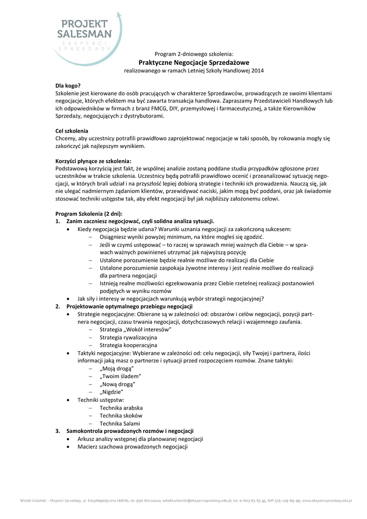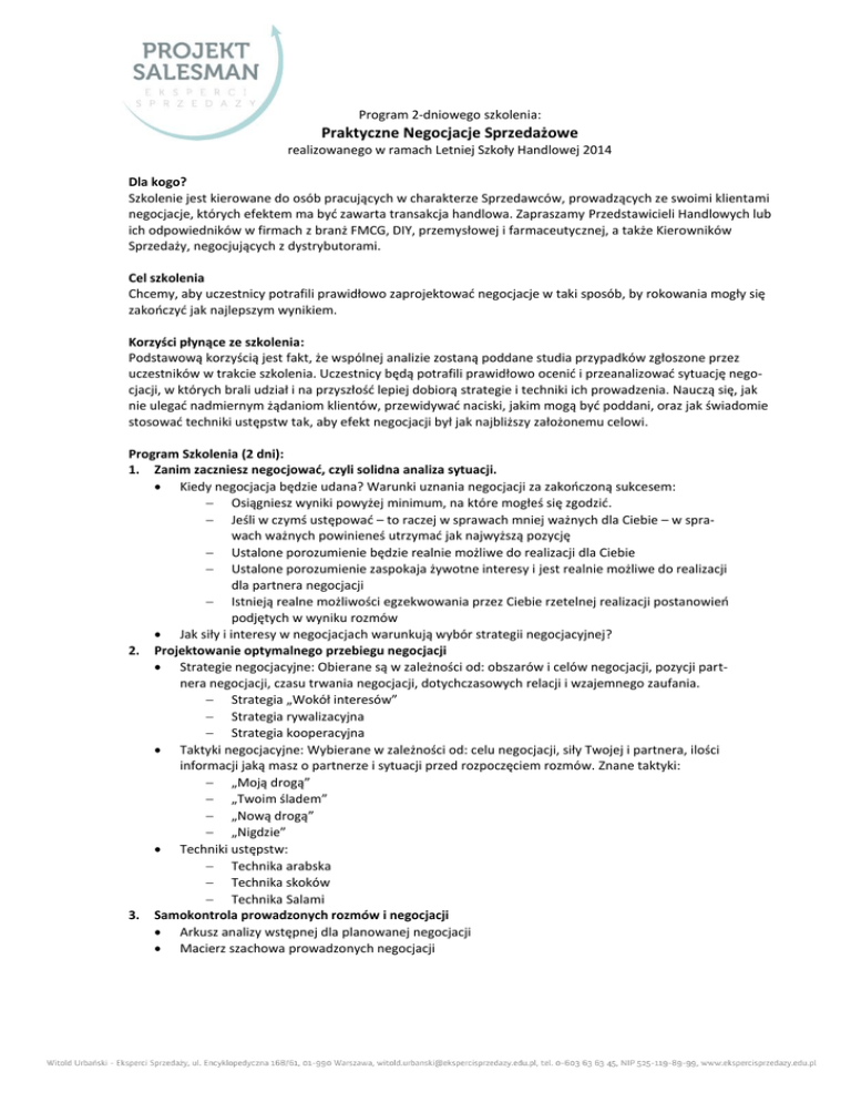 Program 2-dniowego szkolenia: Praktyczne Negocjacje Sprzedażowe realizowanego w ramach Letniej Szkoły Handlowej 2014 Dla kogo? Szkolenie jest kierowane do osób pracujących w charakterze Sprzedawców, prowadzących ze swoimi klientami negocjacje, których efektem ma być zawarta transakcja handlowa. Zapraszamy Przedstawicieli Handlowych lub ich odpowiedników w firmach z branż FMCG, DIY, przemysłowej i farmaceutycznej, a także Kierowników Sprzedaży, negocjujących z dystrybutorami. Cel szkolenia Chcemy, aby uczestnicy potrafili prawidłowo zaprojektować negocjacje w taki sposób, by rokowania mogły się zakończyć jak najlepszym wynikiem. Korzyści płynące ze szkolenia: Podstawową korzyścią jest fakt, że wspólnej analizie zostaną poddane studia przypadków zgłoszone przez uczestników w trakcie szkolenia. Uczestnicy będą potrafili prawidłowo ocenić i przeanalizować sytuację negocjacji, w których brali udział i na przyszłość lepiej dobiorą strategie i techniki ich prowadzenia. Nauczą się, jak nie ulegać nadmiernym żądaniom klientów, przewidywać naciski, jakim mogą być poddani, oraz jak świadomie stosować techniki ustępstw tak, aby efekt negocjacji był jak najbliższy założonemu celowi. Program Szkolenia (2 dni): 1. Zanim zaczniesz negocjować, czyli solidna analiza sytuacji. Kiedy negocjacja będzie udana? Warunki uznania negocjacji za zakończoną sukcesem: Osiągniesz wyniki powyżej minimum, na które mogłeś się zgodzić. Jeśli w czymś ustępować – to raczej w sprawach mniej ważnych dla Ciebie – w sprawach ważnych powinieneś utrzymać jak najwyższą pozycję Ustalone porozumienie będzie realnie możliwe do realizacji dla Ciebie Ustalone porozumienie zaspokaja żywotne interesy i jest realnie możliwe do realizacji dla partnera negocjacji Istnieją realne możliwości egzekwowania przez Ciebie rzetelnej realizacji postanowień podjętych w wyniku rozmów Jak siły i interesy w negocjacjach warunkują wybór strategii negocjacyjnej? 2. Projektowanie optymalnego przebiegu negocjacji Strategie negocjacyjne: Obierane są w zależności od: obszarów i celów negocjacji, pozycji partnera negocjacji, czasu trwania negocjacji, dotychczasowych relacji i wzajemnego zaufania. Strategia „Wokół interesów” Strategia rywalizacyjna Strategia kooperacyjna Taktyki negocjacyjne: Wybierane w zależności od: celu negocjacji, siły Twojej i partnera, ilości informacji jaką masz o partnerze i sytuacji przed rozpoczęciem rozmów. Znane taktyki: „Moją drogą” „Twoim śladem” „Nową drogą” „Nigdzie” Techniki ustępstw: Technika arabska Technika skoków Technika Salami 3. Samokontrola prowadzonych rozmów i negocjacji Arkusz analizy wstępnej dla planowanej negocjacji Macierz szachowa prowadzonych negocjacji 4. Manipulacje, naciski, naciski, manipulacje… - czyli jak radzić sobie z presją ze strony partnera negocjacji? Najważniejsze metody manipulacji, jakie mogą stosować partnerzy w negocjacjach 6 reguł wywierania wpływu wg. Caldiniego Metodyka radzenia sobie z próbami presji i manipulacji ze strony partnerów Dostarczenie narzędzi pozwalających na przewidywanie nacisków, jakimi może być poddana osoba Ćwiczenie – rozpoznawanie metod manipulacji, stosowanych w rozmowach (na podstawie dostarczonych materiałów) Ćwiczenie – próba zastosowania w praktyce sposobów na neutralizację technik manipulacyjnych Forma realizacji szkolenia: Szkolenie 2-dniowe, prowadzone jest techniką warsztatową, opartą na formule aktywnego udziału uczestników. Uczestnicy uczą się na realnych przykładach, jak zaplanować negocjacje, które później będą nadawać się do realizacji.