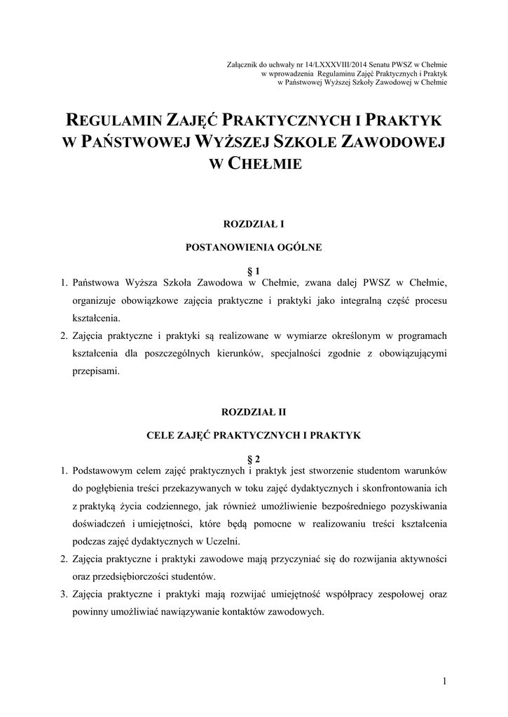 Załącznik do uchwały nr 14/LXXXVIII/2014 Senatu PWSZ w Chełmie w wprowadzenia Regulaminu Zajęć Praktycznych i Praktyk w Państwowej Wyższej Szkoły Zawodowej w Chełmie REGULAMIN ZAJĘĆ PRAKTYCZNYCH I PRAKTYK W PAŃSTWOWEJ WYŻSZEJ SZKOLE ZAWODOWEJ W CHEŁMIE ROZDZIAŁ I POSTANOWIENIA OGÓLNE §1 1. Państwowa Wyższa Szkoła Zawodowa w Chełmie, zwana dalej PWSZ w Chełmie, organizuje obowiązkowe zajęcia praktyczne i praktyki jako integralną część procesu kształcenia. 2. Zajęcia praktyczne i praktyki są realizowane w wymiarze określonym w programach kształcenia dla poszczególnych kierunków, specjalności zgodnie z obowiązującymi przepisami. ROZDZIAŁ II CELE ZAJĘĆ PRAKTYCZNYCH I PRAKTYK §2 1. Podstawowym celem zajęć praktycznych i praktyk jest stworzenie studentom warunków do pogłębienia treści przekazywanych w toku zajęć dydaktycznych i skonfrontowania ich z praktyką życia codziennego, jak również umożliwienie bezpośredniego pozyskiwania doświadczeń i umiejętności, które będą pomocne w realizowaniu treści kształcenia podczas zajęć dydaktycznych w Uczelni. 2. Zajęcia praktyczne i praktyki zawodowe mają przyczyniać się do rozwijania aktywności oraz przedsiębiorczości studentów. 3. Zajęcia praktyczne i praktyki mają rozwijać umiejętność współpracy zespołowej oraz powinny umożliwiać nawiązywanie kontaktów zawodowych. 1 4. Szczegółowe cele, zadania i zakres zajęć praktycznych i praktyki określają szczegółowe programy i sylabusy przedmiotowe w obrębie poszczególnych kierunków, specjalności kształcenia w PWSZ w Chełmie. ROZDZIAŁ III ORGANIZACJA ZAJĘĆ PRAKTYCZNYCH I PRAKTYK §3 1. Zajęcia praktyczne i praktyki mogą odbywać się w jednostkach gospodarczych, instytucjach publicznych, instytucjach naukowo-badawczych, instytucjach oświatowych, placówkach kultury lub w ramach zorganizowanej przez Uczelnię działalności, pozwalającej osiągnąć założone cele i efekty kształcenia. 2. PWSZ w Chełmie, zgodnie z Regulaminem studiów, określa w planie studiów czas trwania zajęć praktycznych i praktyk. §4 Nadzór nad organizacją i koordynacją zajęć praktycznych i praktyk w PWSZ w Chełmie sprawuje Kierownik Działu Praktyk Studenckich. §5 Dyrektor Instytutu, po zasięgnięciu opinii samorządu studenckiego, powołuje w Instytucie co najmniej jednego opiekuna zajęć praktycznych i praktyk. 1. §6 Warunkiem przystąpienia studenta do zajęć praktycznych i praktyki w obrębie danego kierunku, specjalności studiów jest posiadanie: a) ubezpieczenia NNW oraz OC (OC w przypadku kierunków studiów na którym jest wymagane); b) szczepień ochronnych zgodnie z aktualnie obowiązującymi dla kierunku wymogami w zakresie programu szczepień; c) aktualnej książeczki zdrowia dla celów sanitarno-epidemiologicznych, w zależności od kierunku; d) wskazanej, niezbędnej odzieży ochronnej. 2. Studenci uczestniczą w zajęciach praktycznych i praktykach w terminach wynikających z rozkładów zajęć dla poszczególnych kierunków, specjalności kształcenia w trakcie okresu zajęć dydaktycznych oraz w okresie przerwy wakacyjnej lub międzysemestralnej. 2 3. Szczegółowe terminy realizacji zajęć praktycznych i praktyk dla poszczególnych kierunków, specjalności kształcenia ustalają Dyrektorzy Instytutów. §7 Studenci studiów niestacjonarnych są zobowiązani do uczestnictwa w zajęciach praktycznych i praktyce zawodowej w pełnym wymiarze godzin obowiązujących na studiach stacjonarnych. §8 W czasie realizacji zajęć praktycznych i praktyki, student podlega przepisom i regulaminom obowiązującym w miejscu praktyki. §9 Student jest zobowiązany dopilnować wszelkich formalności związanych z organizacją zajęć praktycznych i praktyk w terminach określonych przez opiekunów praktyk zawodowych. ROZDZIAŁ IV RODZAJE I FORMY ZAJĘĆ PRAKTYCZNYCH I PRAKTYK § 10 Rodzaje i formy zajęć praktycznych oraz praktyk określają Dyrektorzy Instytutów. ROZDZIAŁ V WARUNKI ZALICZENIA ZAJĘĆ PRAKTYCZNYCH I PRAKTYKI § 11 1. Zajęcia praktyczne i praktyki winny być zrealizowane i zaliczone przed końcem semestru, dla którego program kształcenia przewiduje realizację określonych praktyk. 2. Zaliczenie zajęć praktycznych i praktyk jest warunkiem zaliczenia semestru, w ramach którego powyższe winny być zrealizowane. 3. Zaliczenia zajęć praktycznych i praktyki dokonuje opiekun praktyk lub wskazany nauczyciel akademicki. § 12 Warunkiem zaliczenia zajęć praktycznych i praktyki jest zrealizowanie programu zawartego w sylabusie oraz przedłożenie przez studenta stosownej dokumentacji, do której zalicza się: 1) sprawozdanie z realizacji zajęć praktycznych lub praktyki zawierające: a) datę rozpoczęcia praktyki, b) datę zakończenia praktyki, 3 c) nazwę zakładu pracy lub innego podmiotu, w którym student odbywał zajęcia praktyczne lub praktykę, d) wykaz powierzonych obowiązków, pełnionych funkcji, scenariusz przedsięwzięcia, w którym określa się termin, miejsce, czas i formy realizacji poszczególnych działań w obrębie zajęć praktycznych bądź praktyki, e) opis uzyskanych efektów poznawczych, moralnych, samokształceniowych, społecznych i materialnych; f) opinię zakładowego lub szkolnego opiekuna zajęć praktycznych czy też praktyki. 2) ankietę zawierającą ocenę opiekuna i samoocenę studenta. § 13 Opiekun zajęć praktycznych i praktyk zawodowych może ustalić dodatkowe kryteria zaliczenia praktyki. § 14 Formalnym wyrazem zaliczenia zajęć praktycznych i praktyki jest dokonanie wpisu w indeksie wraz z oceną oraz odpowiednią liczbą punktów ECTS przez opiekuna. Przy zaliczaniu stosuje się następującą skalę ocen: bardzo dobry 5,0 dobry plus 4,5 dobry 4,0 dostateczny plus 3,5 dostateczny 3,0 niedostateczny 2,0 Uzyskanie przez studenta oceny niedostatecznej (2,0) oznacza niezaliczenie zajęć praktycznych lub praktyki. Brak oceny jest równoznaczny 