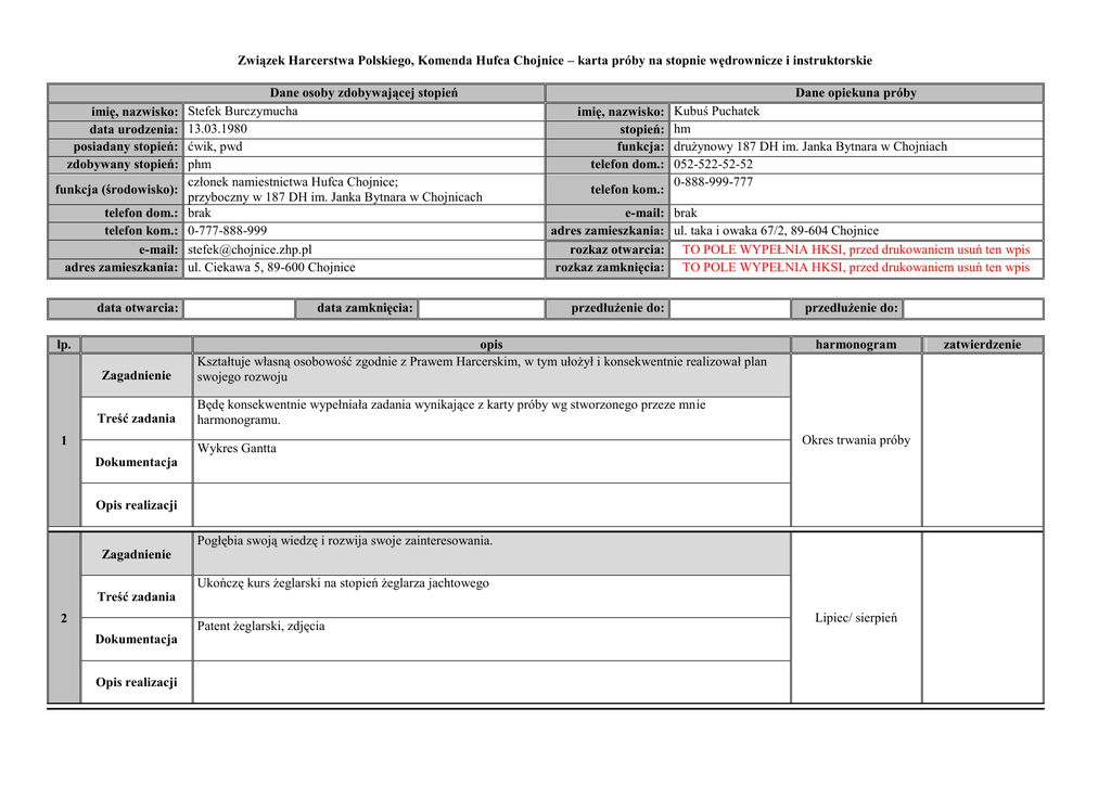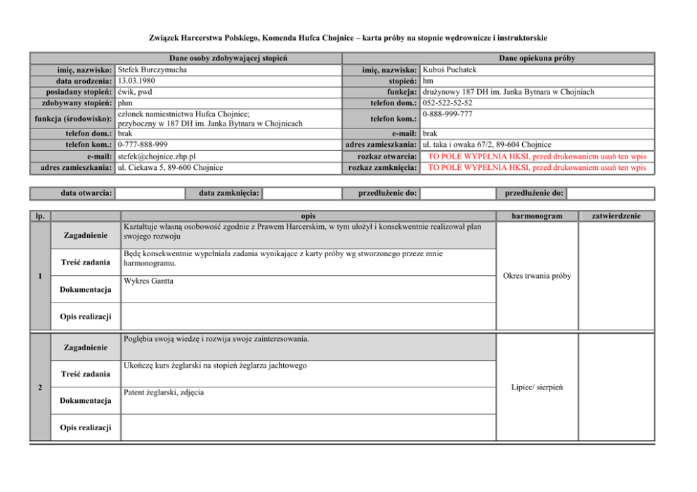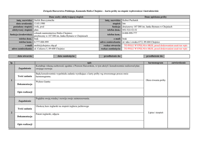 Związek Harcerstwa Polskiego, Komenda Hufca Chojnice – karta próby na stopnie wędrownicze i instruktorskie imię, nazwisko: data urodzenia: posiadany stopień: zdobywany stopień: funkcja (środowisko): telefon dom.: telefon kom.: e-mail: adres zamieszkania: Dane osoby zdobywającej stopień Stefek Burczymucha 13.03.1980 ćwik, pwd phm członek namiestnictwa Hufca Chojnice; przyboczny w 187 DH im. Janka Bytnara w Chojnicach brak 0-777-888-999 [email protected] ul. Ciekawa 5, 89-600 Chojnice data zamknięcia: data otwarcia: lp. Zagadnienie Treść zadania 1 imię, nazwisko: stopień: funkcja: telefon dom.: telefon kom.: Dane opiekuna próby Kubuś Puchatek hm drużynowy 187 DH im. Janka Bytnara w Chojniach 052-522-52-52 0-888-999-777 e-mail: brak adres zamieszkania: ul. taka i owaka 67/2, 89-604 Chojnice rozkaz otwarcia: TO POLE WYPEŁNIA HKSI, przed drukowaniem usuń ten wpis rozkaz zamknięcia: TO POLE WYPEŁNIA HKSI, przed drukowaniem usuń ten wpis przedłużenie do: opis Kształtuje własną osobowość zgodnie z Prawem Harcerskim, w tym ułożył i konsekwentnie realizował plan swojego rozwoju przedłużenie do: harmonogram Będę konsekwentnie wypełniała zadania wynikające z karty próby wg stworzonego przeze mnie harmonogramu. Wykres Gantta Okres trwania próby Dokumentacja Opis realizacji Pogłębia swoją wiedzę i rozwija swoje zainteresowania. Zagadnienie Treść zadania 2 Ukończę kurs żeglarski na stopień żeglarza jachtowego Patent żeglarski, zdjęcia Dokumentacja Opis realizacji Lipiec/ sierpień zatwierdzenie lp. Zagadnienie 3 Treść zadania Dokumentacja opis Zachowuje właściwe proporcje w wypełnianiu obowiązków wynikających z przynależności do różnych grup społecznych (rodzina, szkoła, drużyna, środowisko zawodowe). Realizację zadań na stopień przewodnika zaplanuję sobie w taki sposób, by nie kolidowało mi to w wypełnianiu obowiązków szkolnych i domowych. Świadectwo szkolne, opinia rodzica. harmonogram Okres trwania próby Opis realizacji 4 5 Zagadnienie Treść zadania Dokumentacja Opis realizacji Ukończył kurs przewodnikowski Ukończę kurs przewodnikowski. Dyplom ukończenia kursu przewodnikowskiego Zagadnienie Treść zadania Dokumentacja Podejmuje stałą służbę w swoim harcerskim środowisku Będę pełnił funkcje przybocznego w mojej drużynie. Opinia drużynowego, opis zrealizowanych zadań. Czerwiec/ lipiec Okres trwania próby Opis realizacji 6 Zagadnienie Treść zadania Dokumentacja Opis realizacji Zagadnienie 7 Treść zadania Dokumentacja Opis realizacji 8 Zagadnienie Bierze udział w życiu hufca. Zorganizuje przekazanie Betlejemskiego Światła Pokoju w Chojnicach dla harcerzy i mieszkańców miasta. Konspekt, zdjęcia W trakcie minimum półrocznej praktyki w gromadzie/drużynie wykazał się umiejętnością pracy wychowawczej z dziećmi lub młodzieżą w wybranej grupie wiekowej, w tym umiejętnościami: stosowania instrumentów metodycznych, stosowania systemu małych grup, tworzenia planu pracy, jego realizacji i podsumowania, oraz uczestniczył w: organizacji wyjazdowych form pracy, pozyskiwaniu środków na działalność drużyny/gromady, organizacji obozu (kolonii) lub zimowiska drużyny/gromady i pełnił na nim funkcje, prowadzeniu dokumentacji niezbędnej do działania drużyny/gromady, współpracy ze środowiskiem działania – rodzicami, szkołą, itp. Wezmę udział w organizacji „Hufcowego Harcowania- 100 lat istnienia”. Będę pełnił funkcję programowca podczas trwania rajdu. Konspekt, materiały programowe, zdjęcia, opinia komendanta rajdu Korzysta z harcerskiej literatury i mediów. Grudzień wrzesień Okres trwania próby zatwierdzenie lp. Treść zadania Dokumentacja Opis realizacji opis Będę pełnił funkcję sekretarza (książka finansowa i książka pracy drużyny, zgody na wyjazdy) w mojej drużynie. Opinia drużynowego, opis zrealizowanych zadań. Warunki zamknięcia próby: lp opis wymagania 1 Osiągnięcie poziomu opisanego w idei stopnia i zrealizowanie wymagań próby. 2 Przestrzeganie przepisów dotyczących zasad bezpieczeństwa w pracy z dziećmi i młodzieżą. 3 Posiadanie wiedzy i umiejętności na poziomie stopnia harcerka orla – harcerz orli. 4 Ukończenie minimum 15-godzinnego kursu pierwszej pomocy. 5 Pozytywnie oceniona praca w okresie realizacji próby. sposób i termin realizacji: harmonogram zatwierdzenie zatwierdzenie Diagram Gantta1: (jest to przykładowe wypełnienie – wypełnij po swojemu) styczeń luty marzec kwiecień maj czerwiec lipiec sierpień wrzesień październik listopad grudzień zadanie 01 zadanie 02 zadanie 03 zadanie 04 zadanie 05 zadanie 06 zadanie 07 zadanie 08 Może być tak, że w niektóre zadania będziesz zaangażowany/a przez cały czas trwania próby, a w inne tylko przez jakiś okres trwania próby. Diagram Gantta ma na celu ułatwienie Ci planowania realizacji zadań, by nie było tak, że w jednym czasie wszystko Ci się kumuluje. Dzięki takiemu diagramowi w graficzny sposób obrazujesz swoje „obciążenie” pracą Zadanie bardzo absorbujące 1 Zadanie średnio absorbujące Zadanie lekko absorbujące Diagram Gantta to graf stosowany głównie w zarządzaniu projektami. Uwzględnia się w nim podział projektu na poszczególne zadania, oraz rozplanowanie ich w czasie. Pierwsze narzędzie tego typu stworzył Karol Adamiecki już w 1896 roku, jednak nie opublikował go aż do roku 1931. Nazwa diagramów pochodzi od nazwiska Henry'ego Gantta, który opracował je w 1910 roku dla fabryki Bethlehem Steel System Zadań i Premii (The Task and Bonus System) i w tym samym czasie opublikował w „Engineering Magazine”. System ten stworzył podstawy nowoczesnego zarządzania projektami, wnosząc m.in. metodę tworzenia diagramów Gantta, pozwalających na prezentacje wykresów ukazujących harmonogram zadań w projekcie.