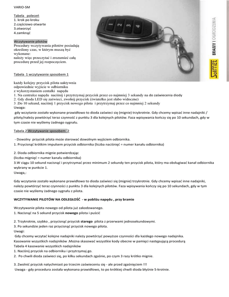 VARIO-SM Tabela poleceń 1. krok po kroku 2.częściowo otwarte 3.otworzyć 4.zamknąć Wczytywanie pilotów Procedury wczytywania pilotów posiadają określony czas, w którym muszą być wykonane: należy więc przeczytać i zrozumieć całą procedurę przed jej rozpoczęciem. Tabela 1 wczytywanie sposobem 1 każdy kolejny przycisk pilota uaktywnia odpowiednie wyjście w odbiorniku z wykorzystaniem centalki napędu 1. Na centralce napędu naciśnij i przytrzymaj przycisk przez co najmniej 3 sekundy na do zaświecenia diody 2. Gdy dioda LED się zaświeci, zwolnij przycisk (światełko jest słabo widoczne) 3 .Do 10 sekund, naciśnij 1 przycisk nowego pilota i przytrzymaj przez co najmniej 2 sekundy Uwaga: gdy wczytanie zostało wykonane prawidłowo to dioda zaświeci się (mignie) trzykrotnie. Gdy chcemy wpisać inne nadajniki / piloty/należy powtórzyć teraz czynność z punktu 3 dla kolejnych pilotów. Faza wpisywania kończy się po 10 sekundach, gdy w tym czasie nie wyślemy żadnego sygnału. Tabela 2 Wczytywanie sposobem 2 - Dowolny przycisk pilota może sterować dowolnym wyjściem odbiornika. 1. Przycisnąć krótkim impulsem przycisk odbiornika (liczba naciśnięć = numer kanału odbiornika) 2. Dioda odbiornika mignie potwierdzając (liczba mignięć = numer kanału odbiornika) 3.W ciągu 10 sekund nacisnąć i przytrzymać przez minimum 2 sekundy ten przycisk pilota, który ma obsługiwać kanał odbiornika wybrany w punkcie 1. Uwaga,: Gdy wczytanie zostało wykonane prawidłowo to dioda zaświeci się (mignie) trzykrotnie. Gdy chcemy wpisać inne nadajniki, należy powtórzyć teraz czynności z punktu 3 dla kolejnych pilotów. Faza wpisywania kończy się po 10 sekundach, gdy w tym czasie nie wyślemy żadnego sygnału z pilota. WCZYTYWANIE PILOTÓW NA ODLEGŁOŚĆ - w pobliżu napędu , przy bramie Wczytywanie pilota nowego od pilota już zakodowanego. 1. Nacisnąć na 5 sekund przycisk nowego pilota i puścić 2. Trzykrotnie, szybko , przycisnąć przycisk starego pilota z przerwami jednosekundowymi. 3. Po sekundzie jeden raz przycisnąć przycisk nowego pilota. Uwagi: Gdy chcemy wczytać kolejne nadajniki należy powtórzyć powyższe czynności dla każdego nowego nadajnika. Kasowanie wszystkich nadajników .Można skasować wszystkie kody obecne w pamięci następującą procedurą Tabela 4 kasowanie wszystkich nadajników 1. Naciśnij przycisk na odbiorniku i przytrzymaj go. 2. Po chwili dioda zaświeci się, po kilku sekundach zgaśnie, po czym 3 razy krótko mignie. 3. Zwolnić przycisk natychmiast po trzecim zaświeceniu się - ale przed zgaśnięciem !!! Uwaga - gdy procedura została wykonana prawidłowo, to po krótkiej chwili dioda błyśnie 5-krotnie.